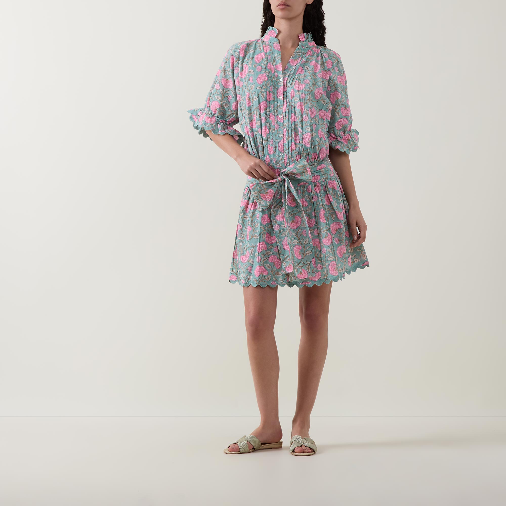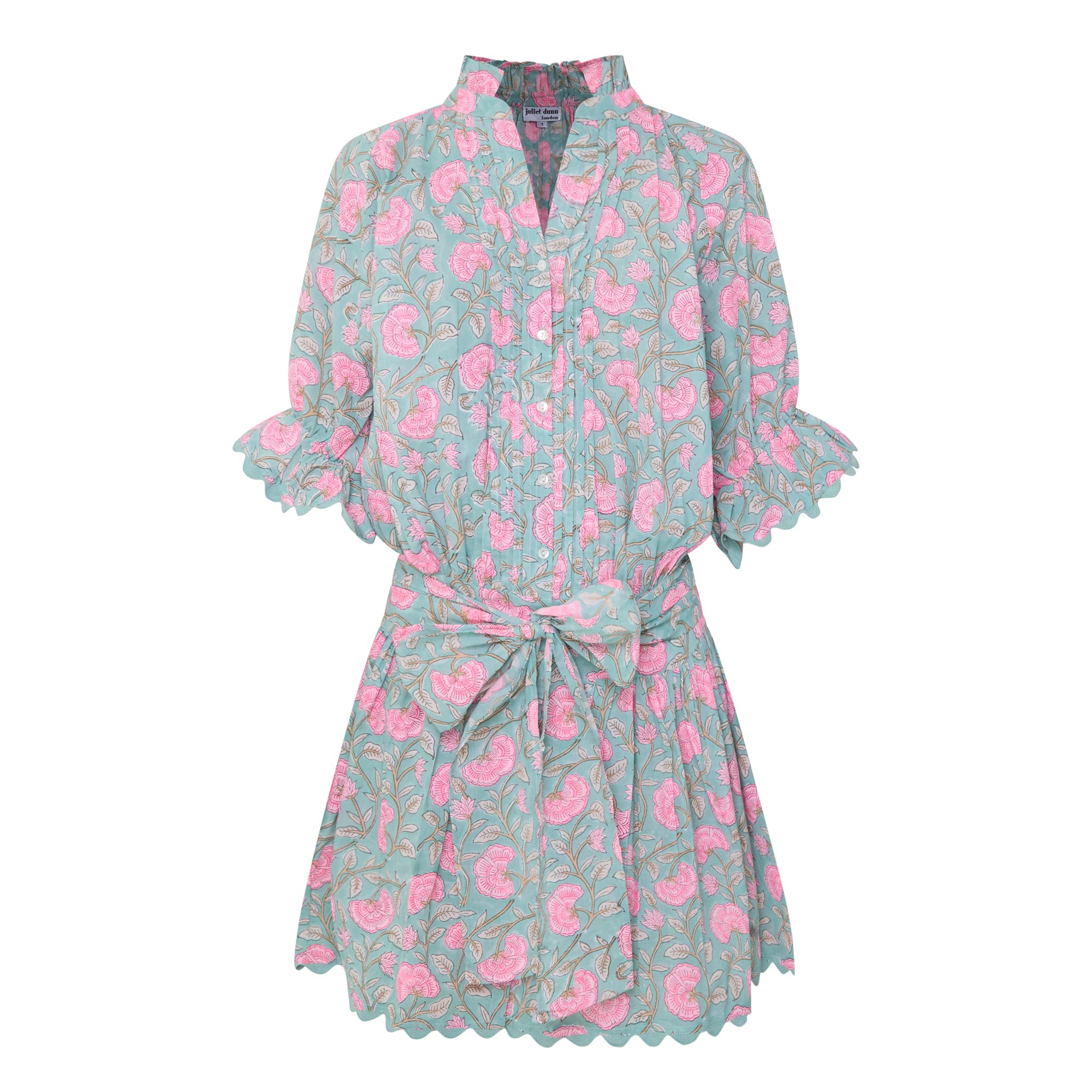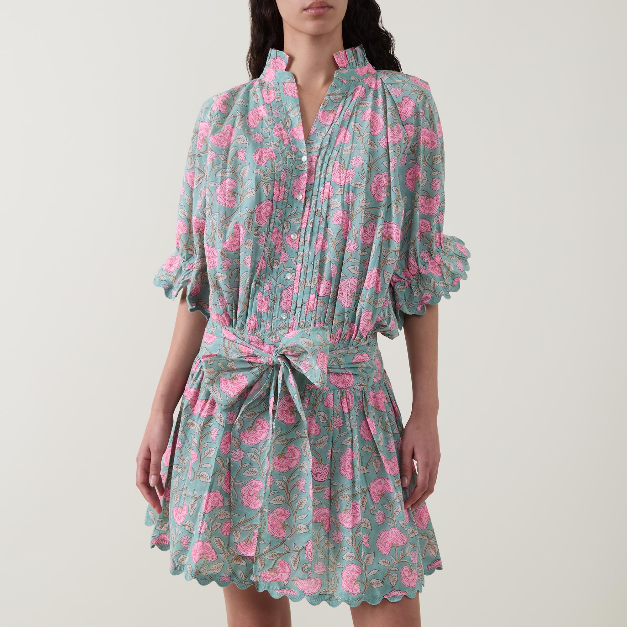 - Frill collar, half-button fastening, elbow-length sleeves, flared cuffs, adjustable waist-tie, scalloped edging, mini length, embroidered details, floral print