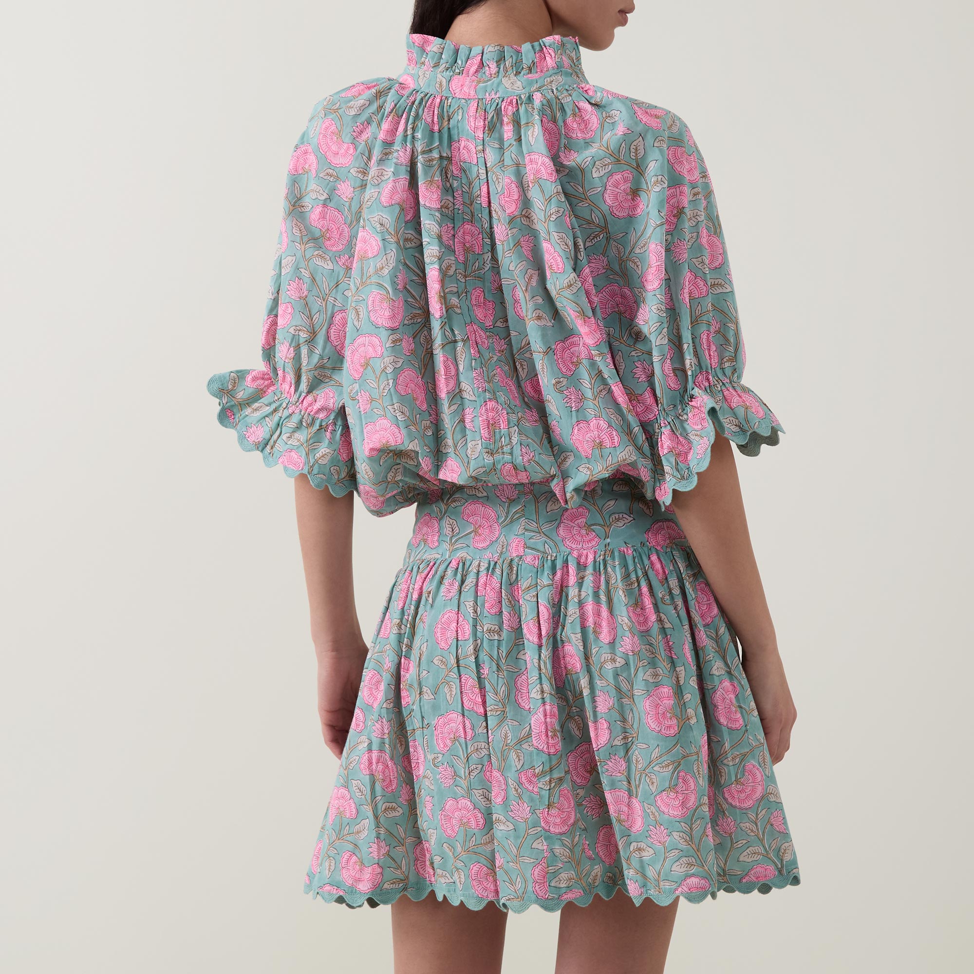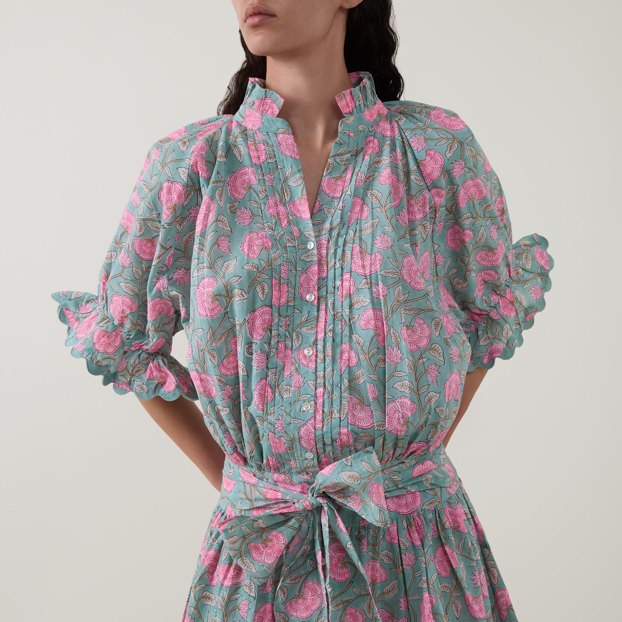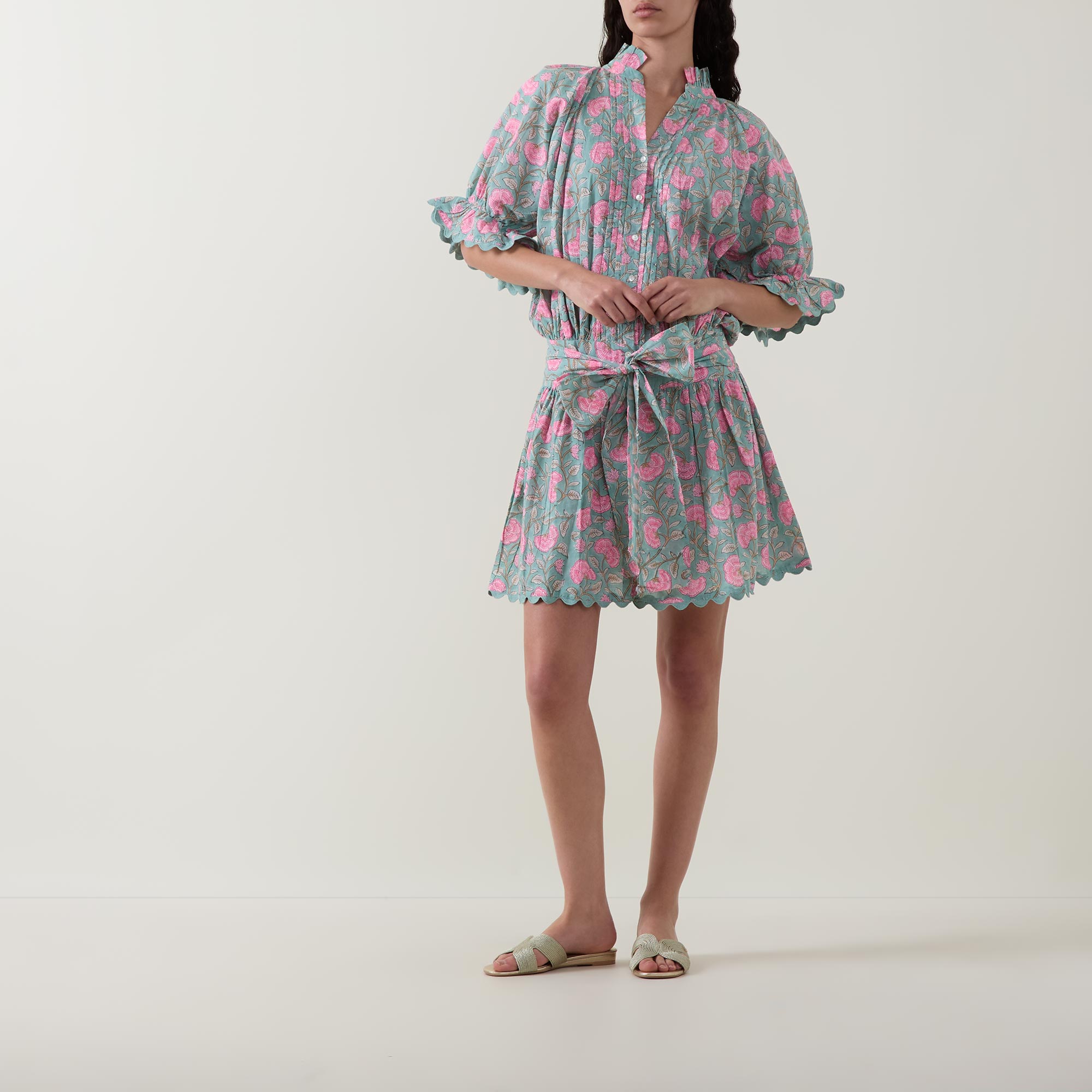 - Frill collar, half-button fastening, elbow-length sleeves, flared cuffs, adjustable waist-tie, scalloped edging, mini length, embroidered details, floral print