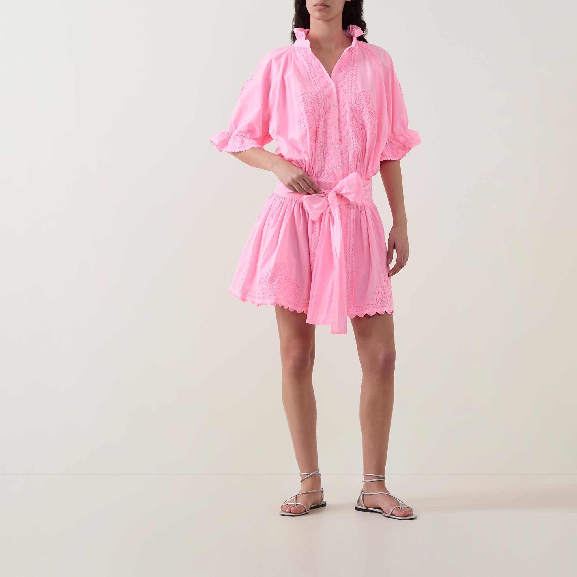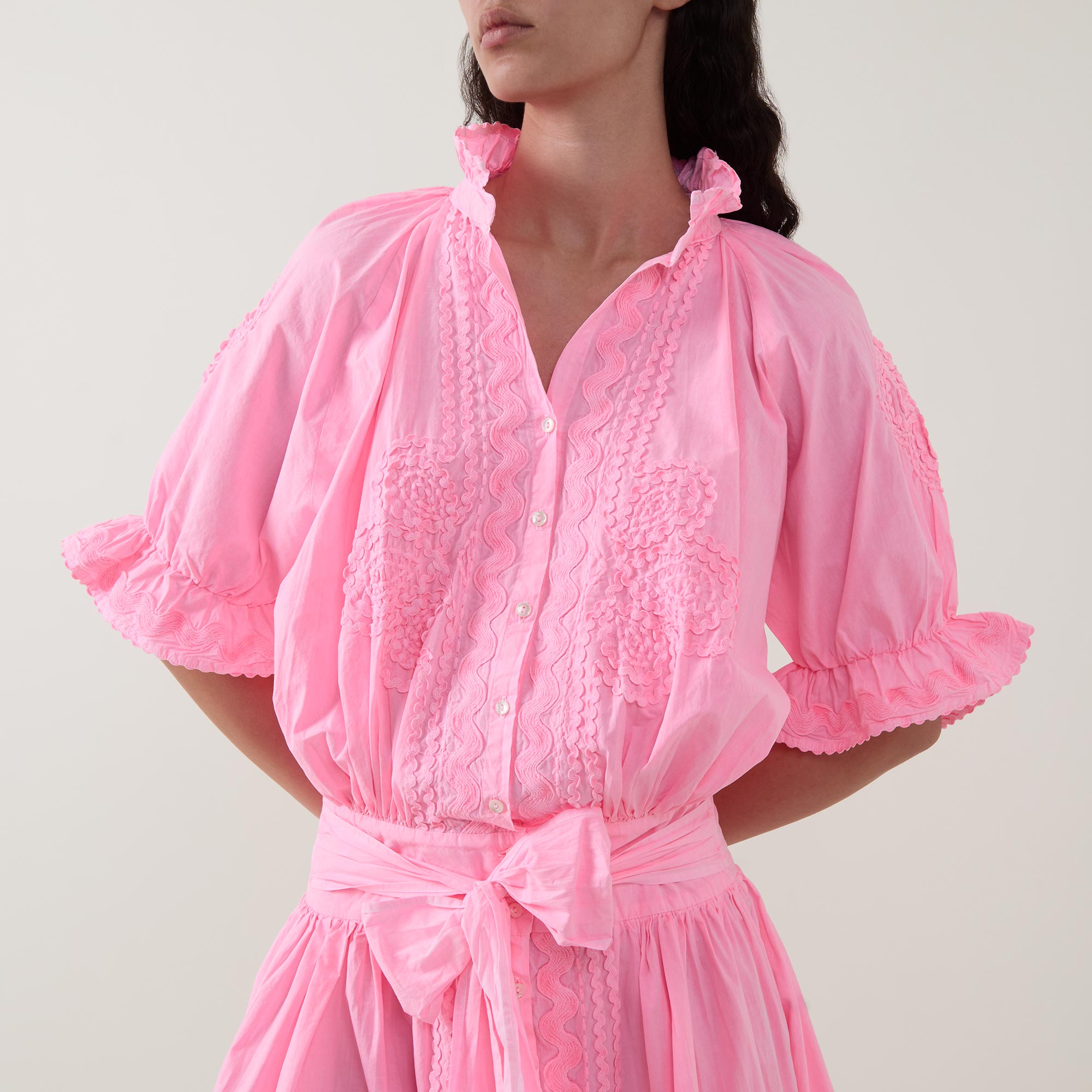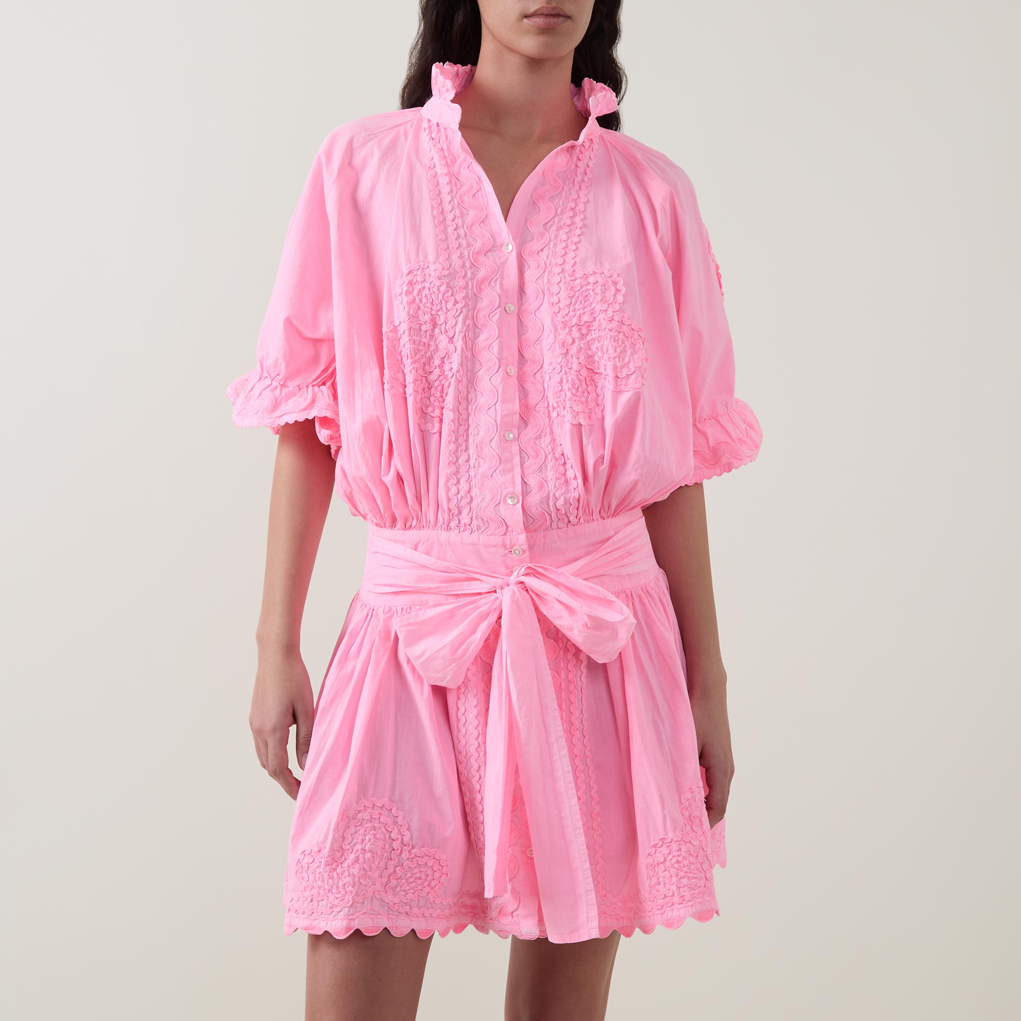 - Frill collar, half-button fastening, elbow-length sleeves, flared cuffs, adjustable waist-tie, ric rac scalloped edging, mini length, embroidered details