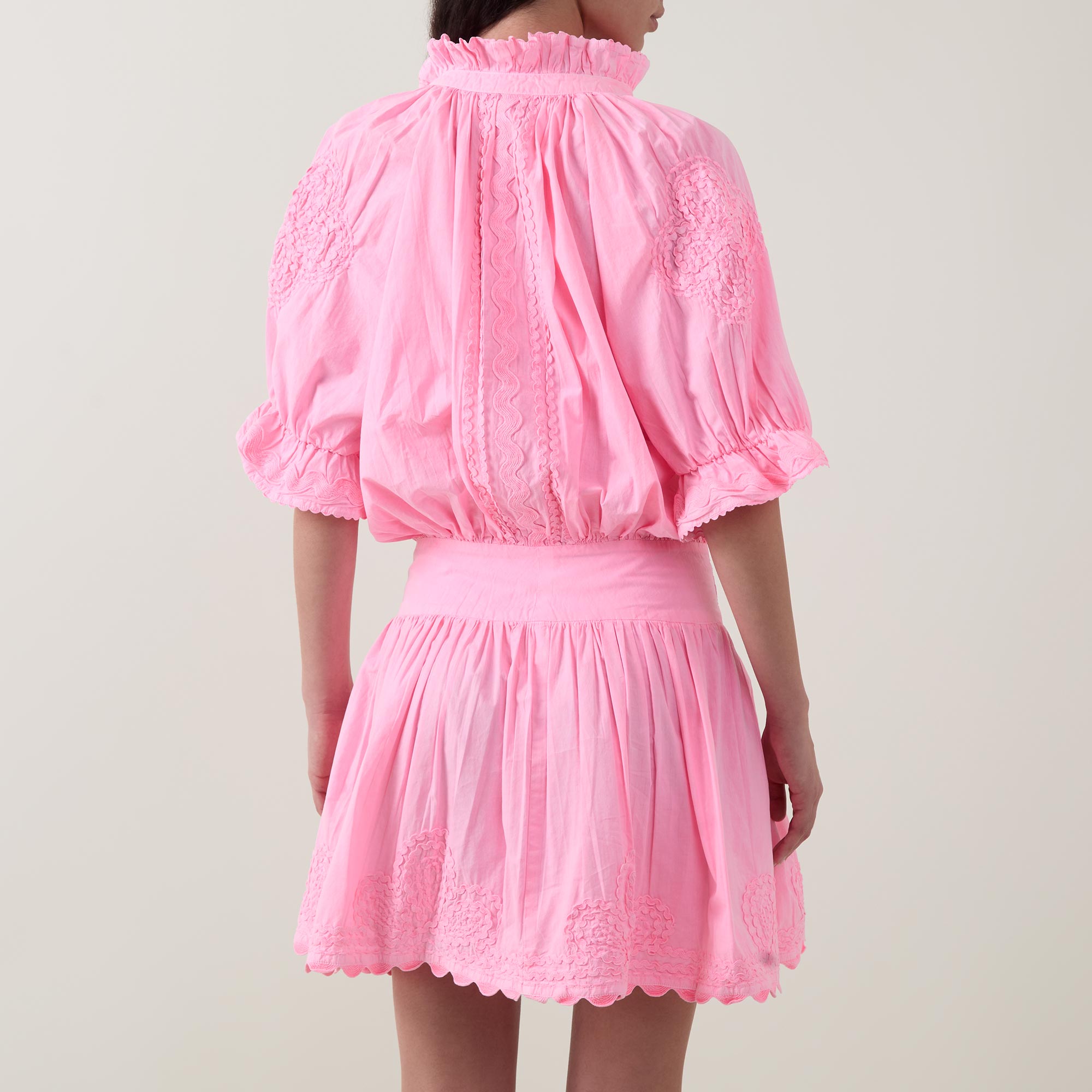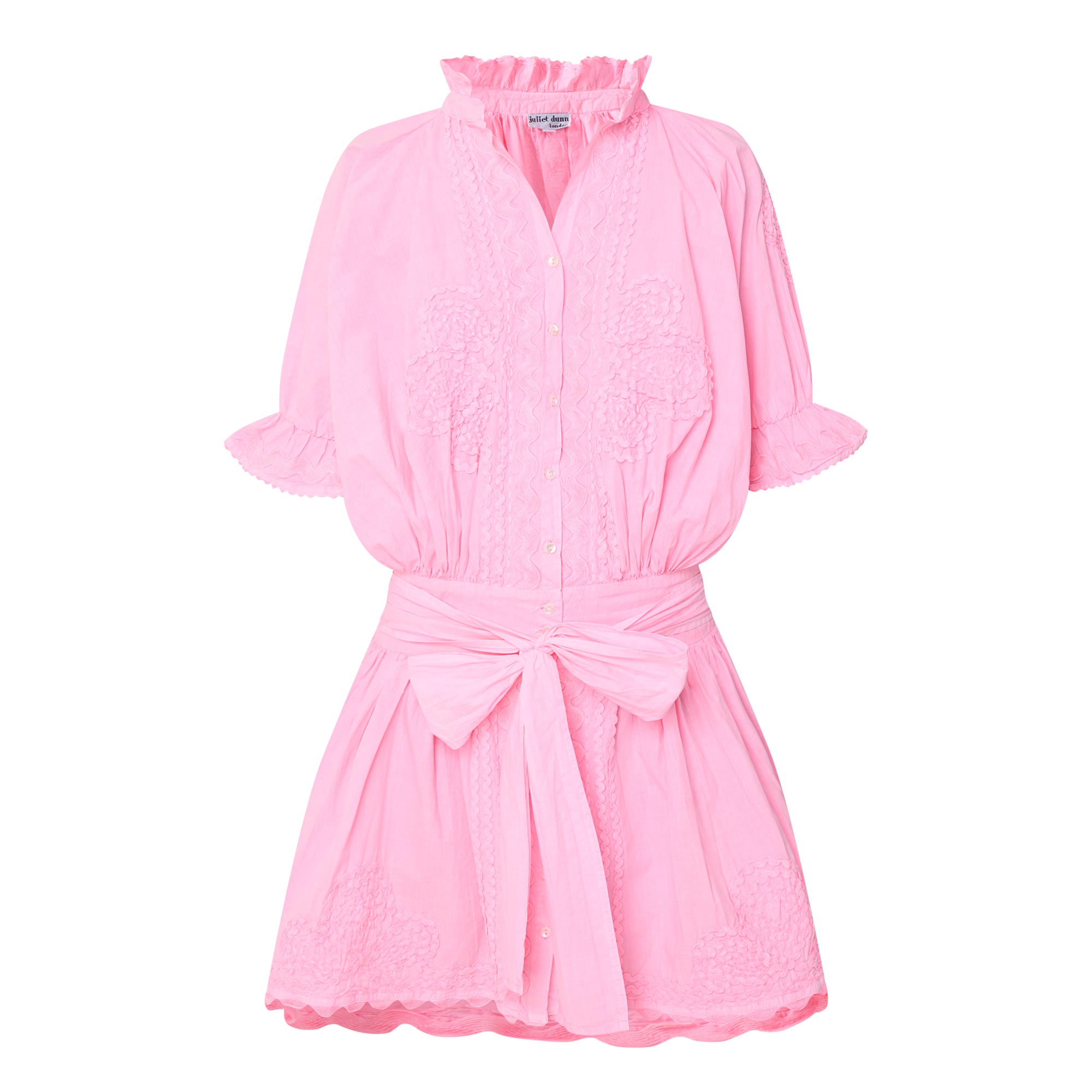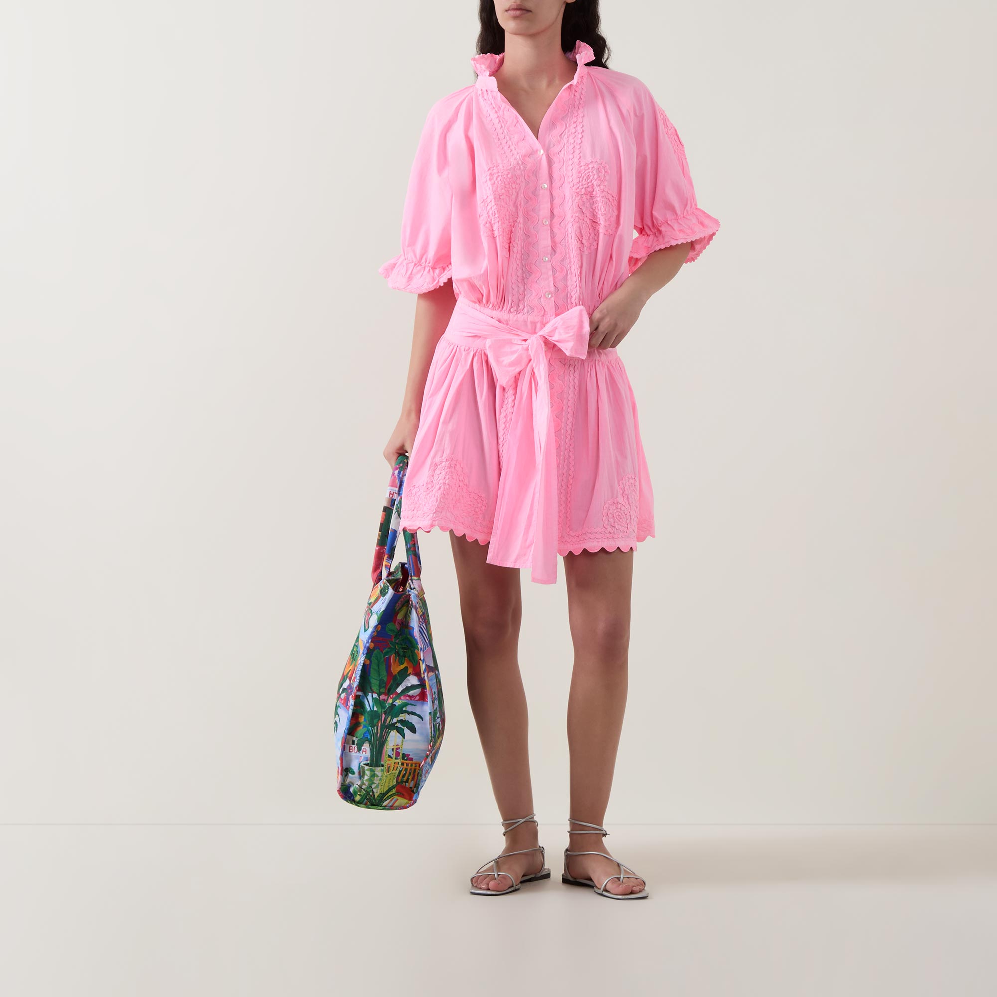 - Frill collar, half-button fastening, elbow-length sleeves, flared cuffs, adjustable waist-tie, ric rac scalloped edging, mini length, embroidered details