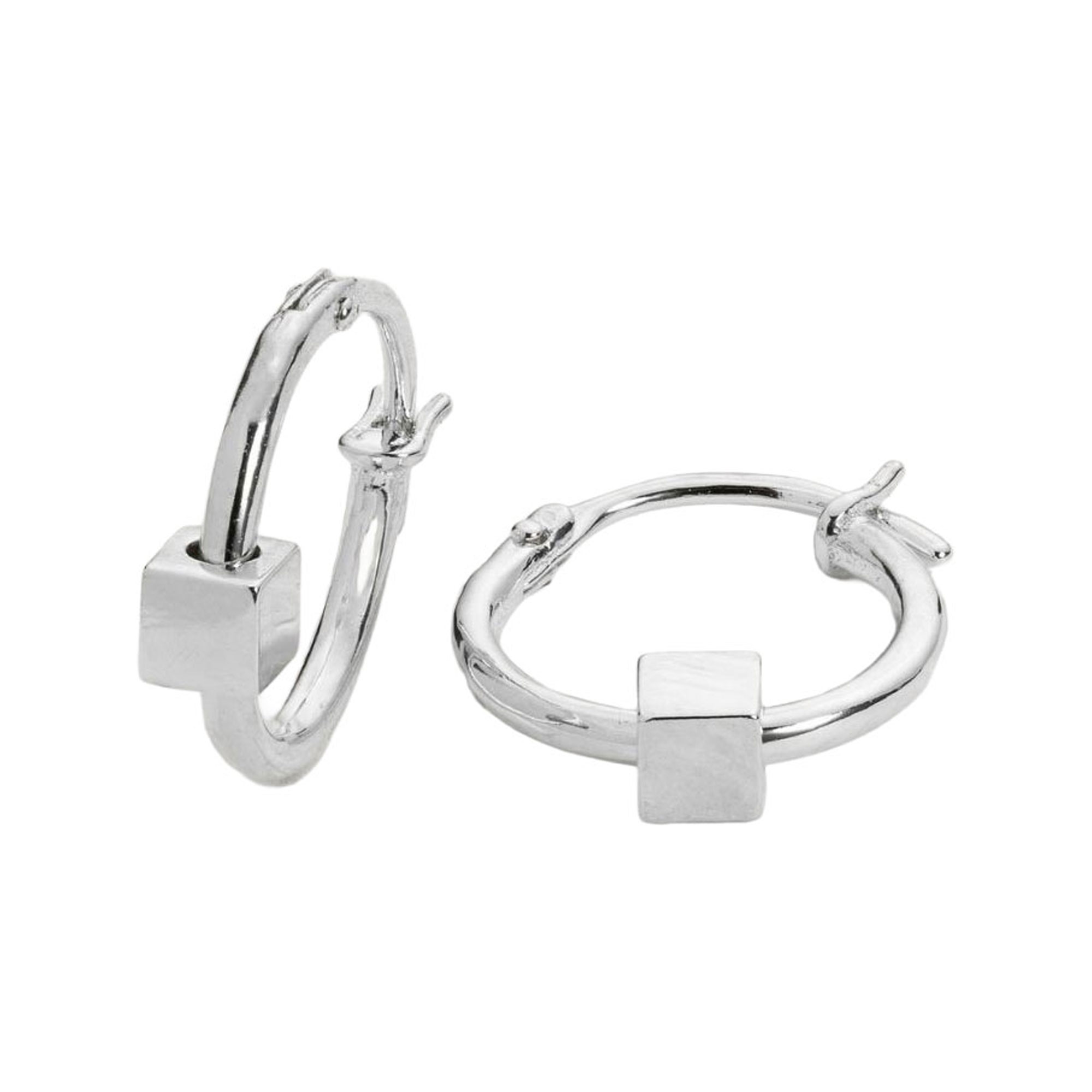 - Icon Cube design, huggie hoop style, sterling silver, polished finish