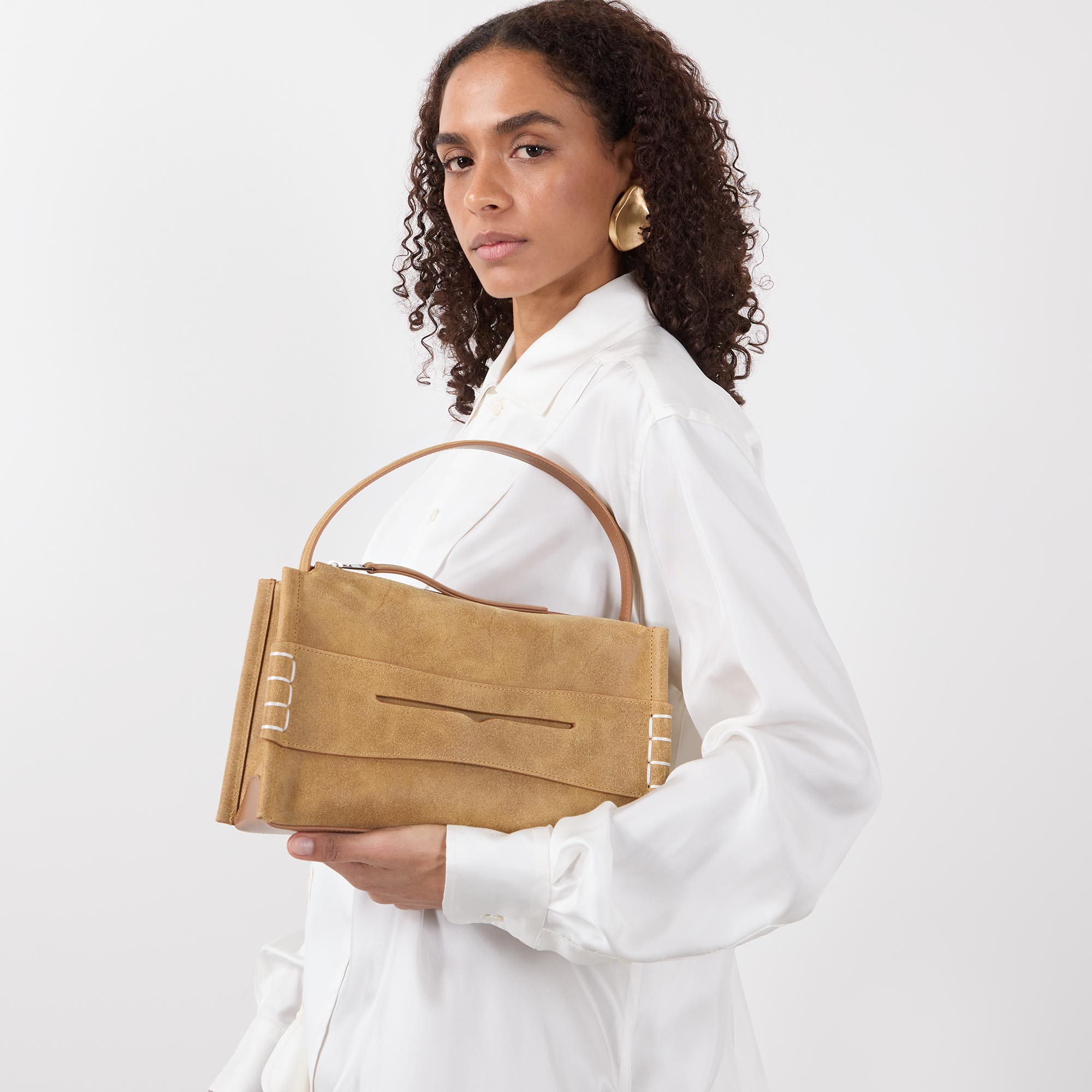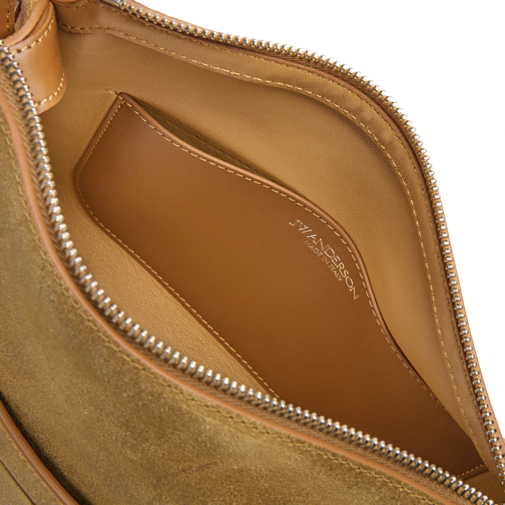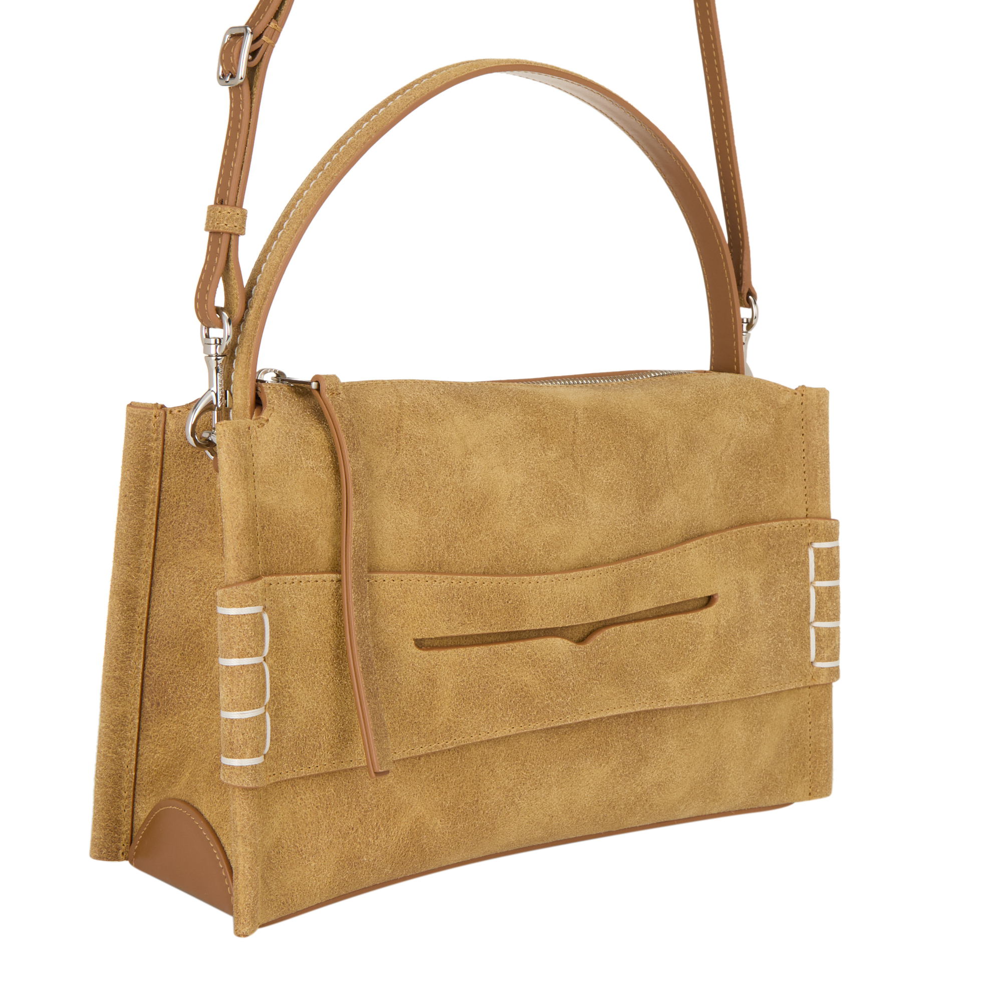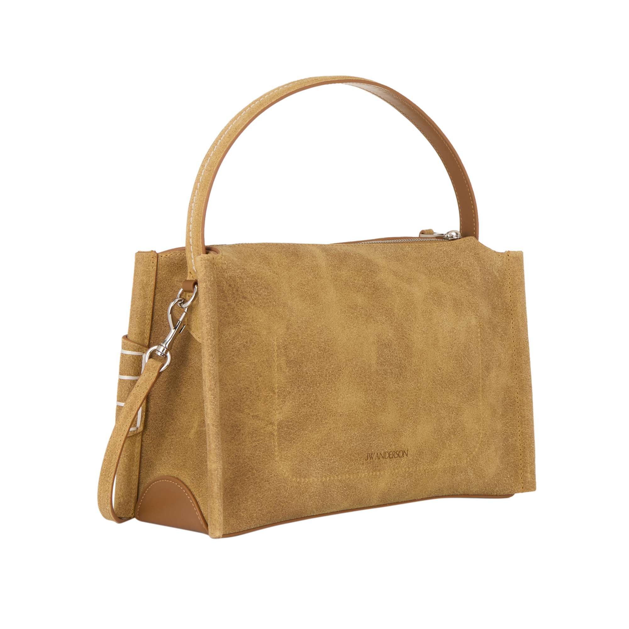 - Top carry handle, detachable and adjustable crossbody strap, silver-tone hardware, top-zip fastening, penny keeper sewn by hand with box stitches, suede upper, logo details
