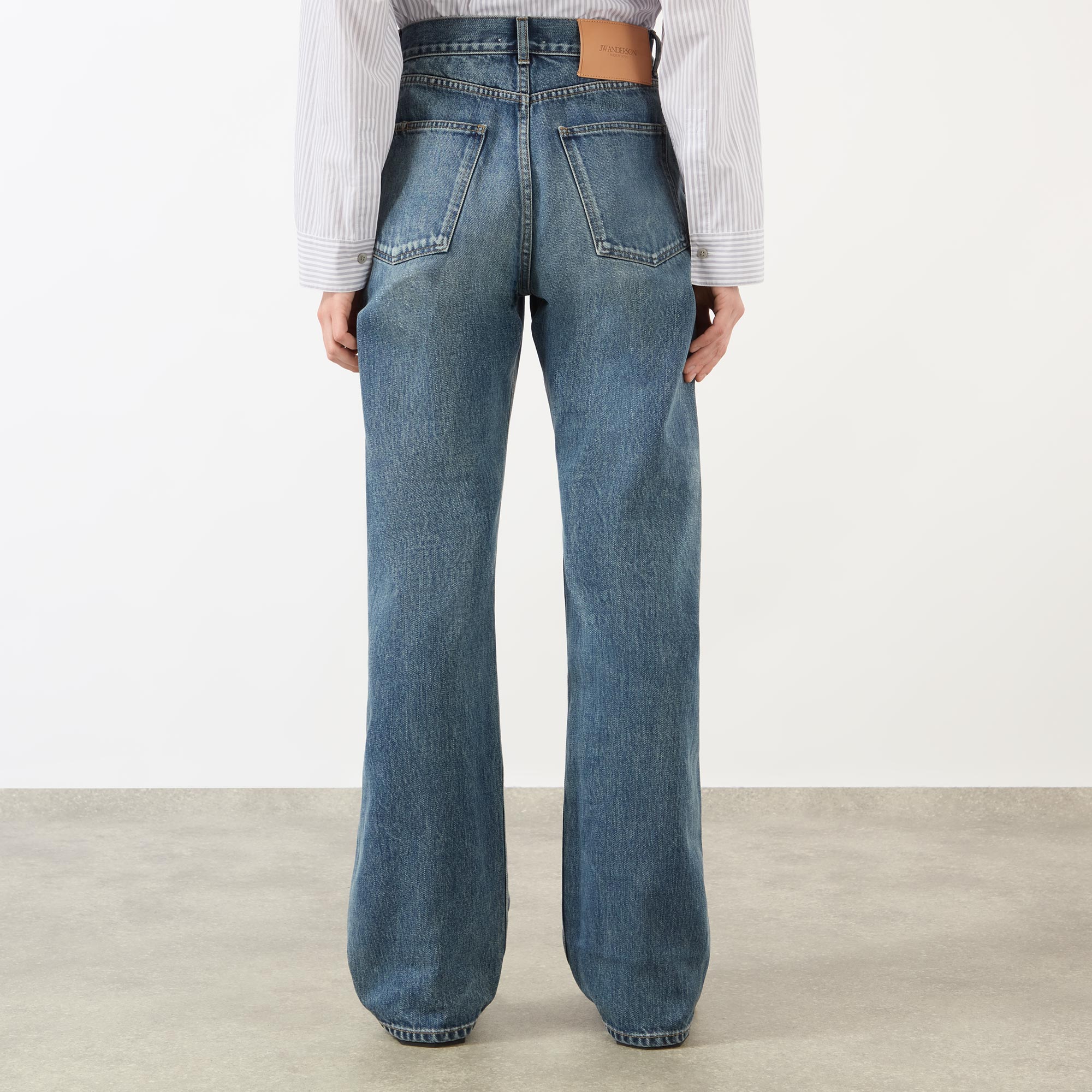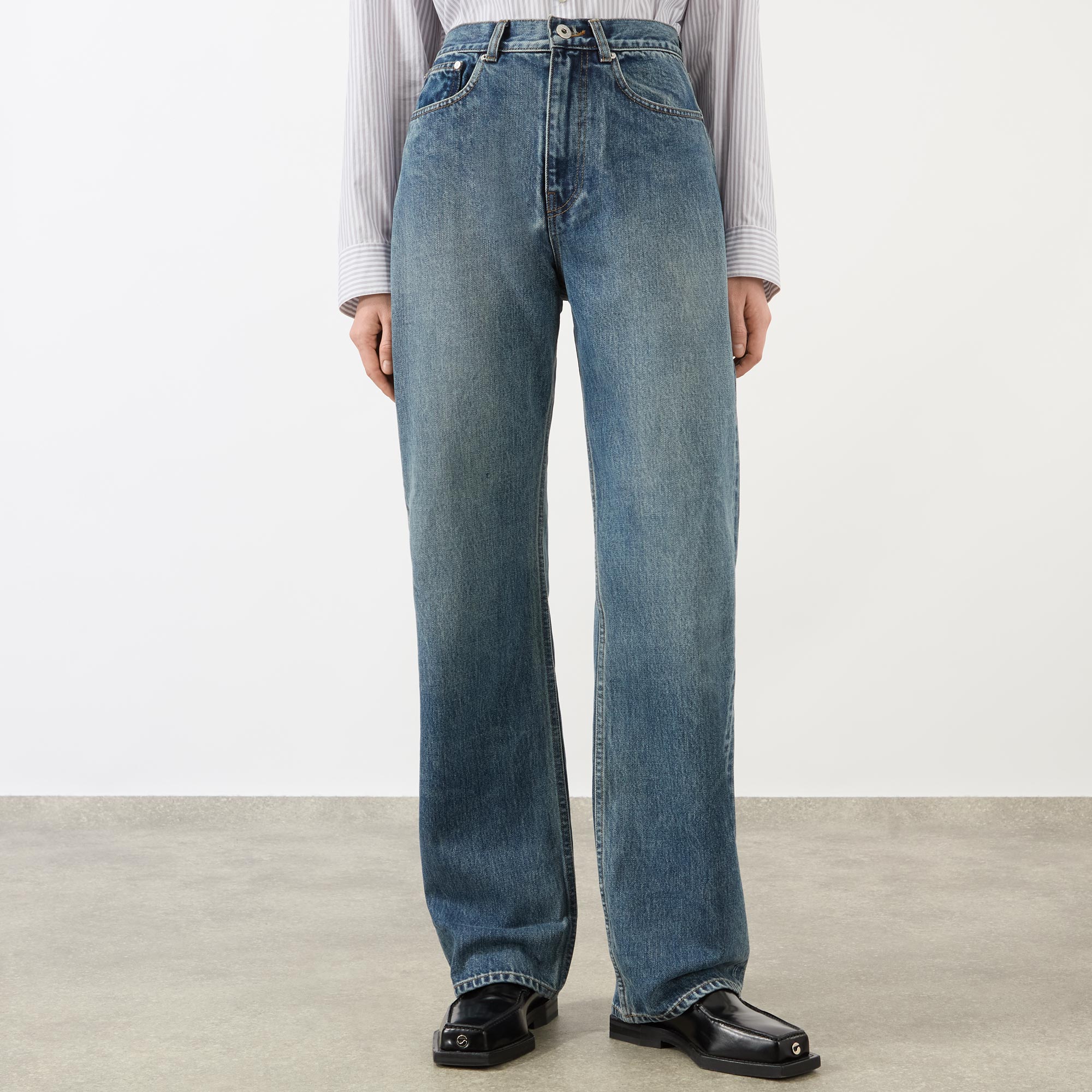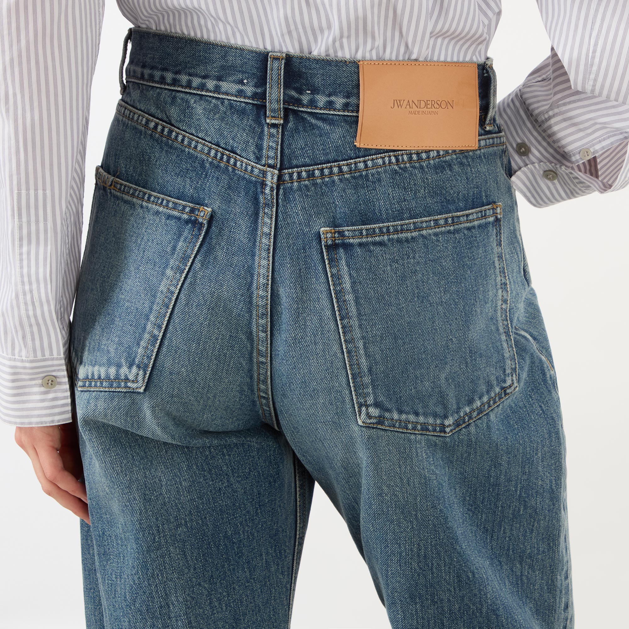 - Mid rise, straight leg, belt loops, concealed fly and custom button fastening, five pocket styling, clean hems, tobacco stitching, logo patch, anchor rivet at the ticket pocket, mid wash finish