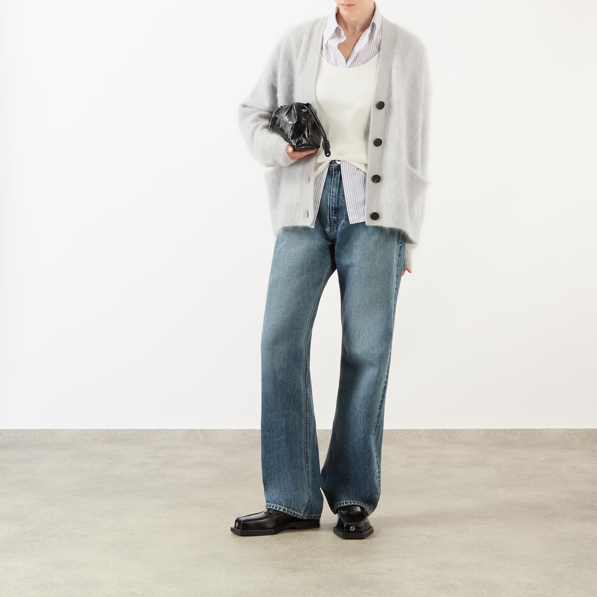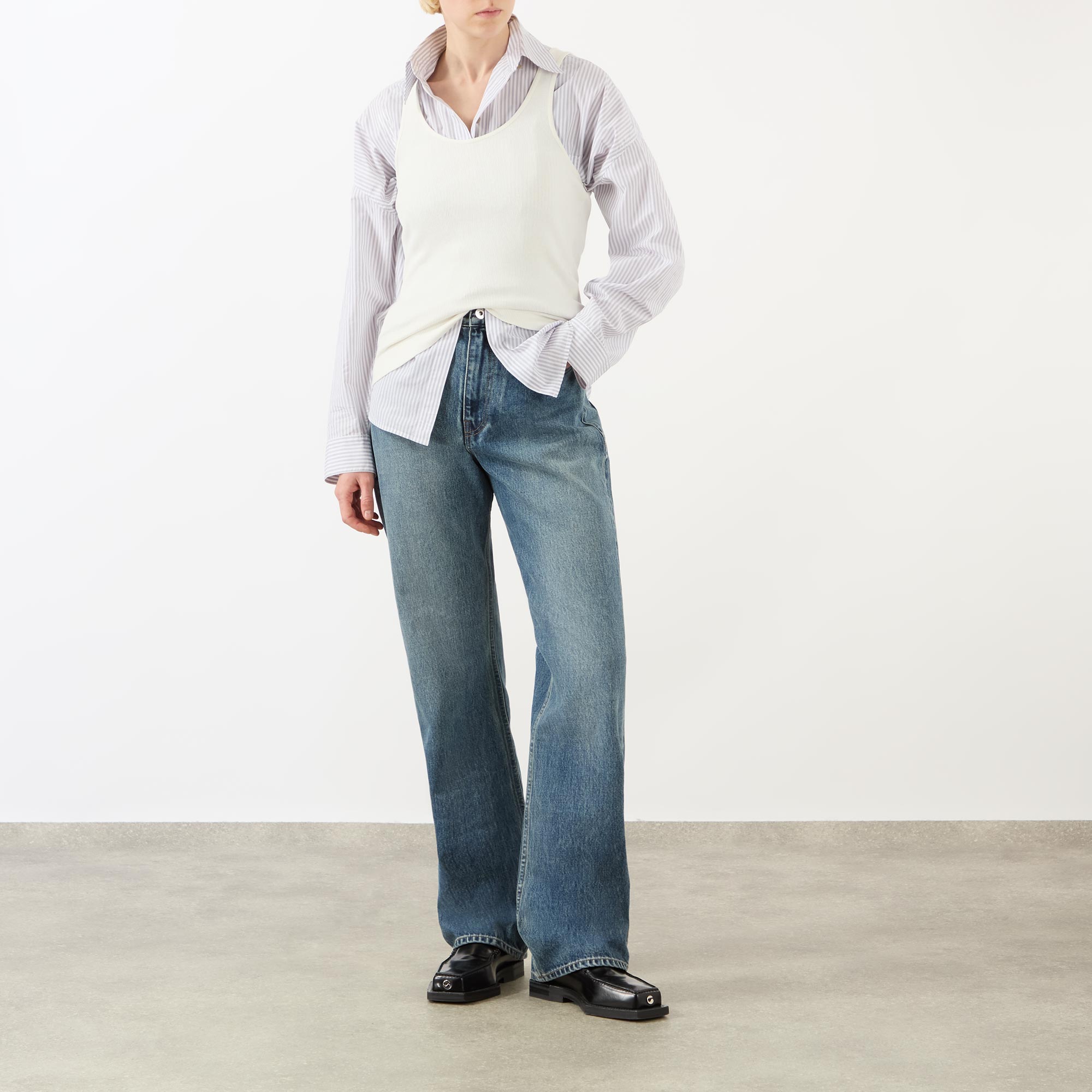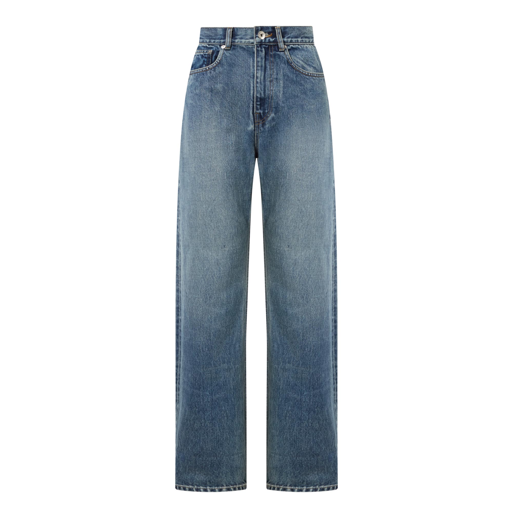 - Mid rise, straight leg, belt loops, concealed fly and custom button fastening, five pocket styling, clean hems, tobacco stitching, logo patch, anchor rivet at the ticket pocket, mid wash finish