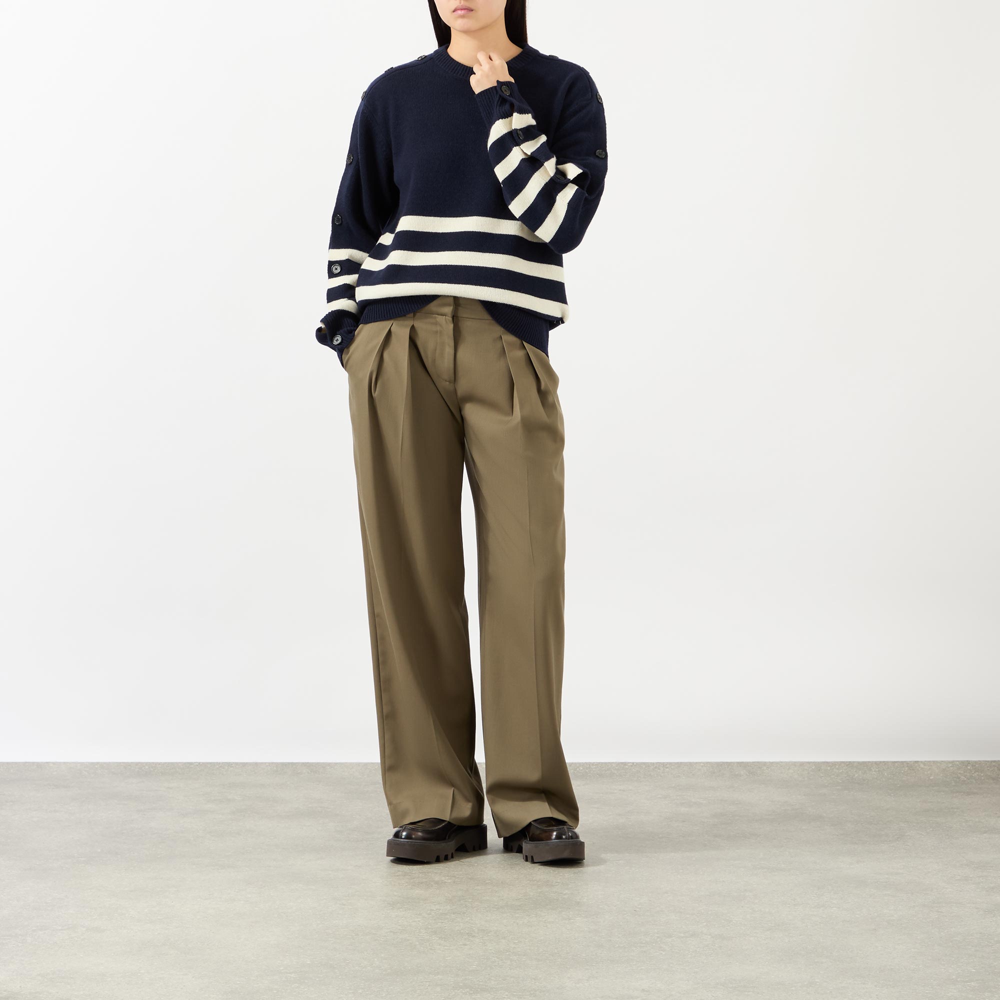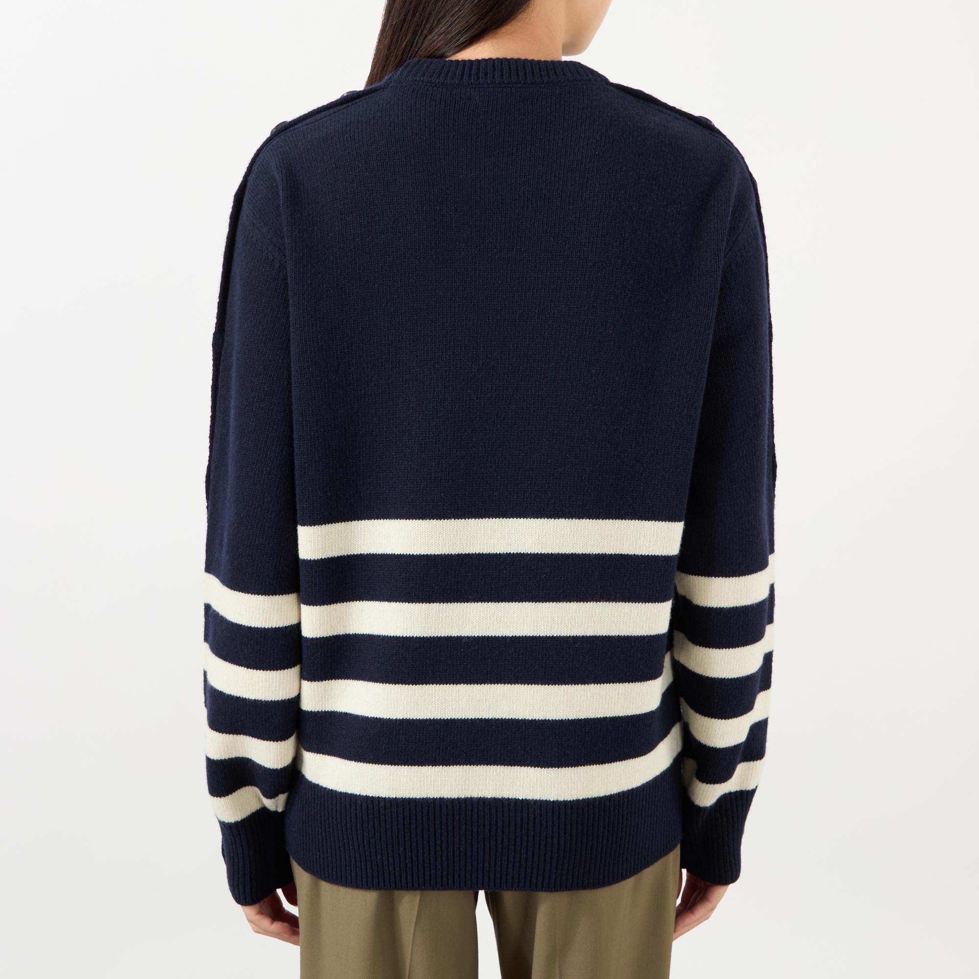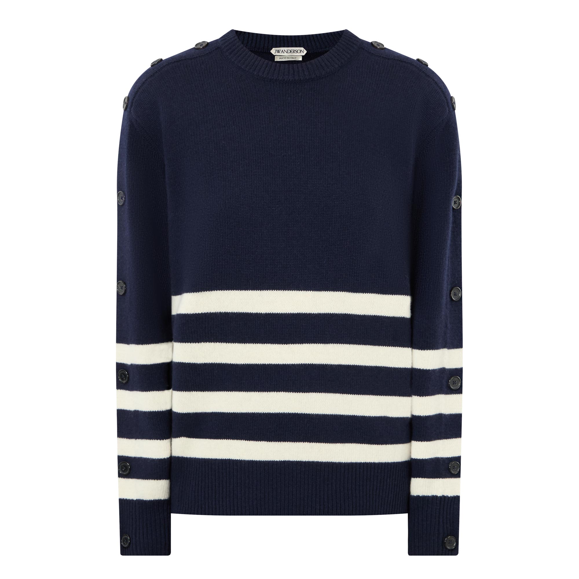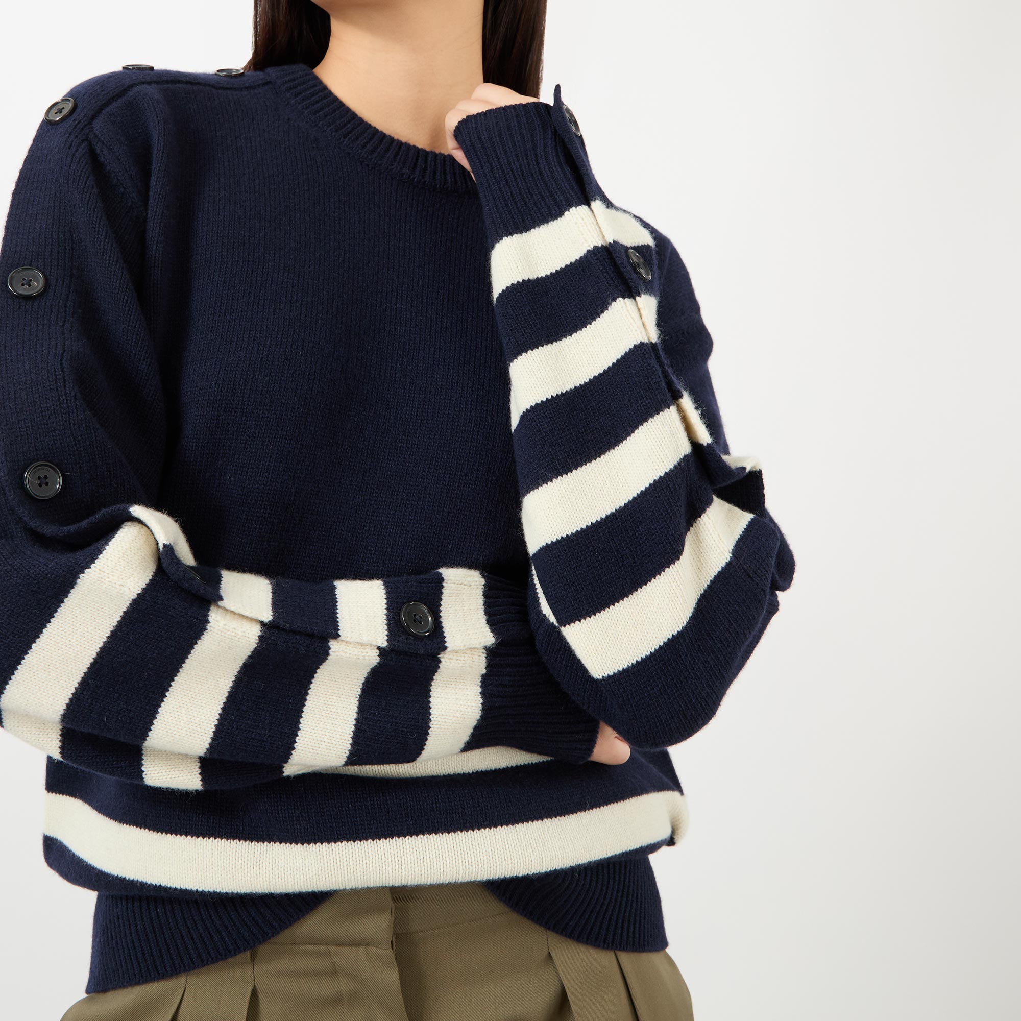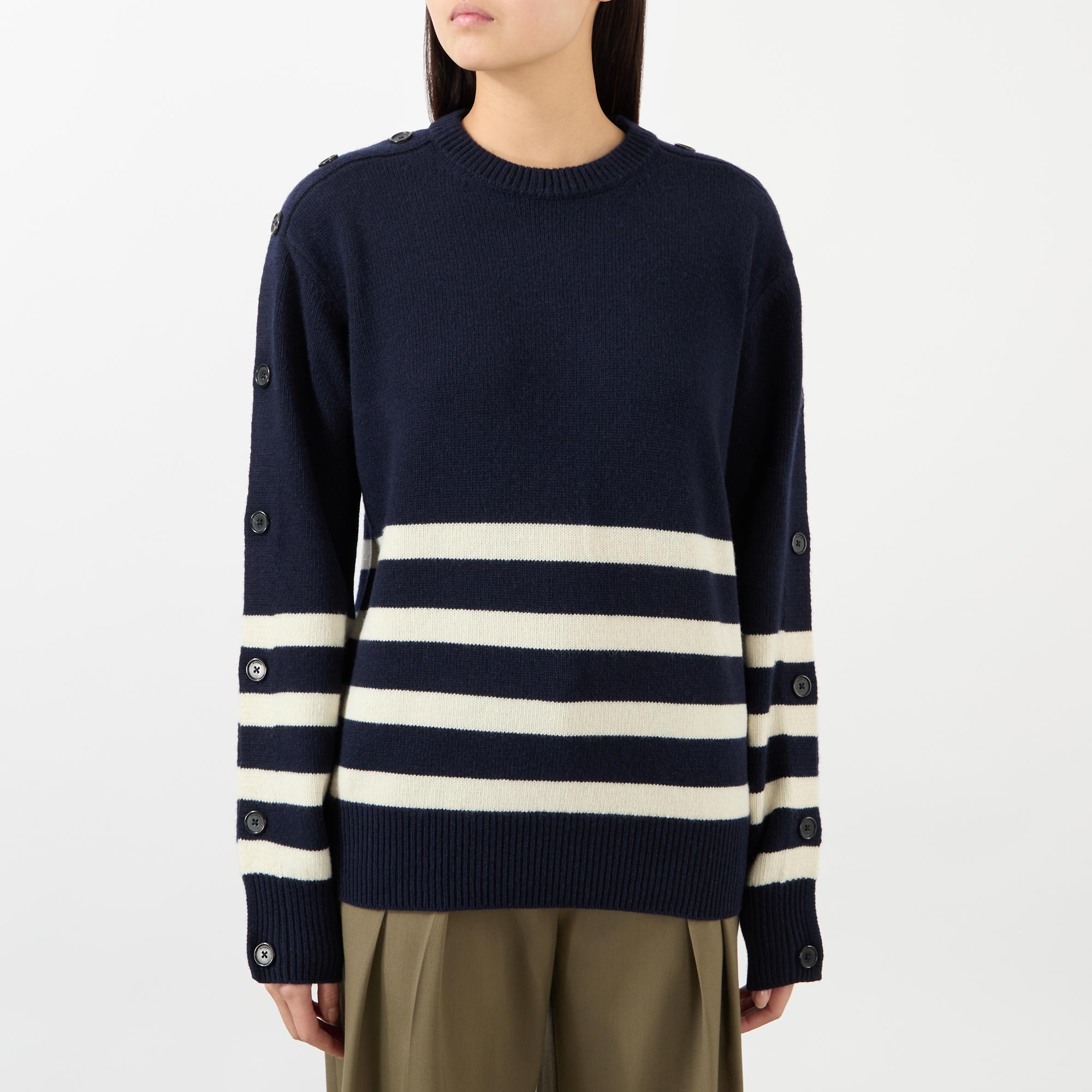 - Crew neckline, long sleeves with button detailing, ribbed trims, knit structure, Breton stripe pattern
