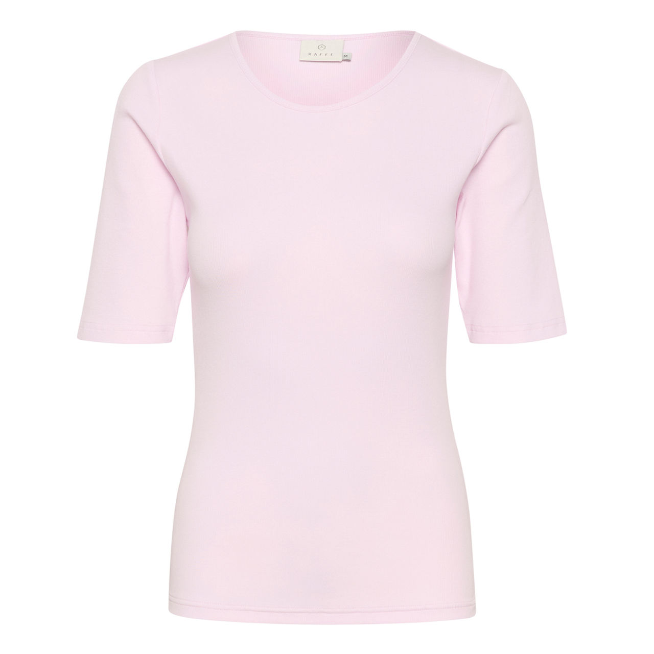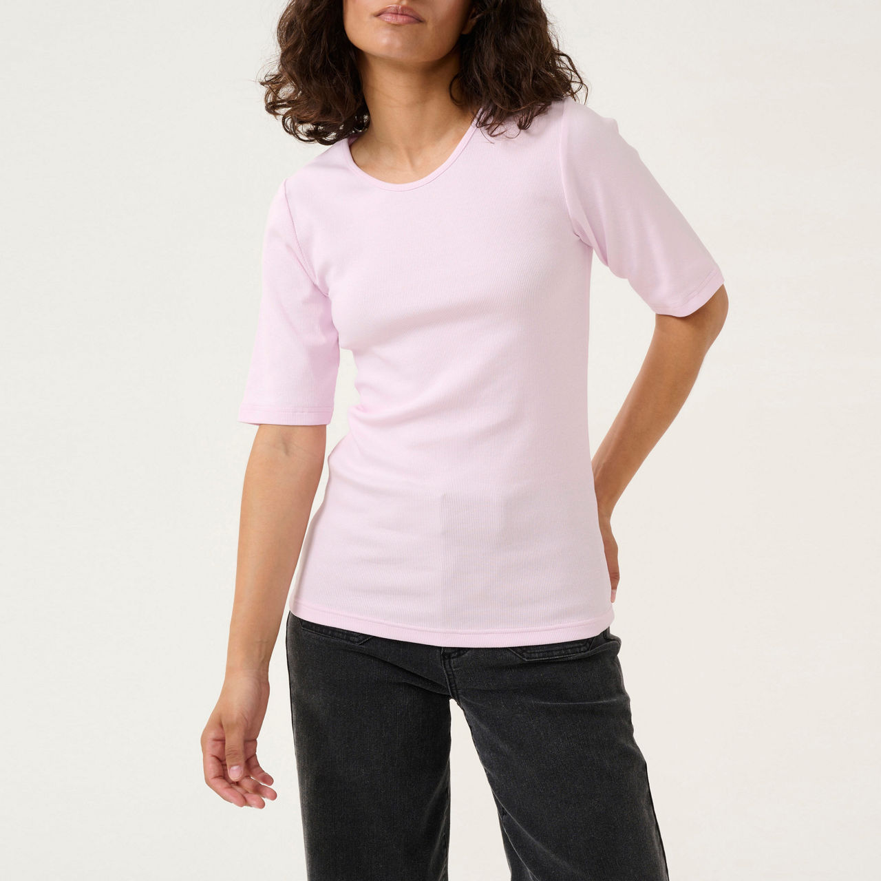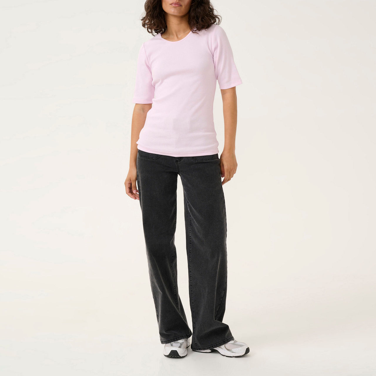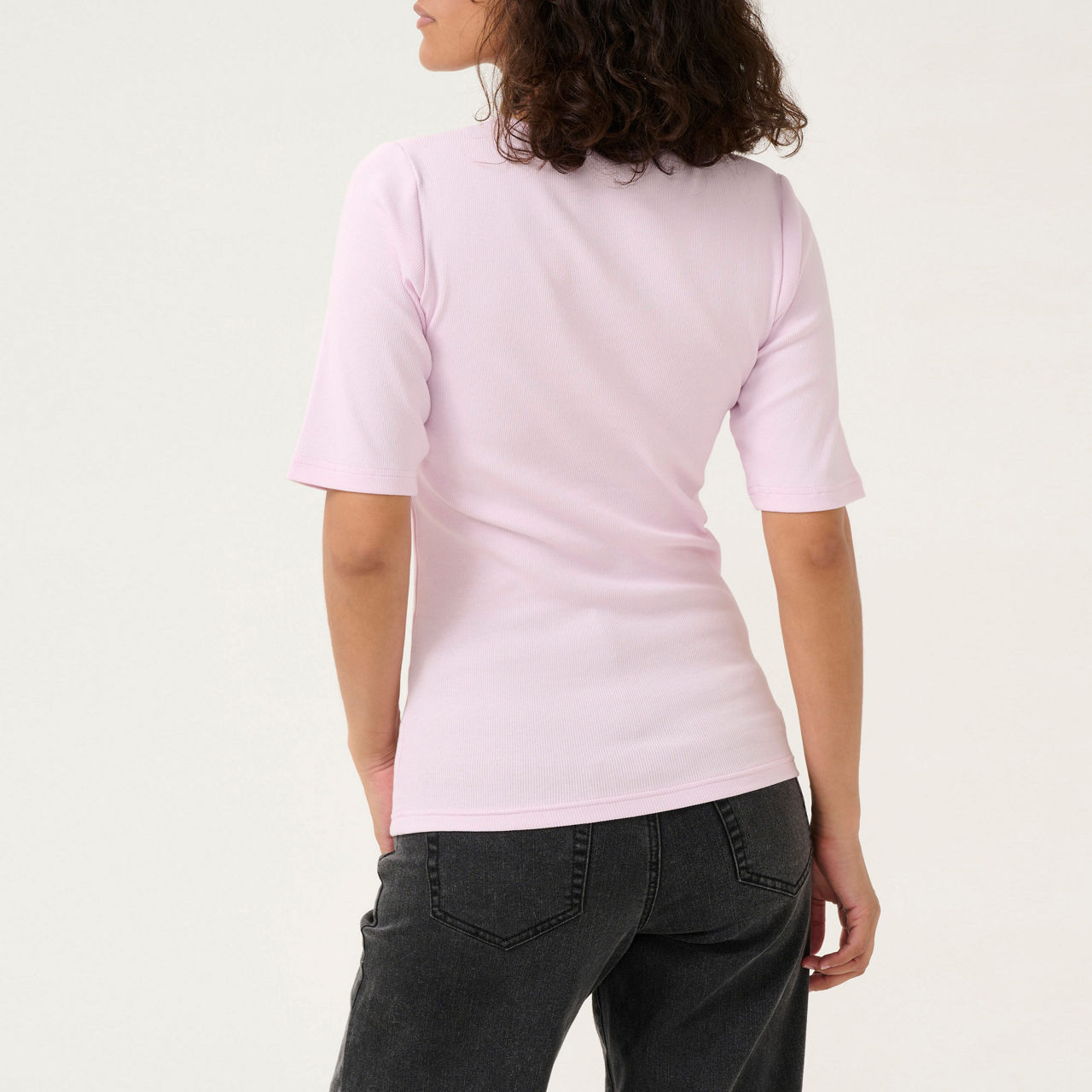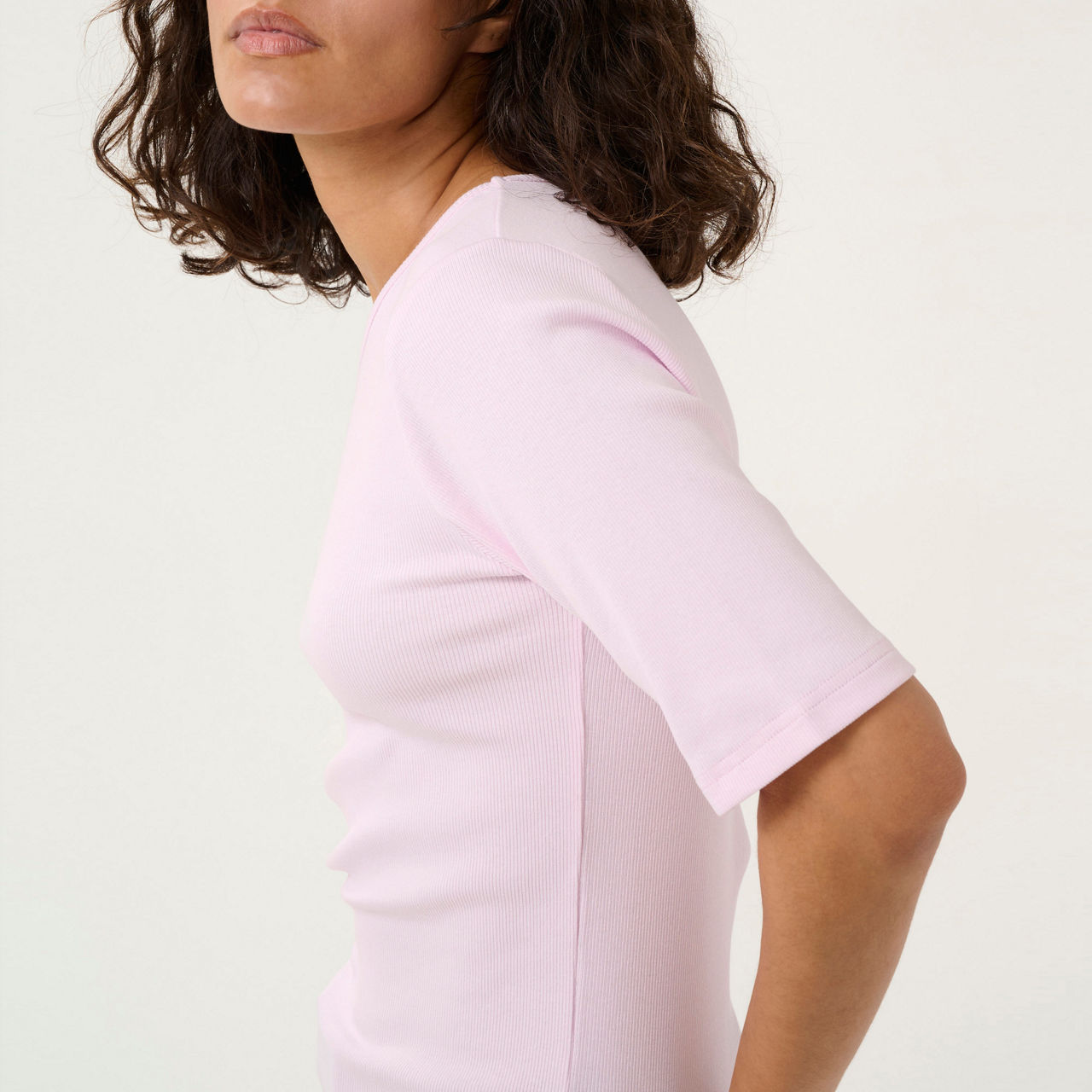 - Round neckline, soft and stretch-fused ribbed jersey fabric, short sleeves