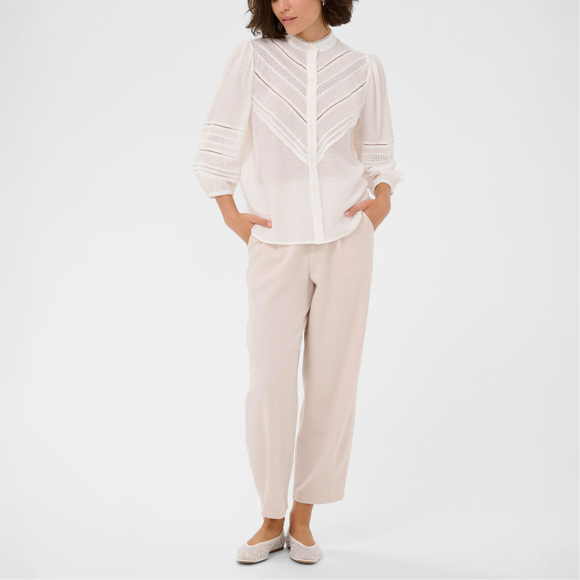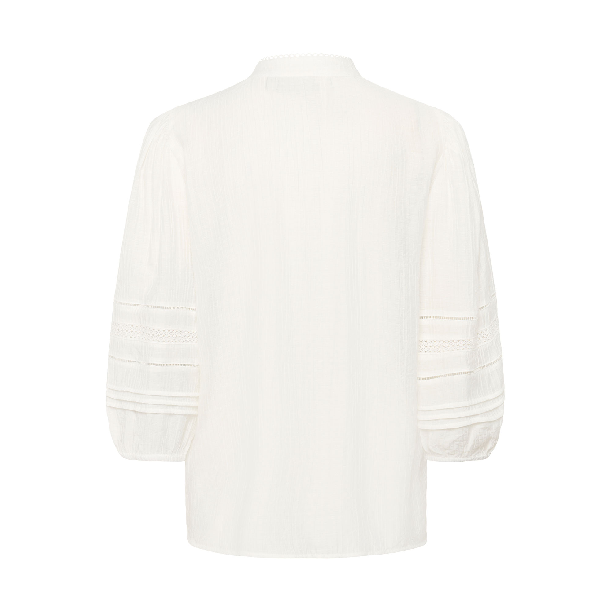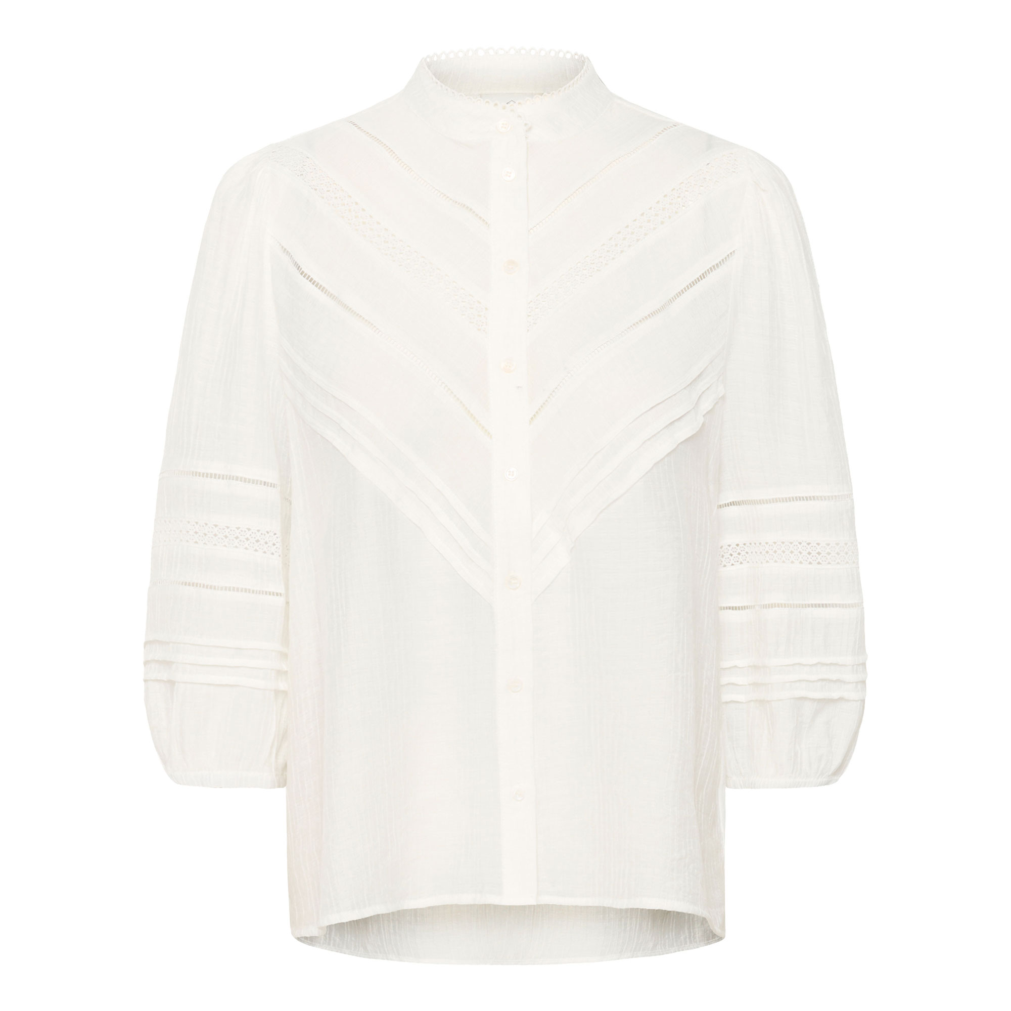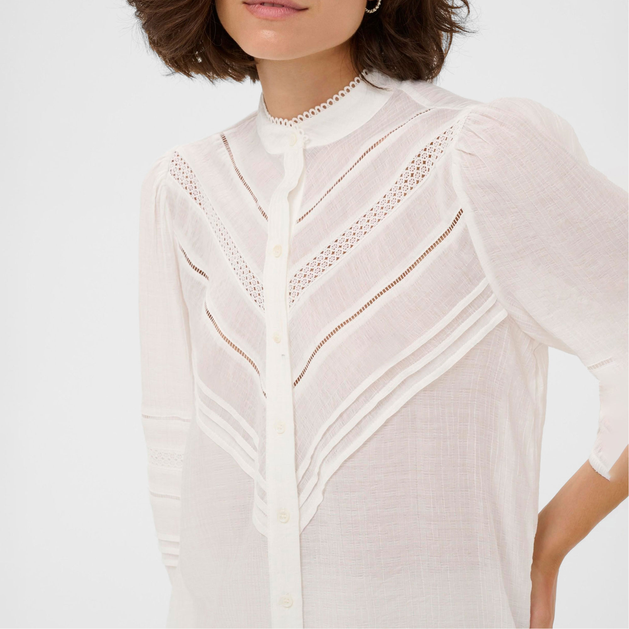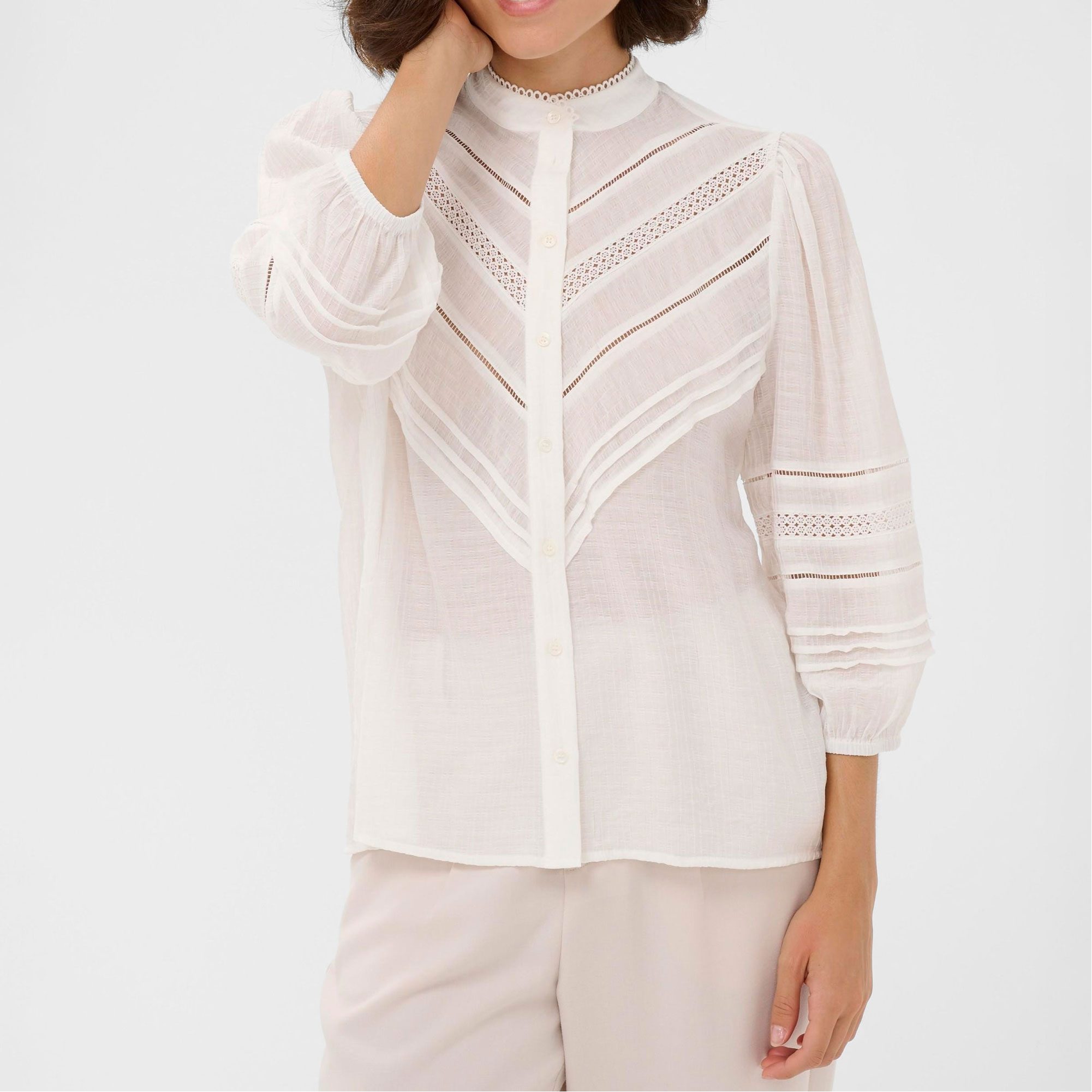 - Sheer, lace chevrons, pintuck panels, soft feel, breathable, mandarin collar, sleeves