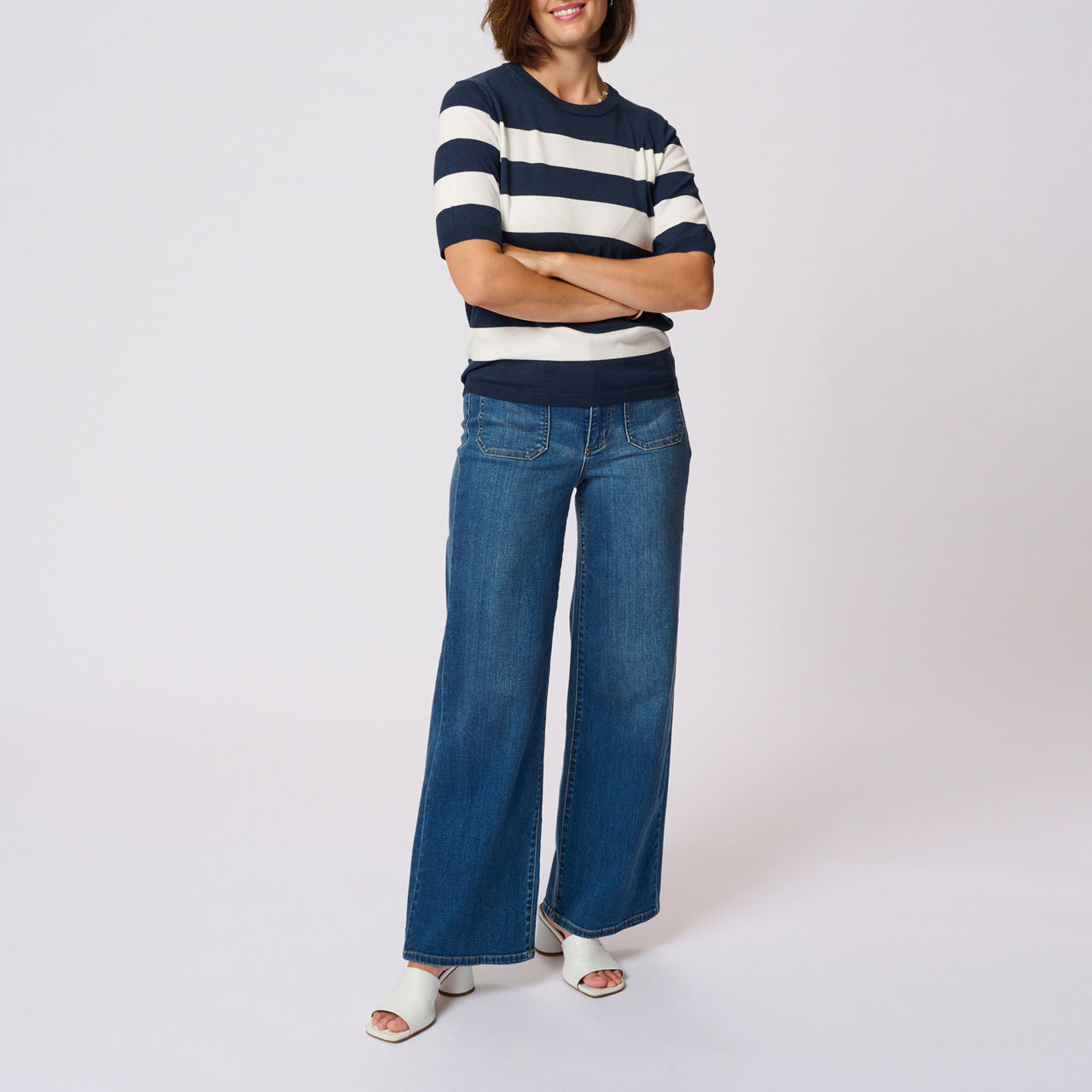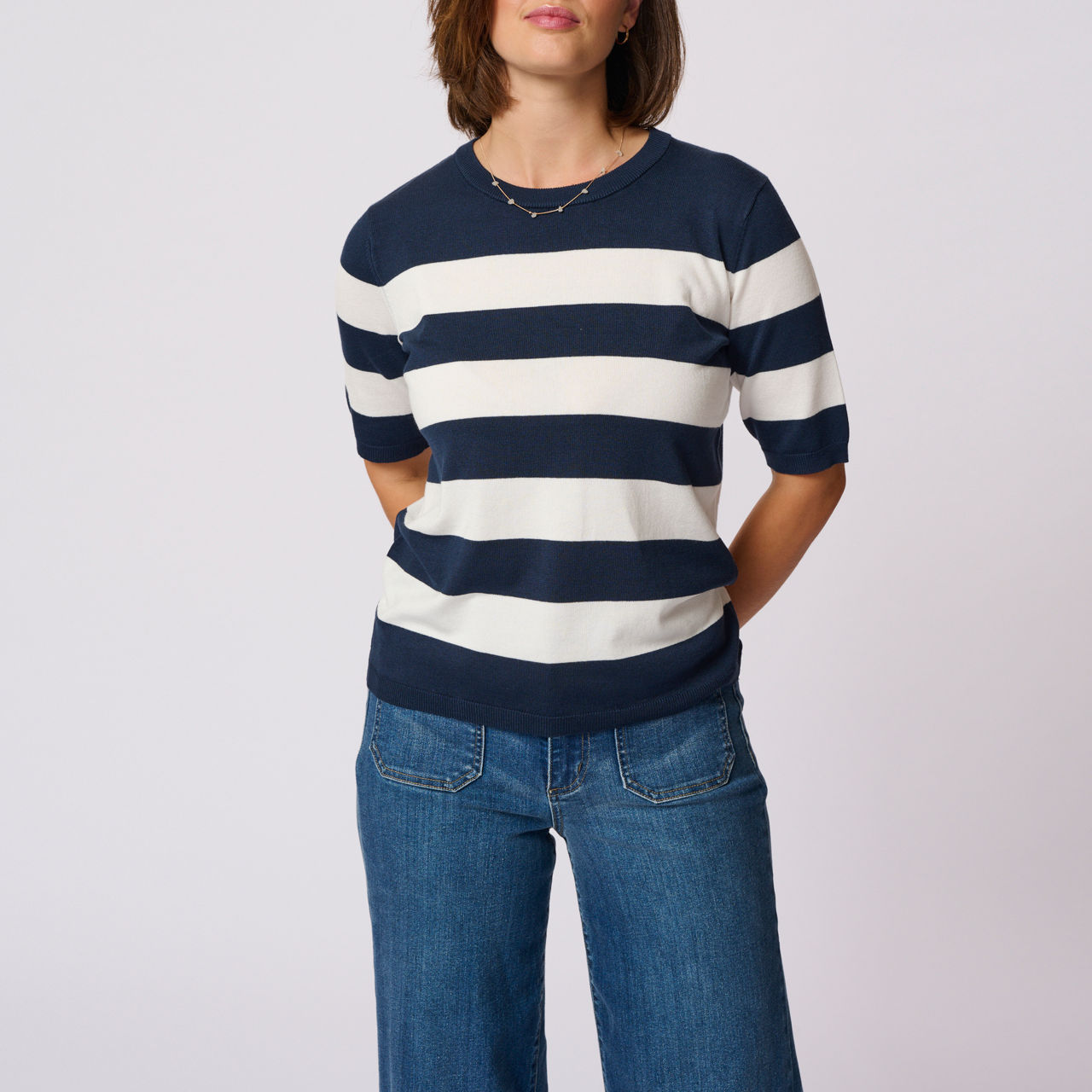 - Horizontal stripe design, crew neckline, ribbed trims, short sleeves, soft knit fabric