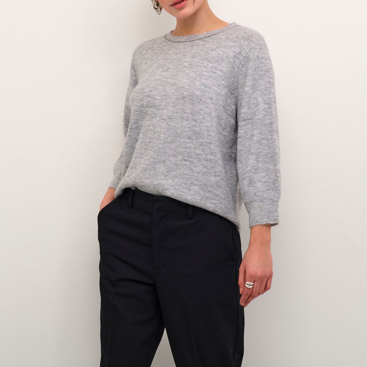 - Round neckline, beading embellishment along the neckline, soft knit fabric, three-quarter-length tapered sleeves, ribbed trims