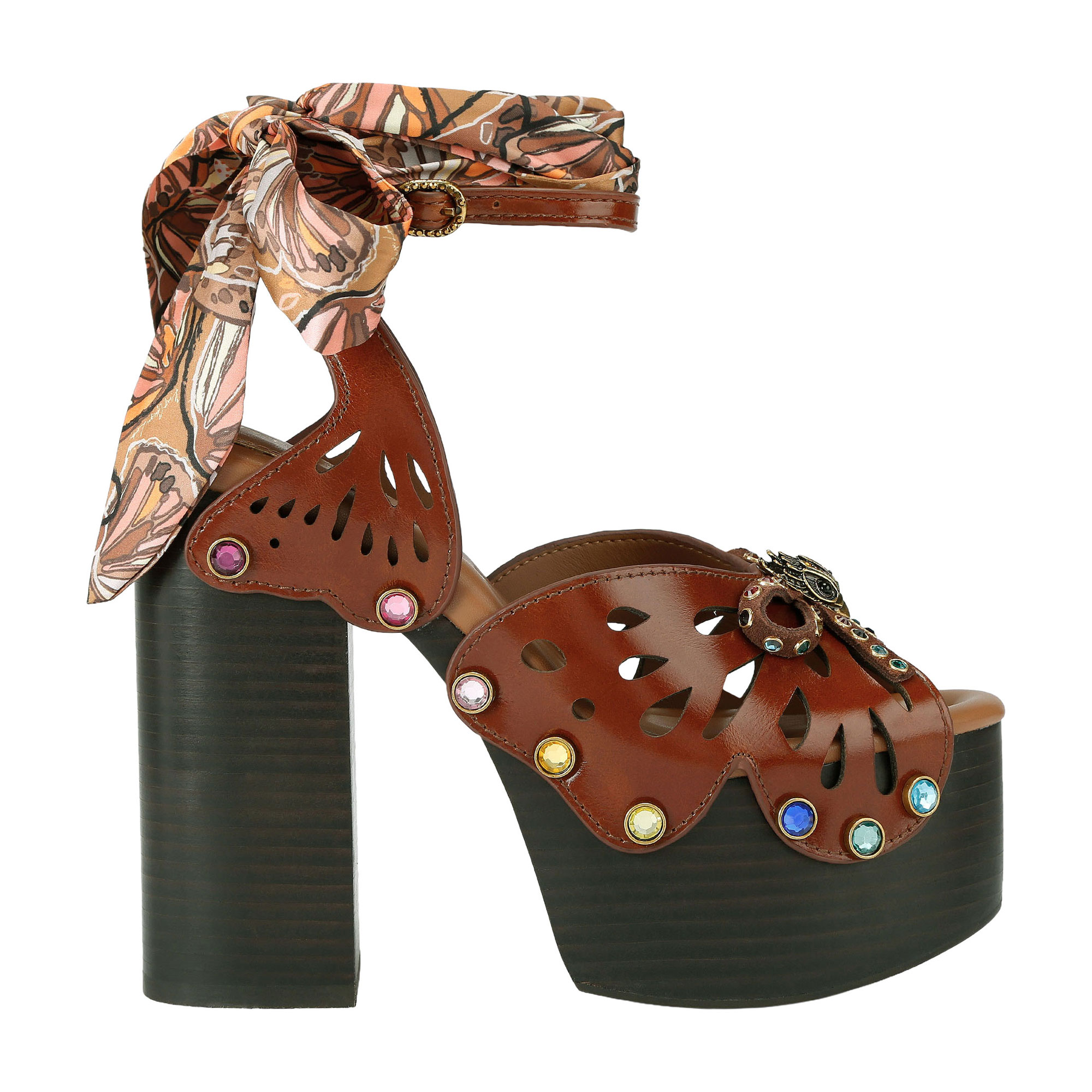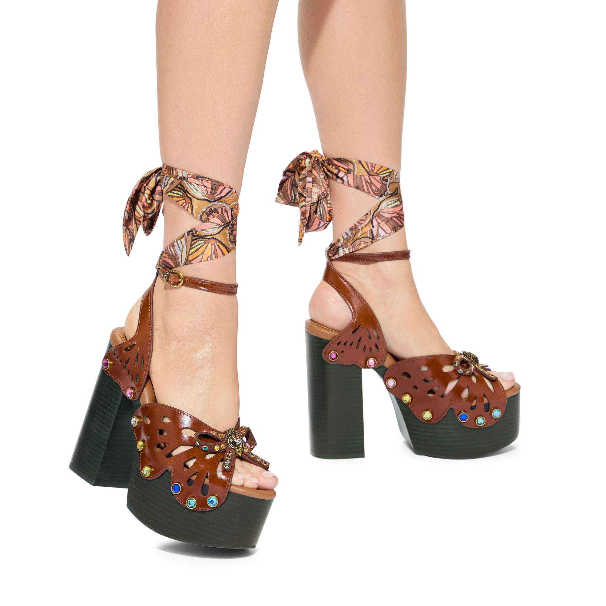 • Platform heel design, leather upper, butterfly wing cut-out detailing, crystal embellishments throughout, ankle wrap scarf fastening, gold-tone hardware