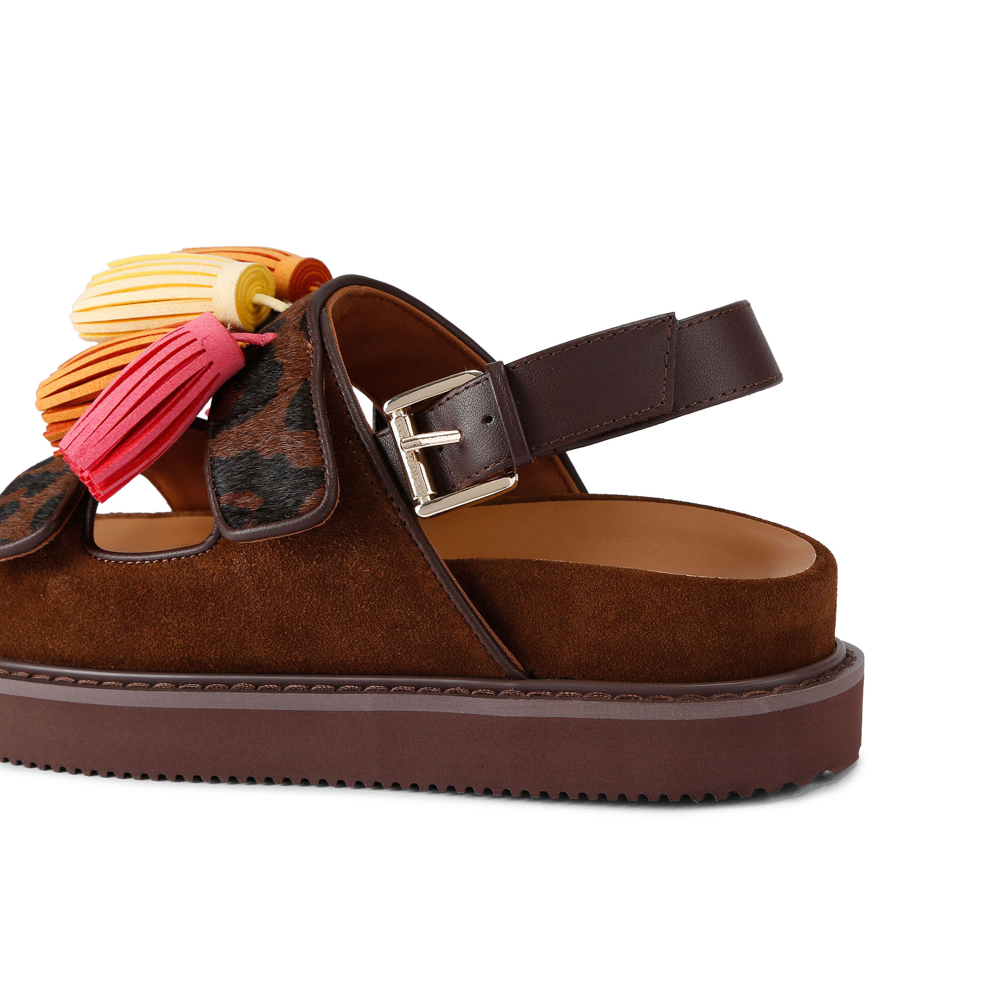 - Sandal design, textured calf hair leather upper, tassel detailing, ankle strap fastening, gold-tone buckle
