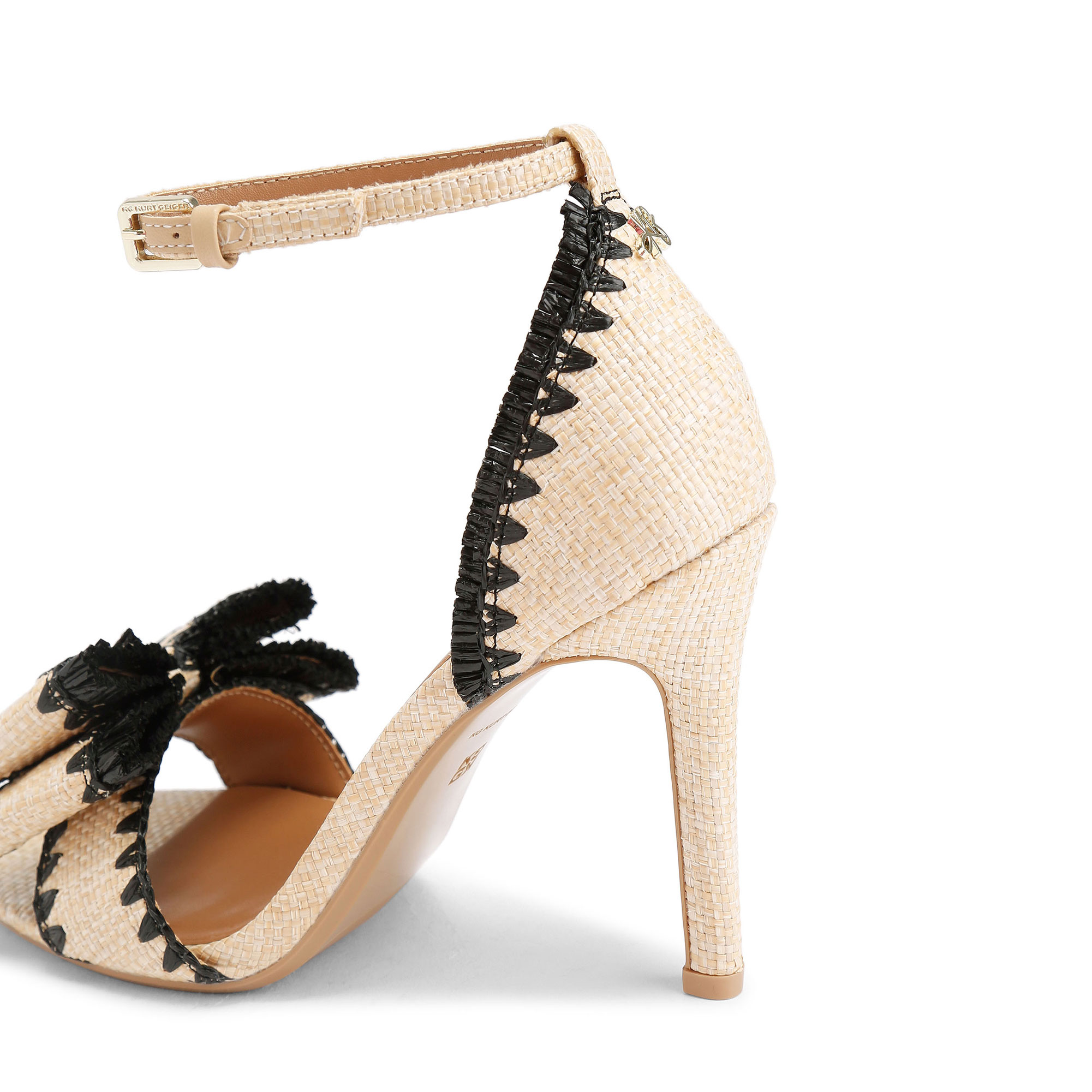 • Raffia fabric, large bow detail, ankle strap with gold-tone buckle fastening, two-tone finish