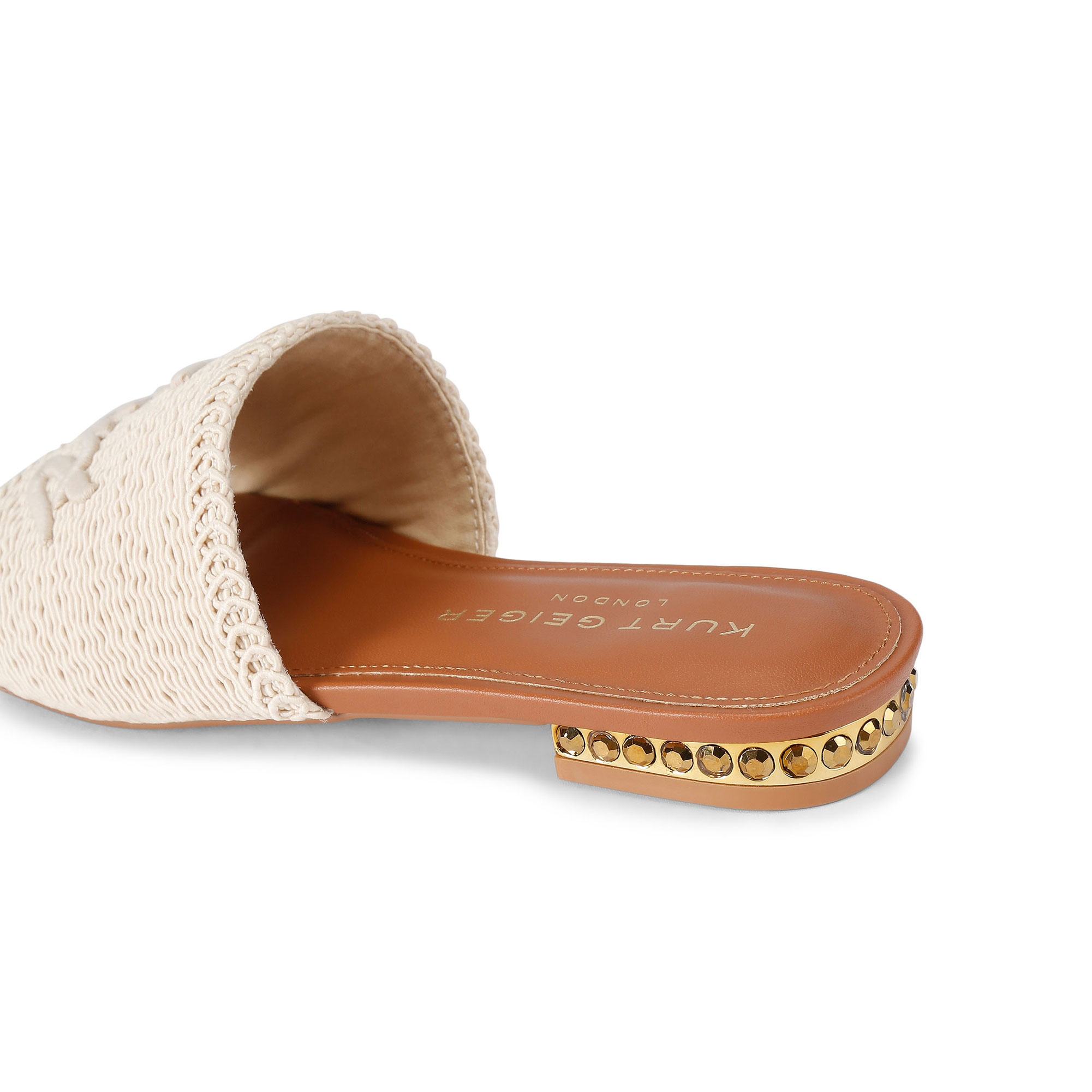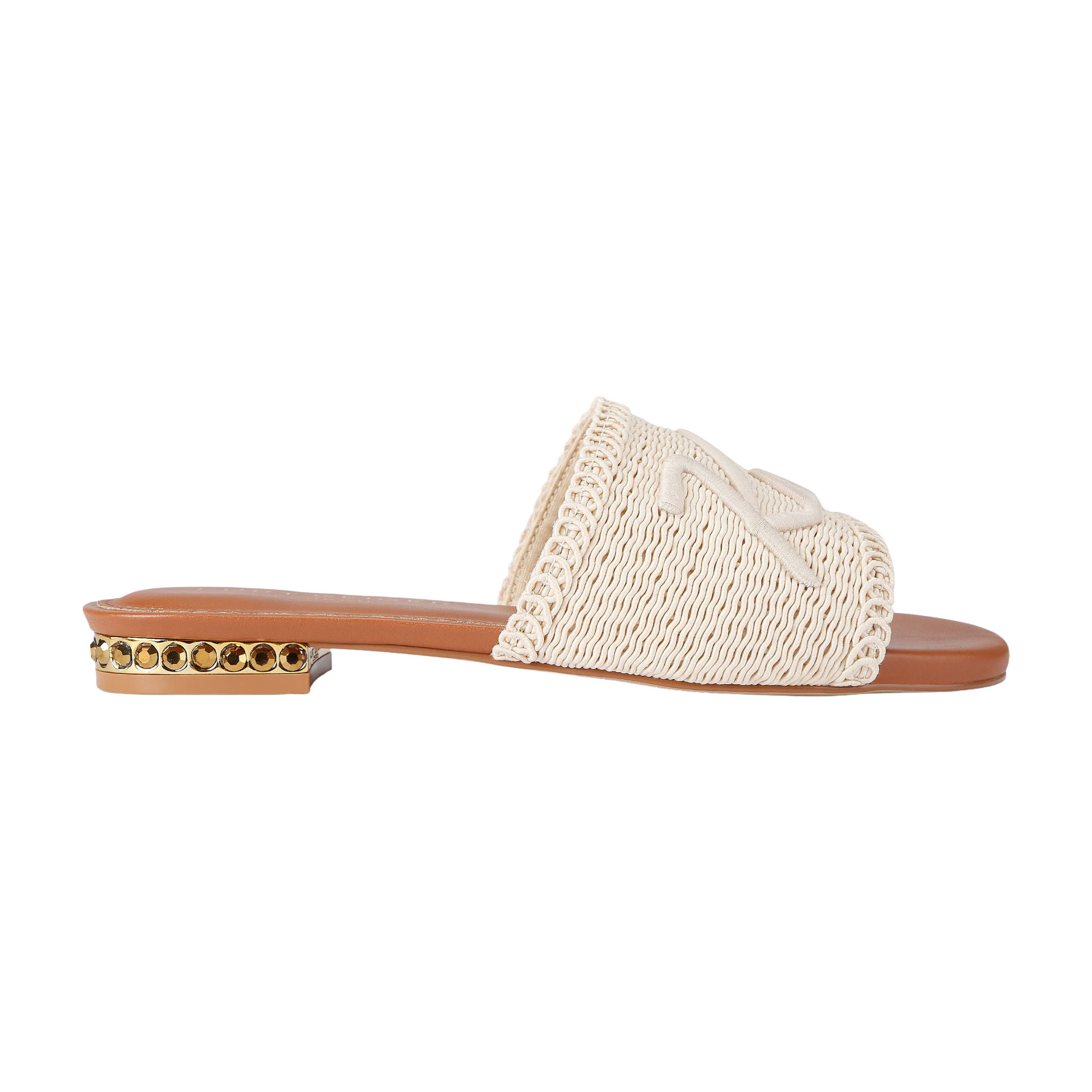 - Flat sandal design, fabric upper, embroidered cursive branding on strap, brass crystal embellished heel