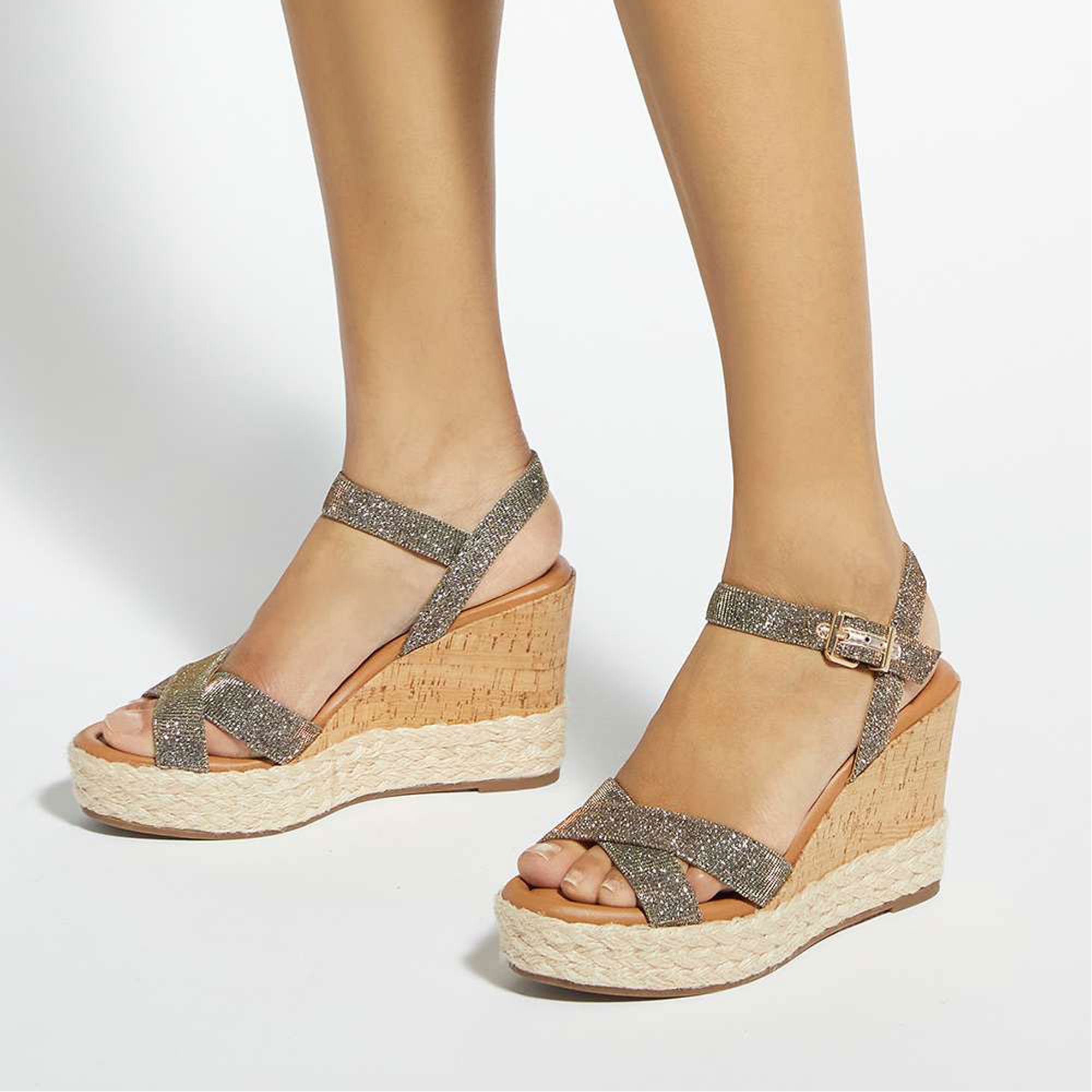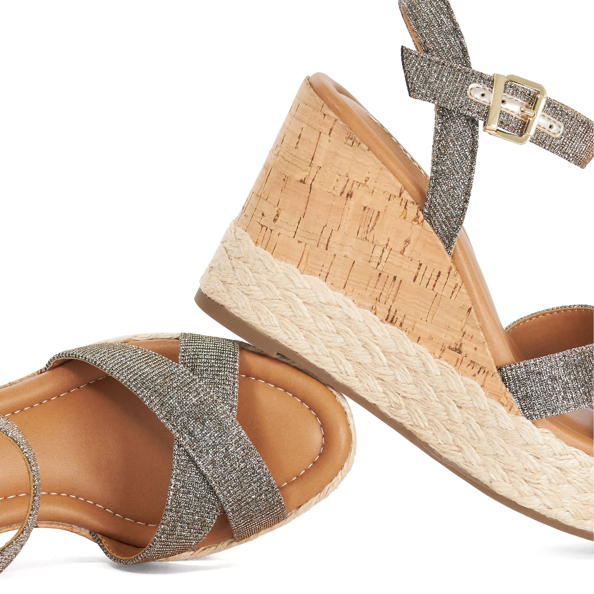 - Cross-strap silhouette, visible stitching, buckled two-part strap, wedge heel