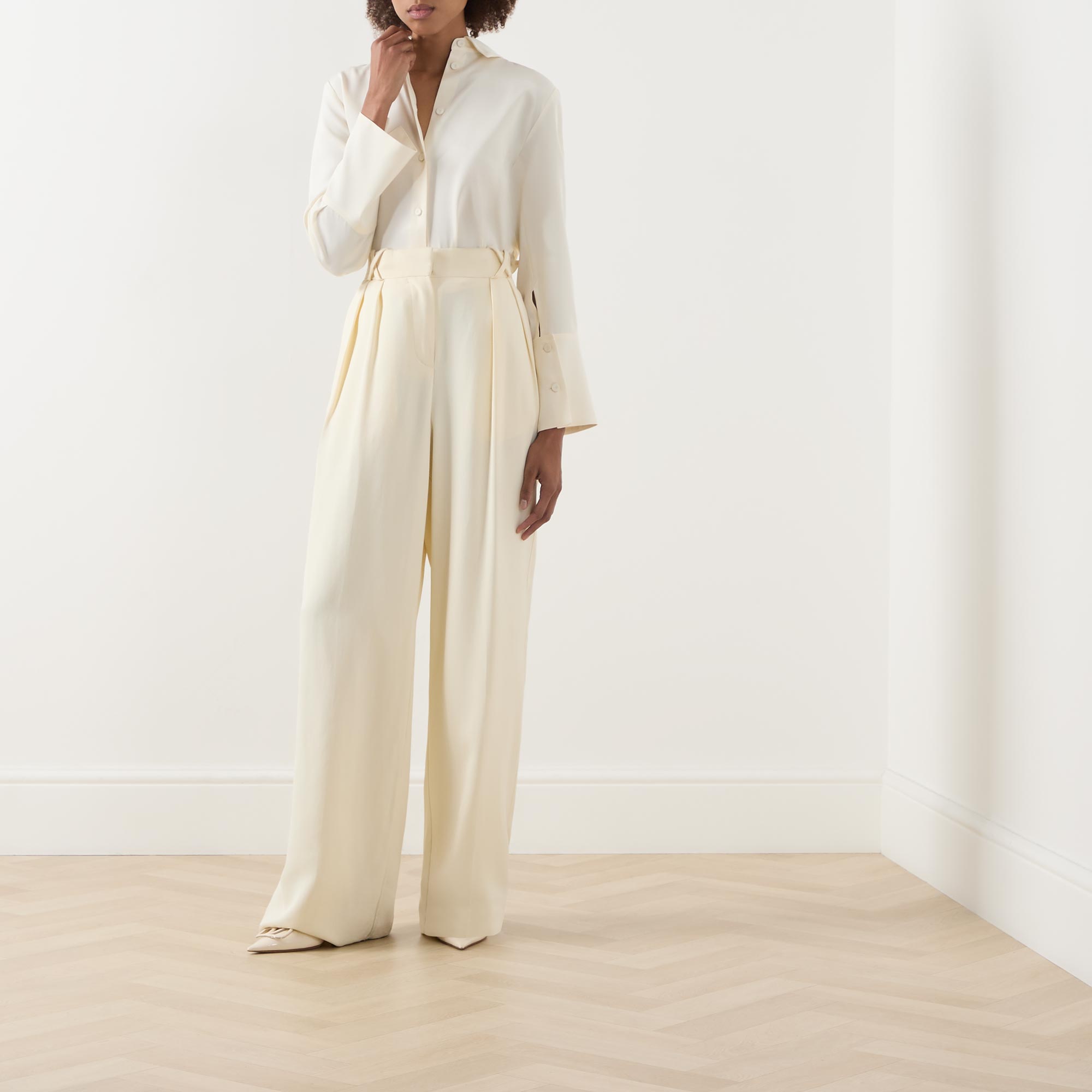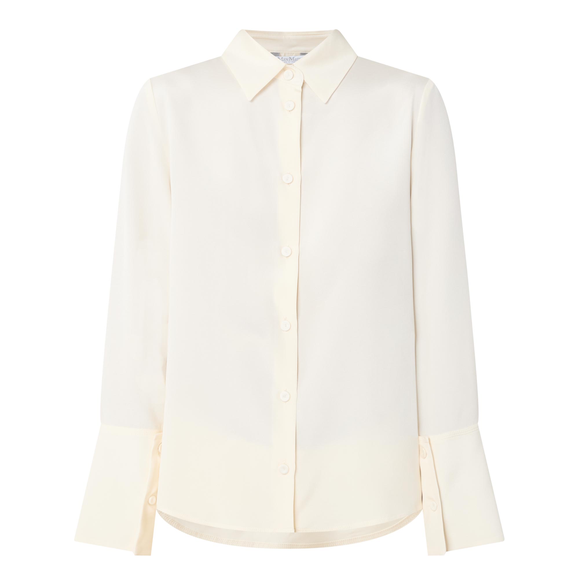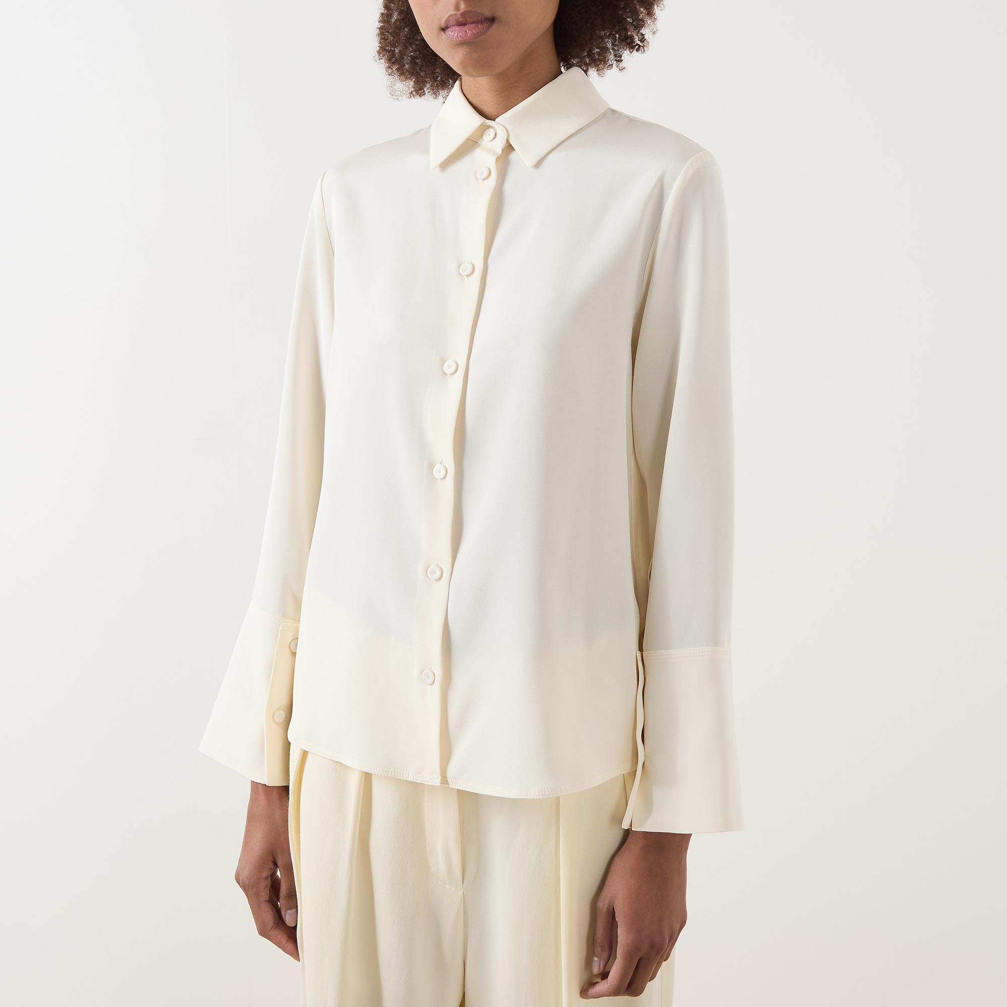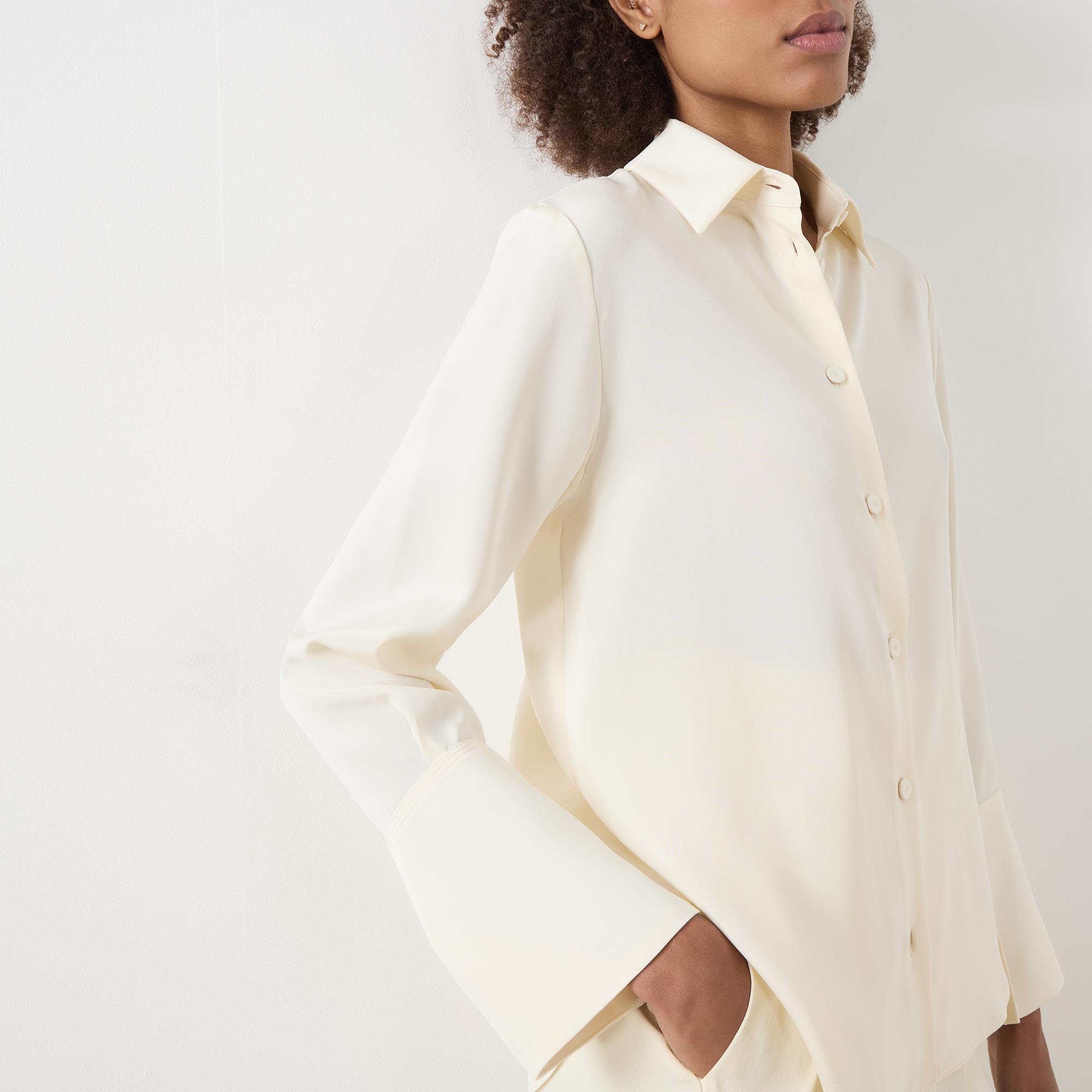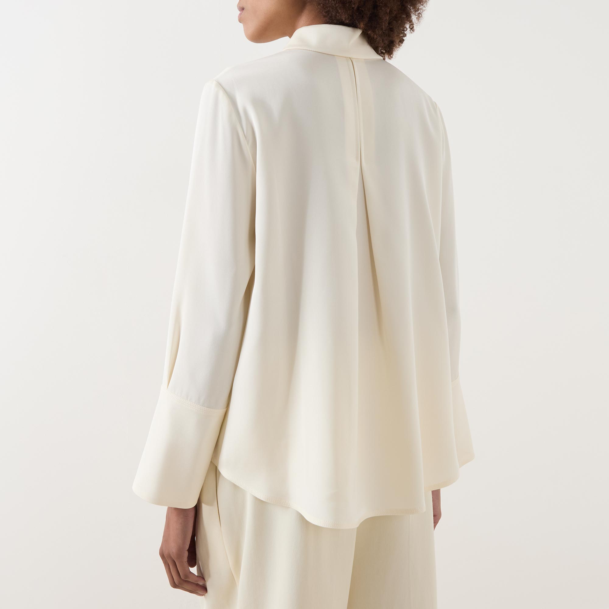 - Point collar, long sleeves, flared cuffs with button fastenings, front placket, rear knife pleat, curved hemline, smooth finish