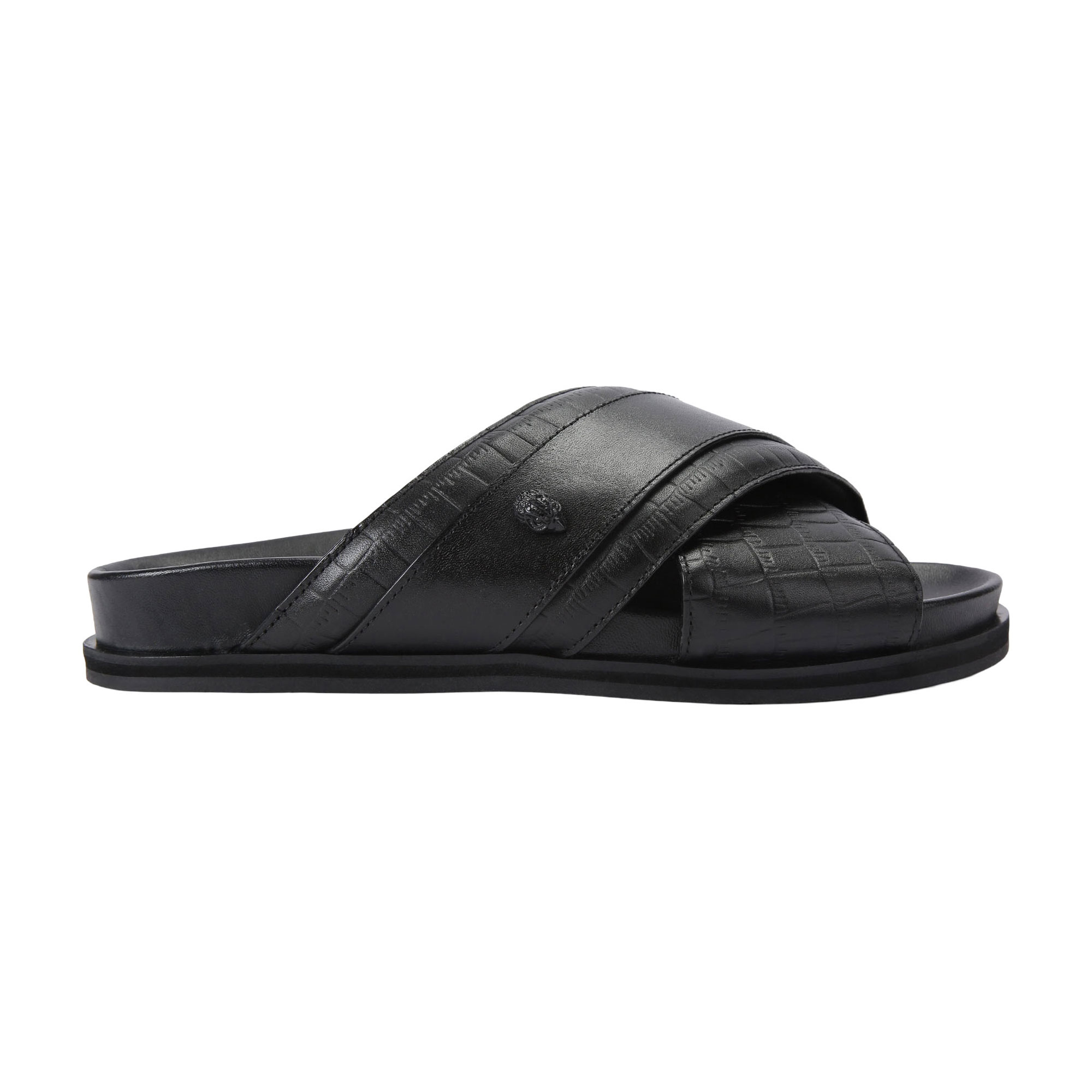 • Leather upper, faux-croc embossing details, eagle head charm, crystal embellishment, foot straps