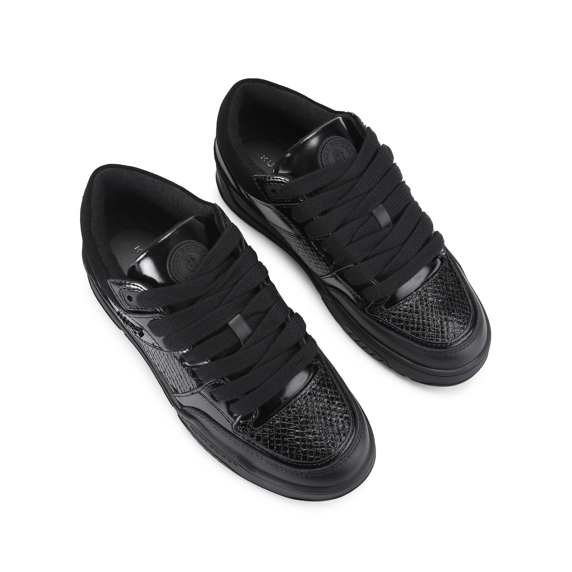 - Snake-embossed leather, front lace-up fastening, blind eyelets, rubber branded tongue patch