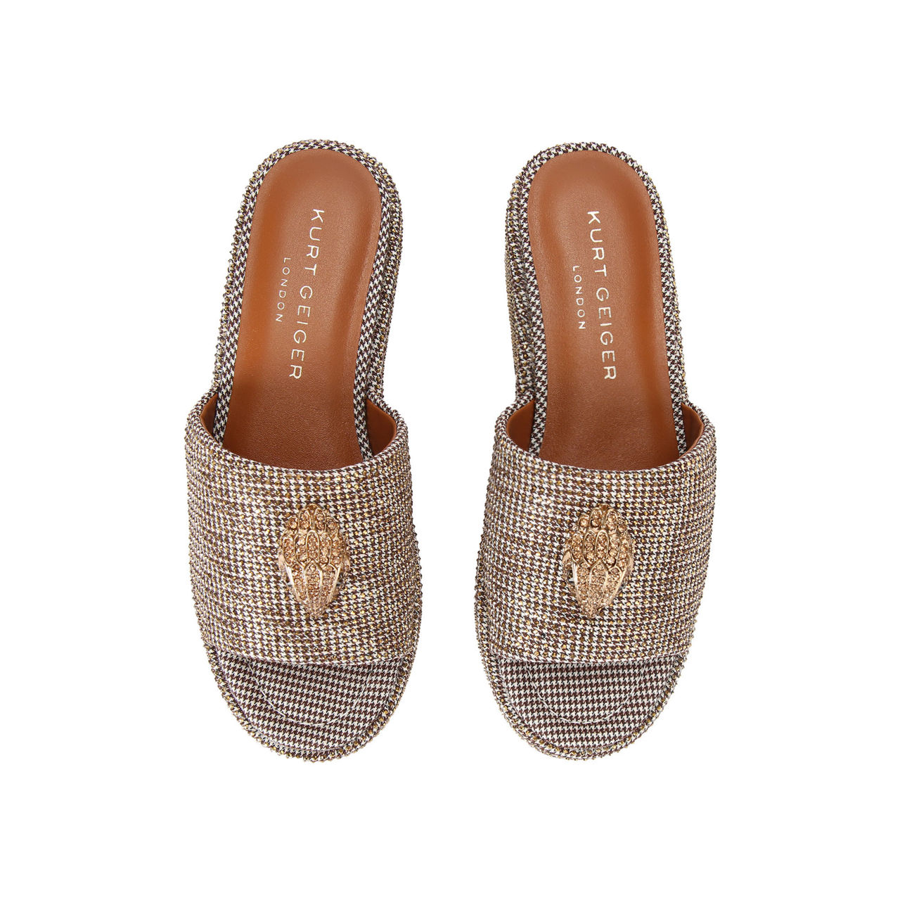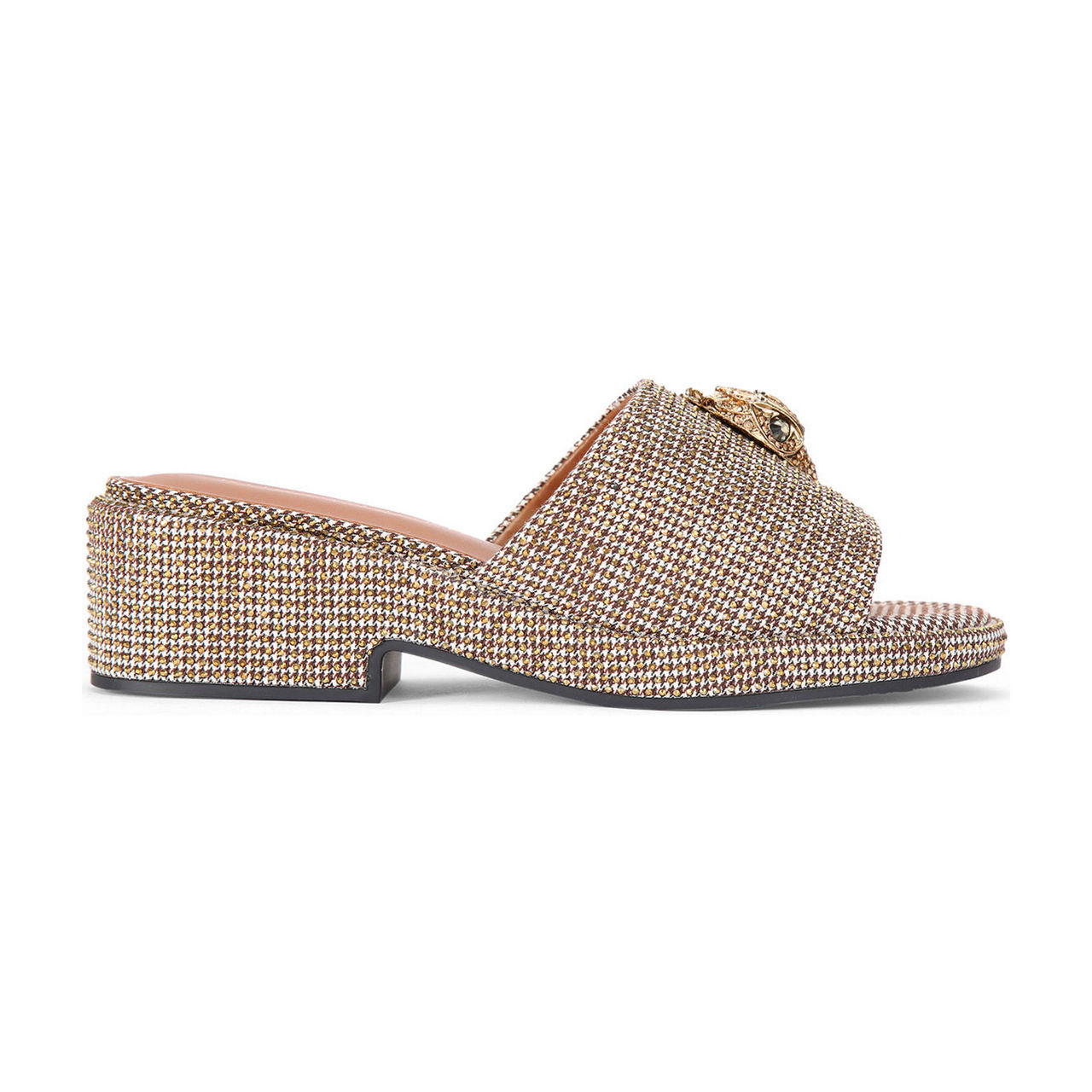 - Block heel, wide strap, tweed effect finish, gold-tone eagle embellishment, slip-on style