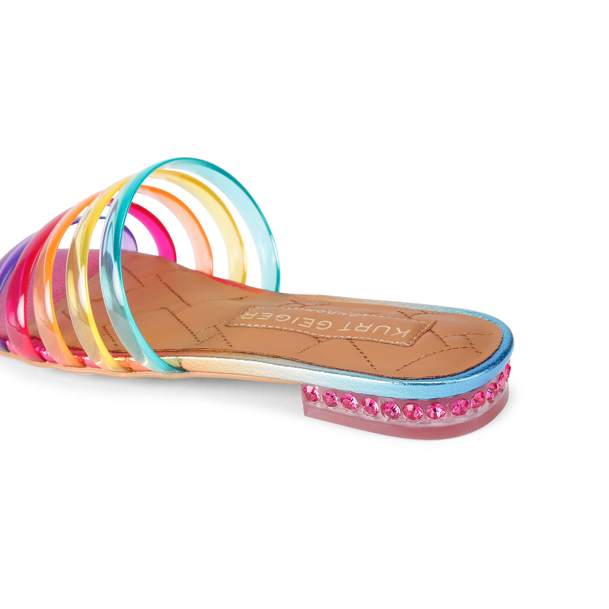 - Slip-on style, five semi-transparent rainbow straps, ombre pebble grained fabric footbed, crystal-embellished heel