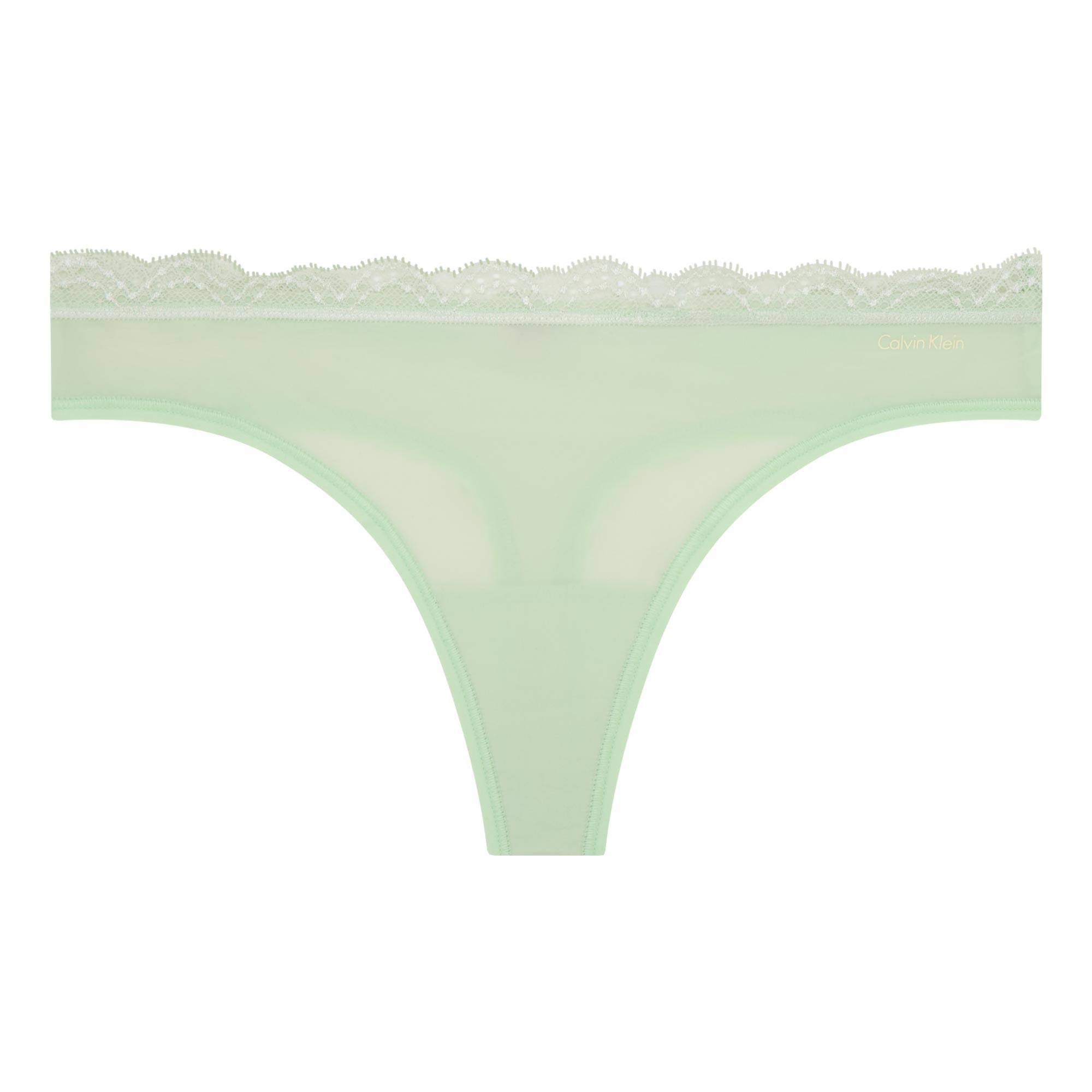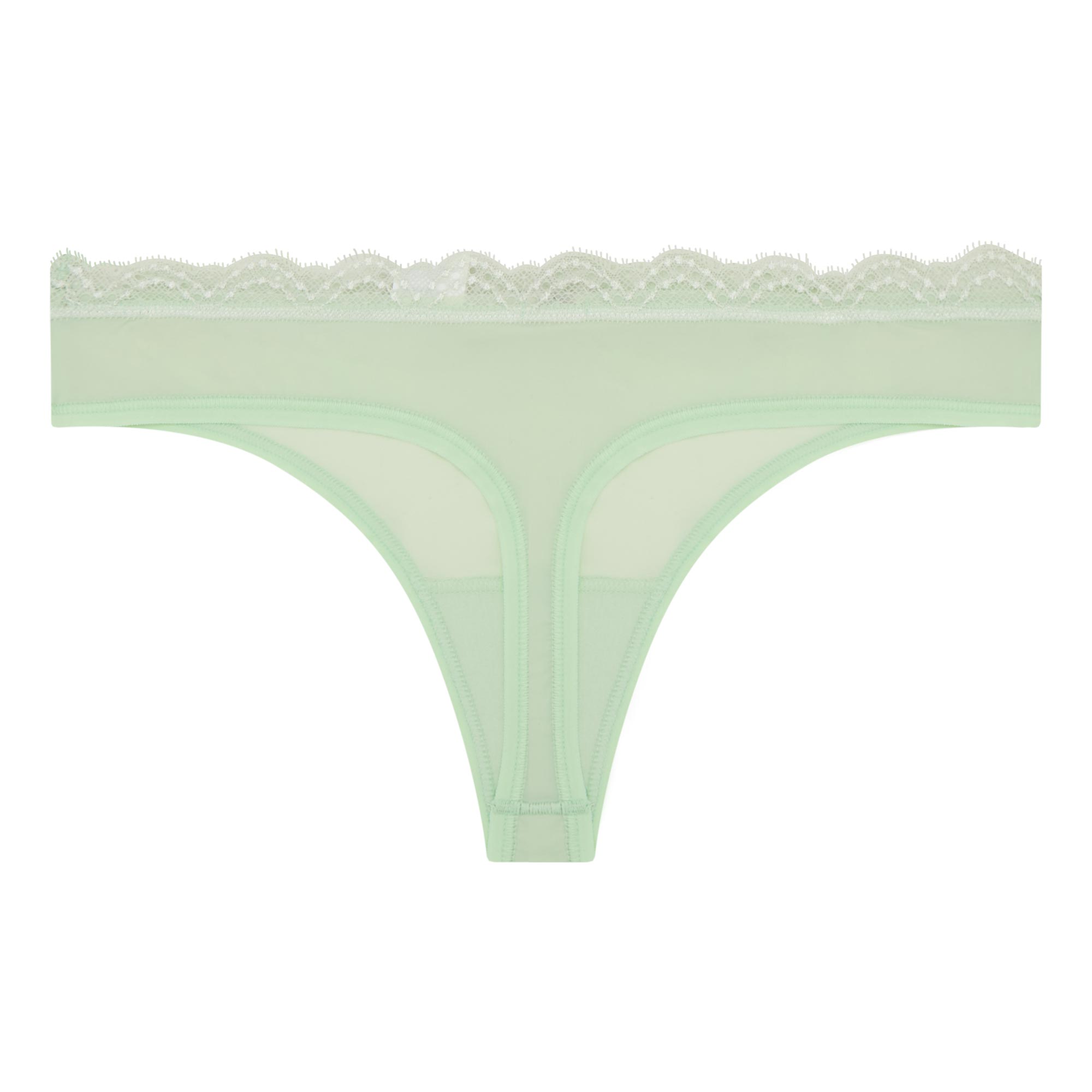 - Low-rise waist, thong style, scalloped stretch-lace waistband, no-show flat edges, stretch-fused fabric