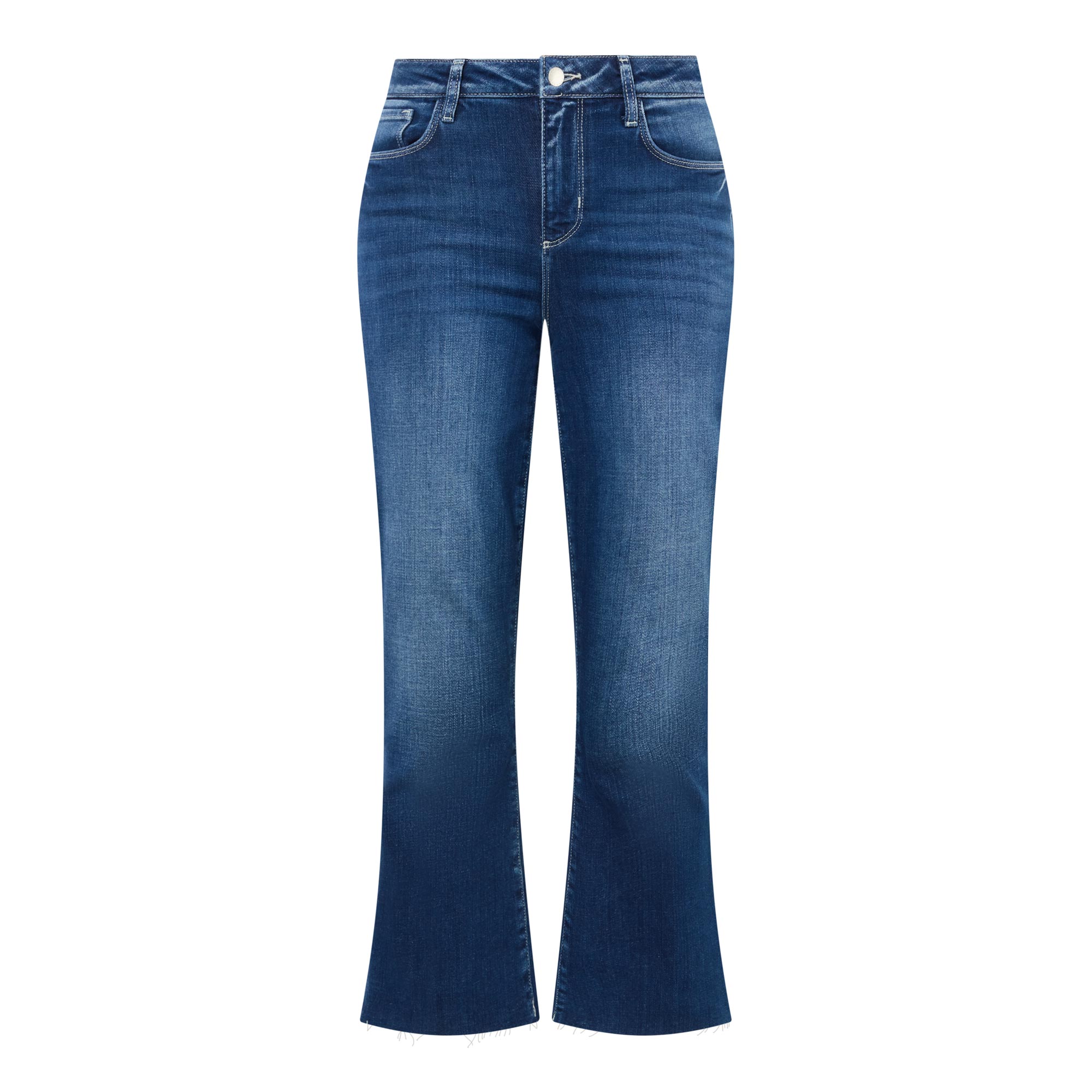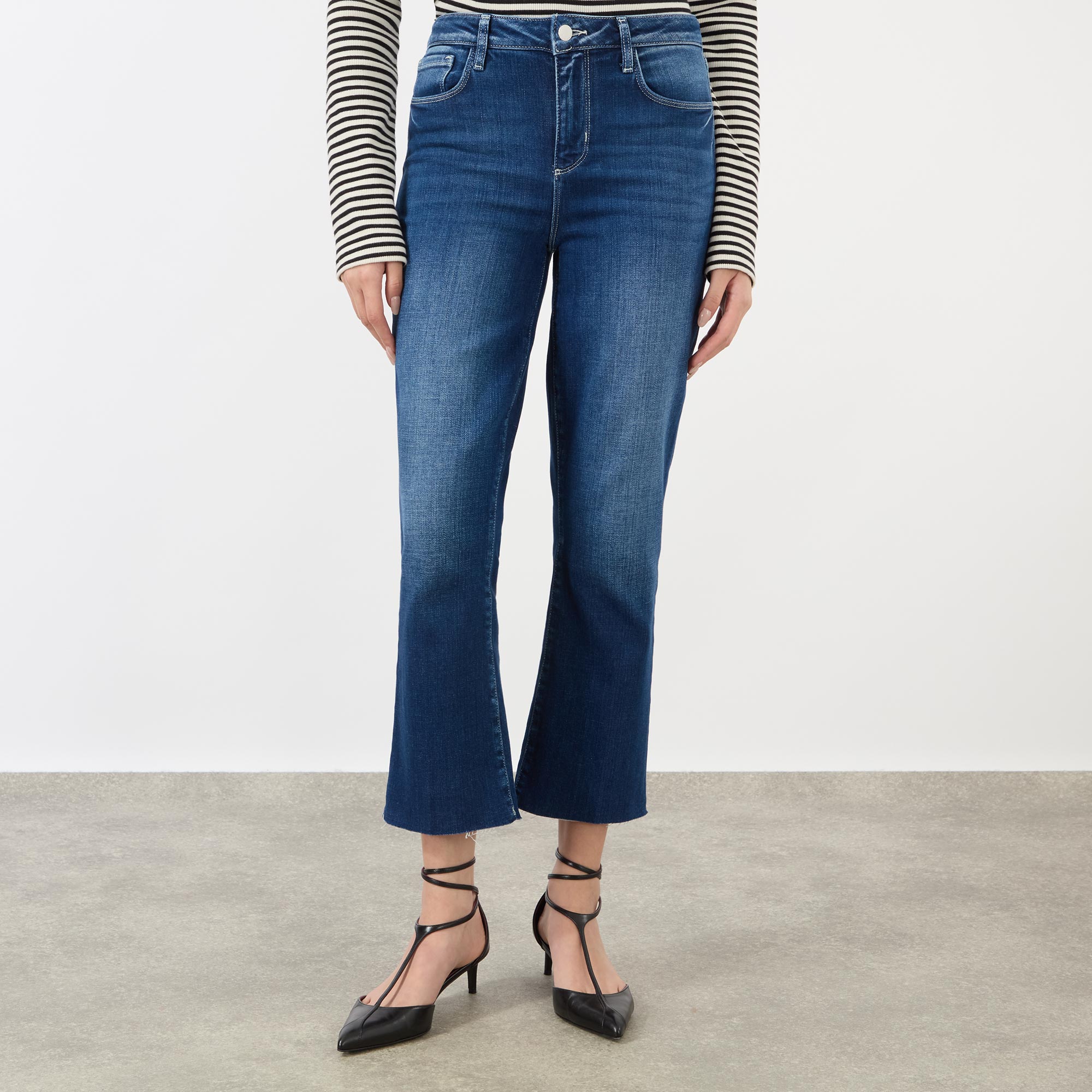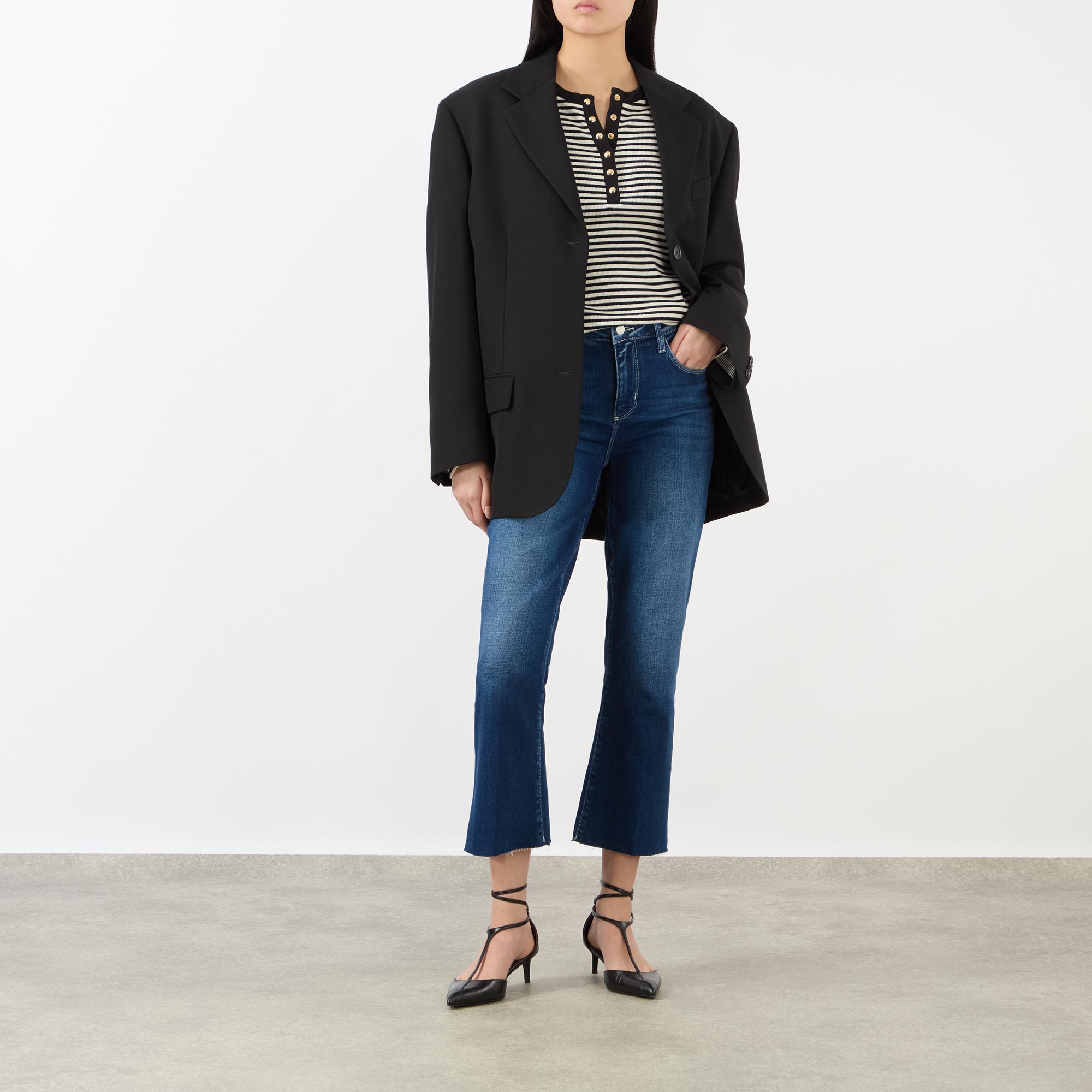• Button and fly zip fastening, belt loops, five-pocket style, flared-cut leg, whiskering and faded details, subtle stretch denim