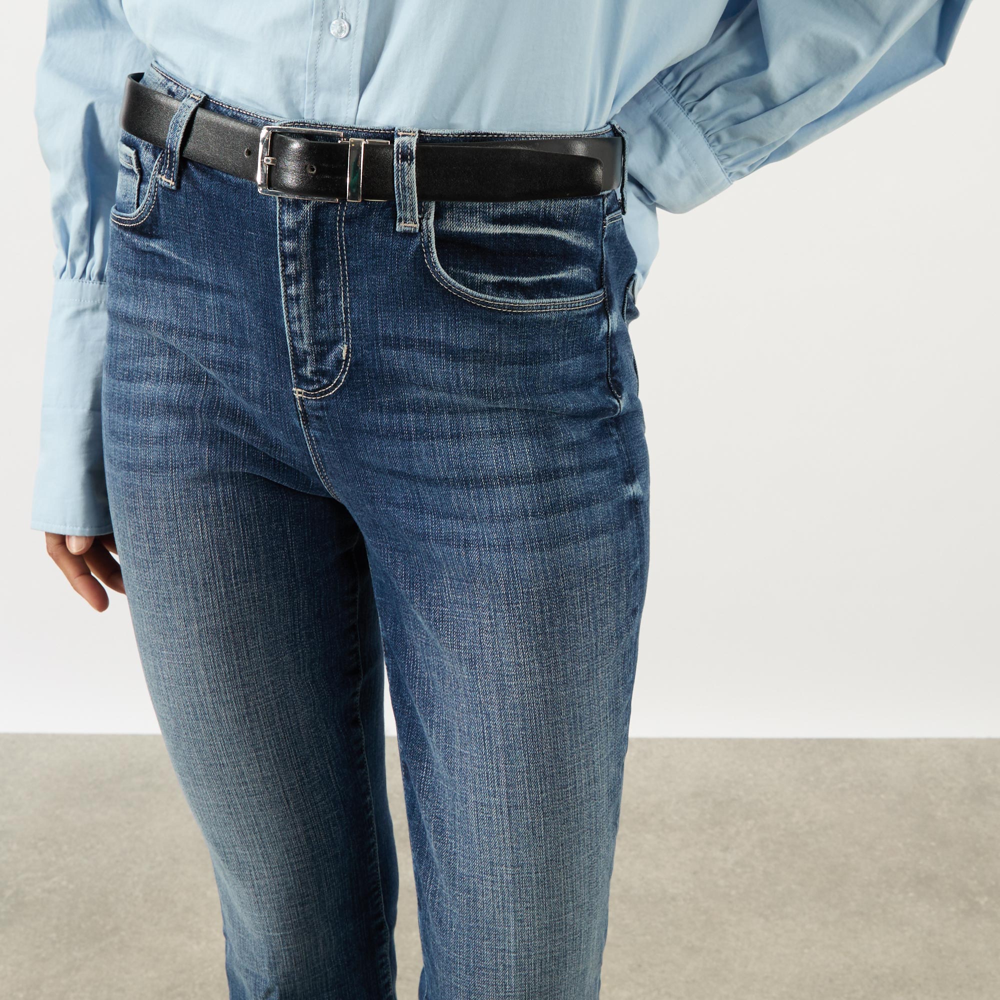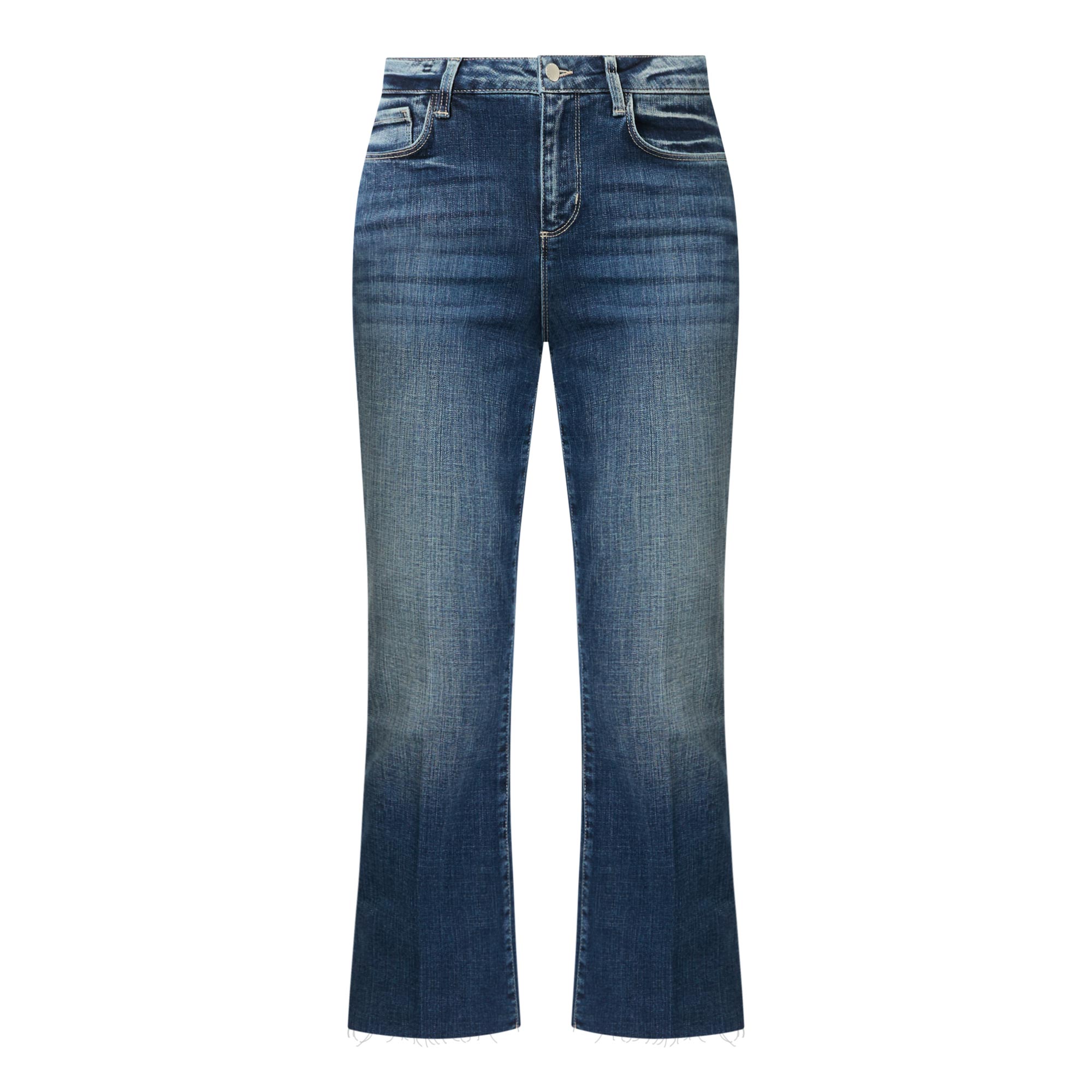 • Zip-fly and button fastening, belt loops, five-pocket design, contrast tobacco stitching, pressed creases, high-rise, flared-cut leg, frayed hems, whiskering and faded patches, smooth denim finish