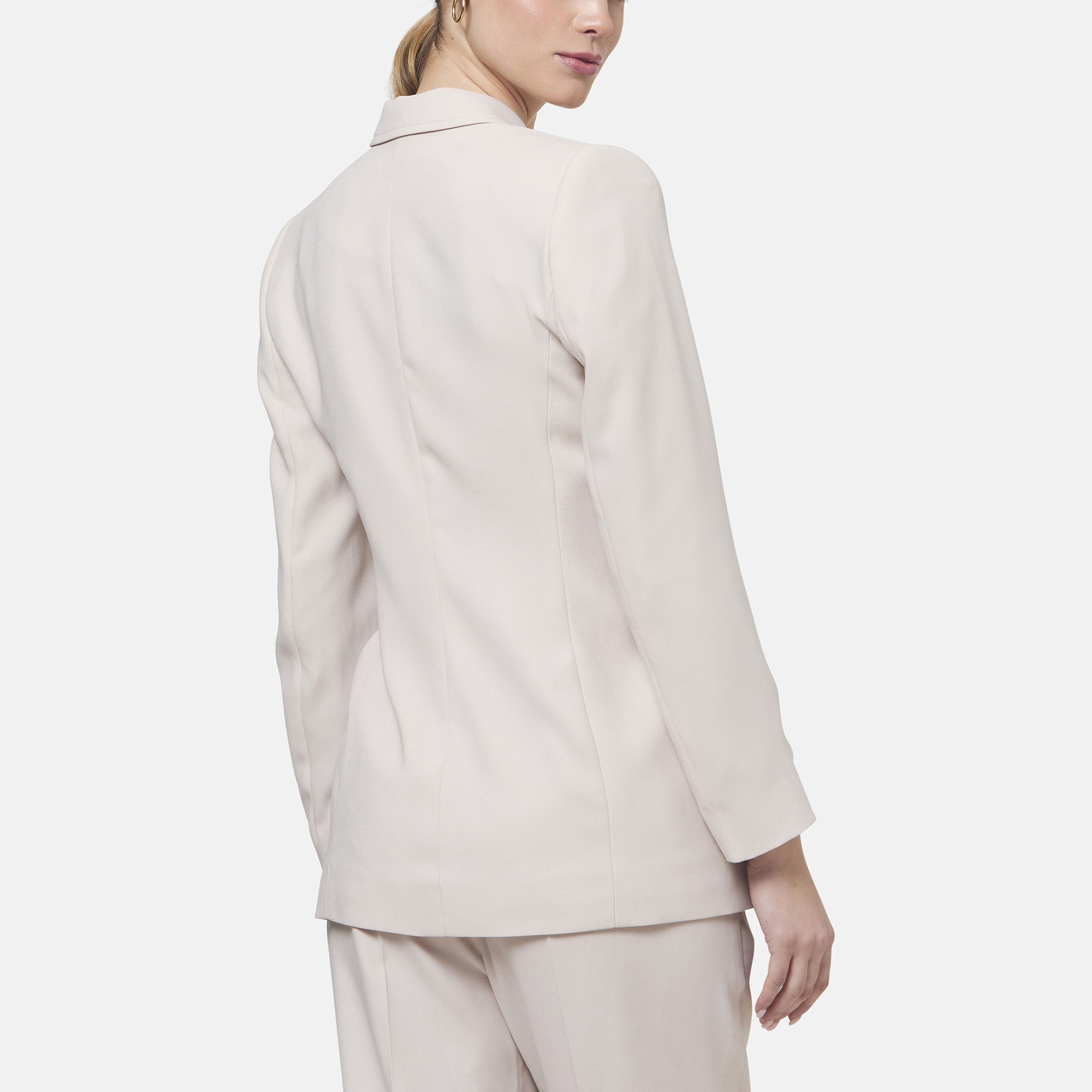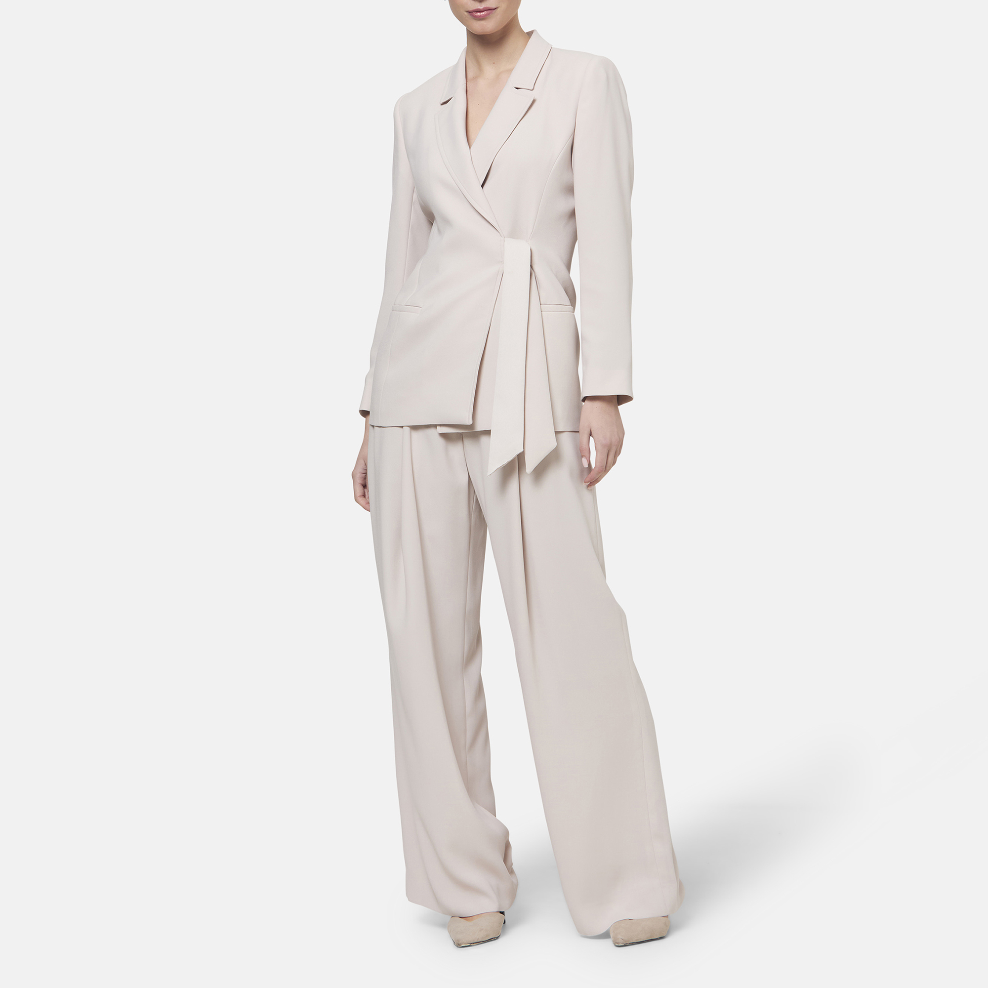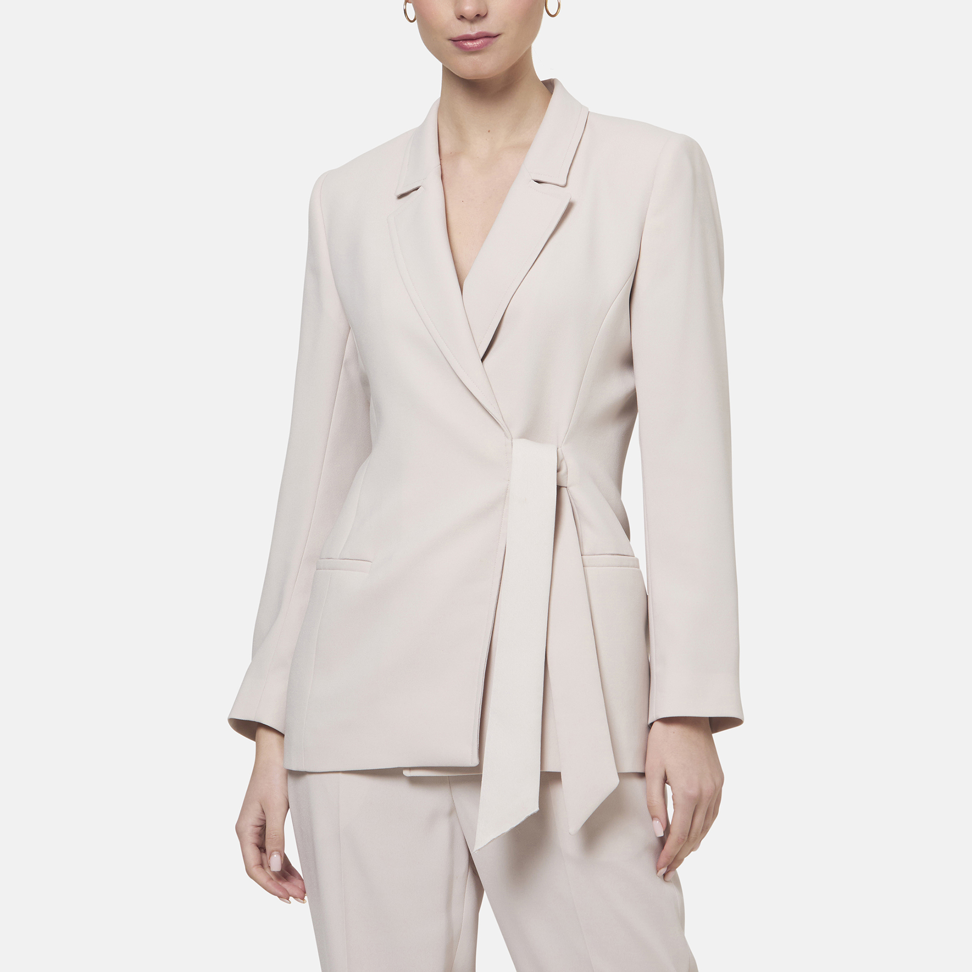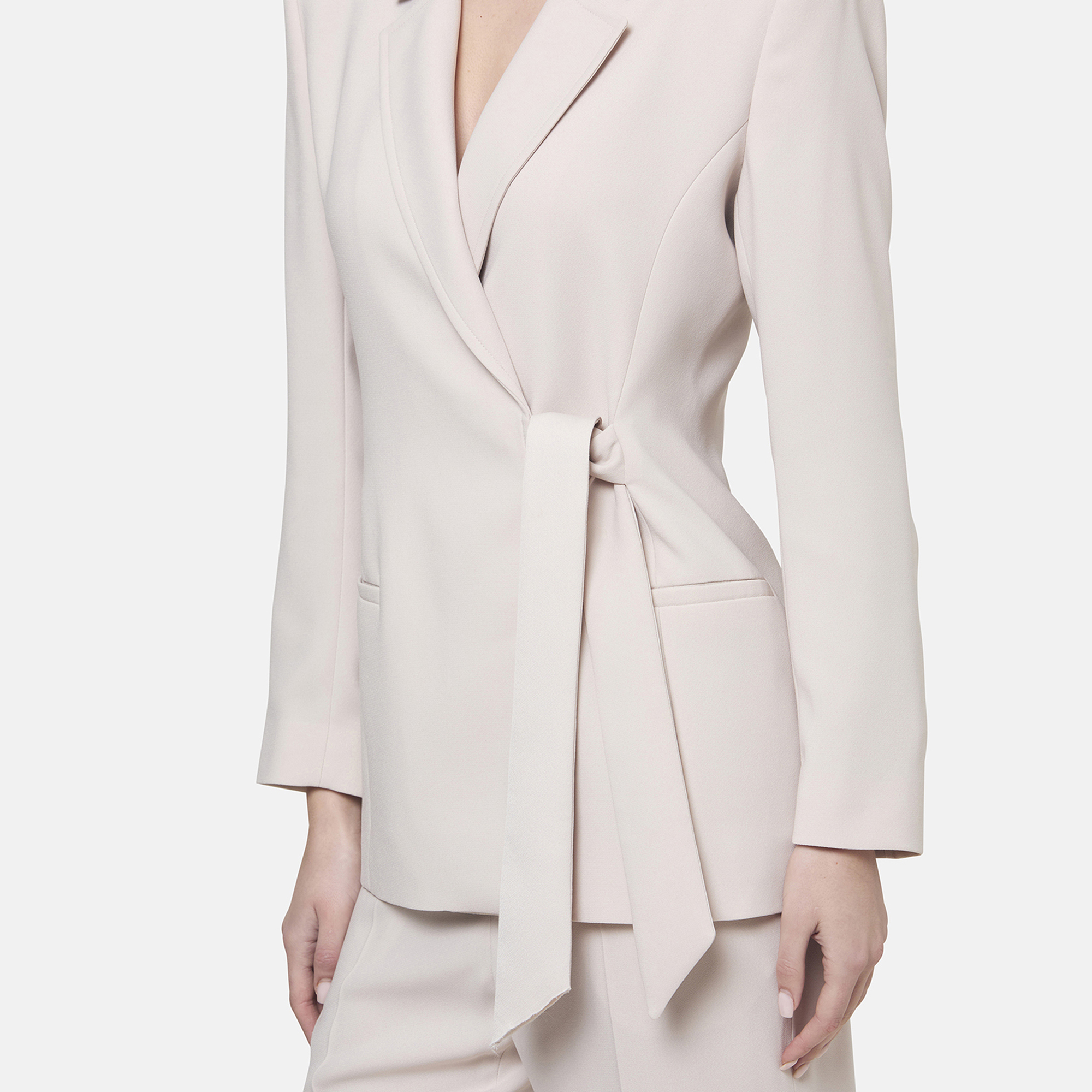 • Semi-fitted silhouette, satin-back crepe fabric, notched collar and revere, self-tie fastening