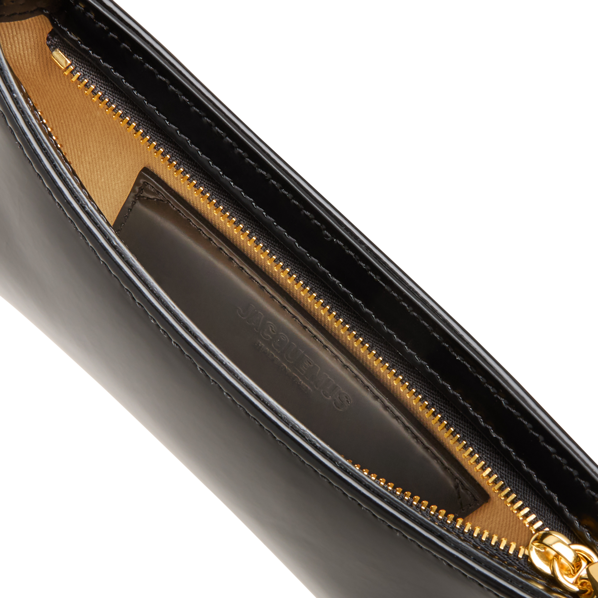 - Top zip fastening, chain shoulder strap, structured silhouette, logo lettering, gold-tone hardware, tonal stitching, semi-patent finish