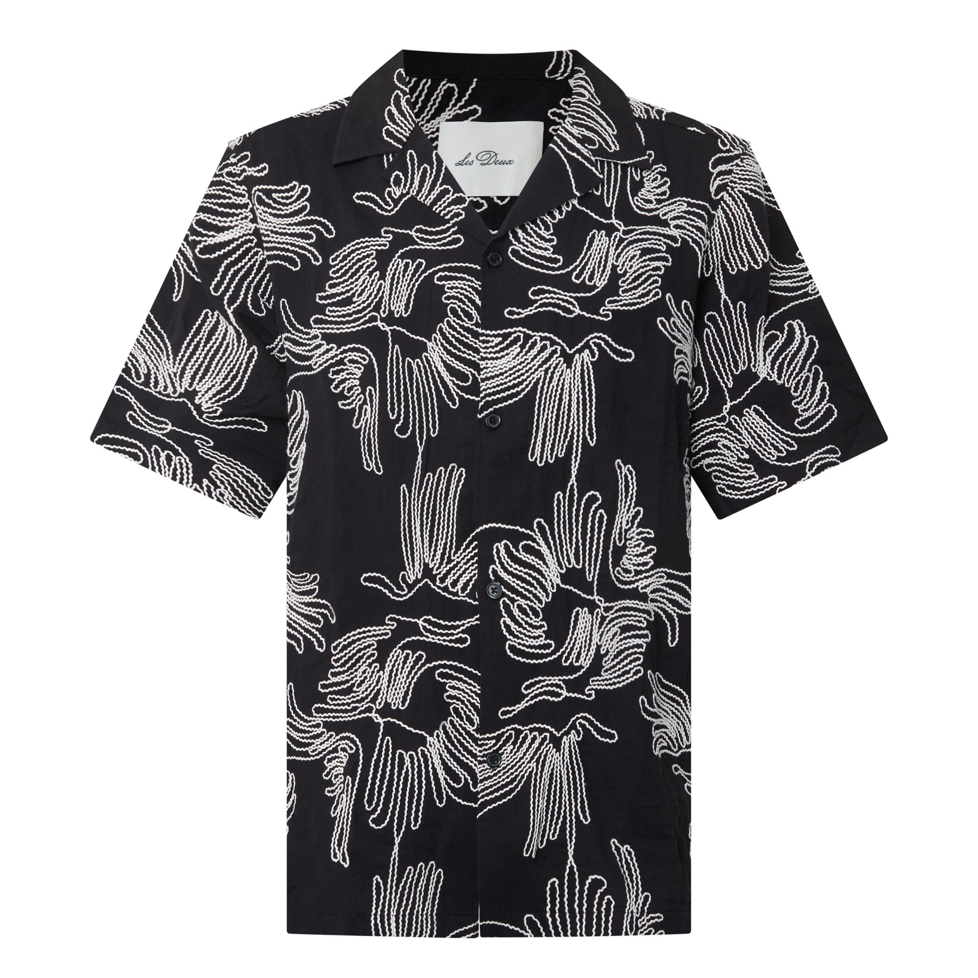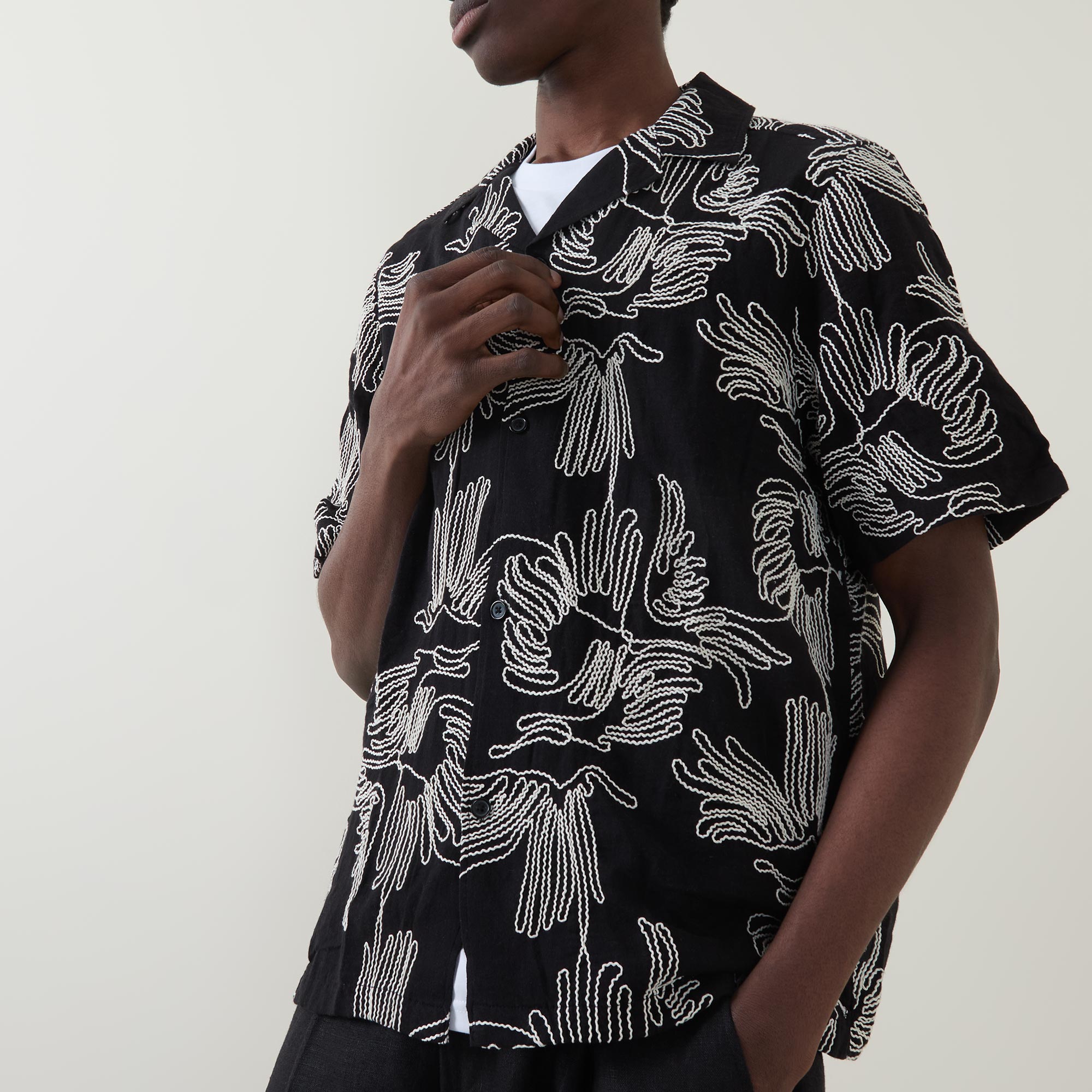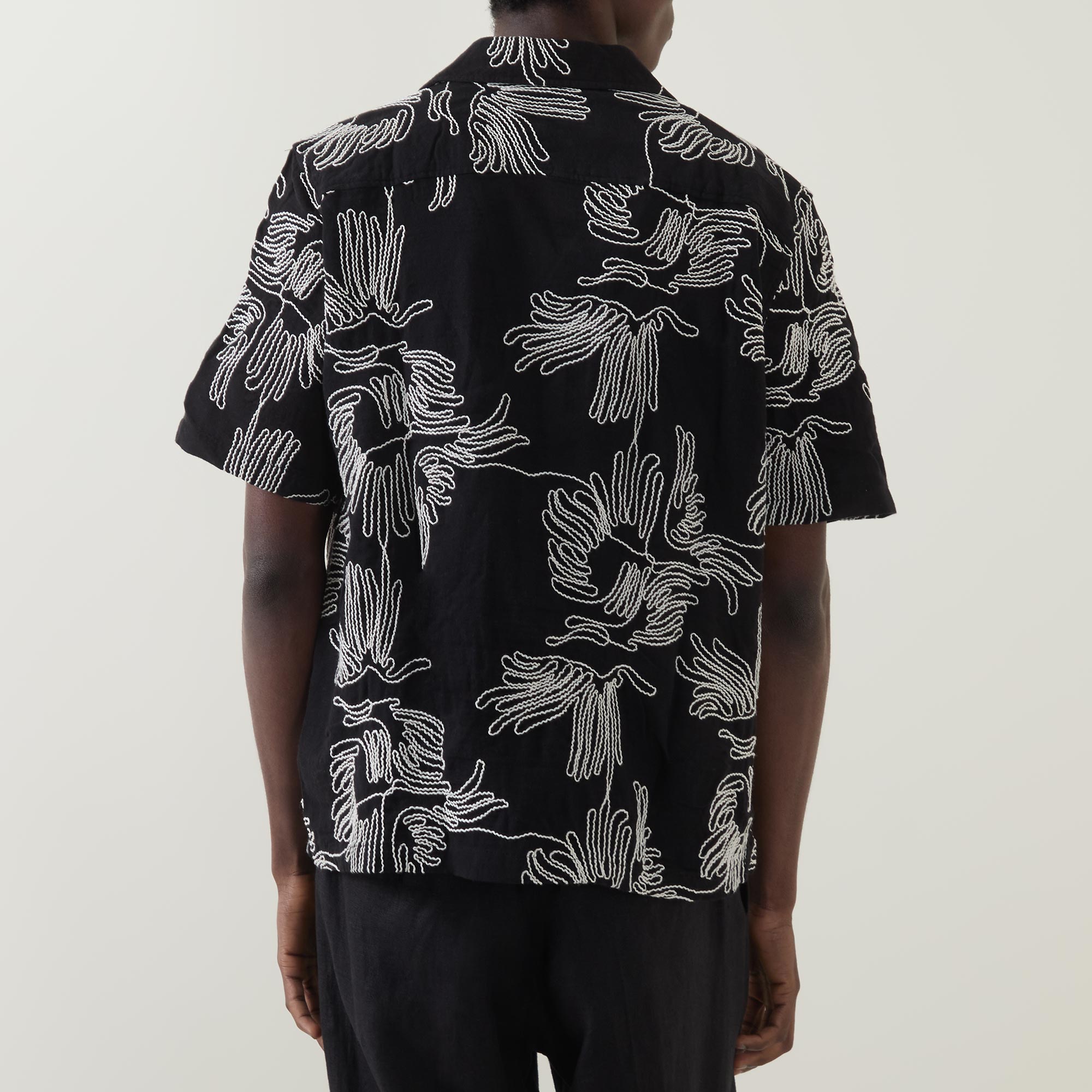- All-over contrast embroidery, floral design, camp collar, mother-of-pearl-style buttons, short sleeves, front button fastenings