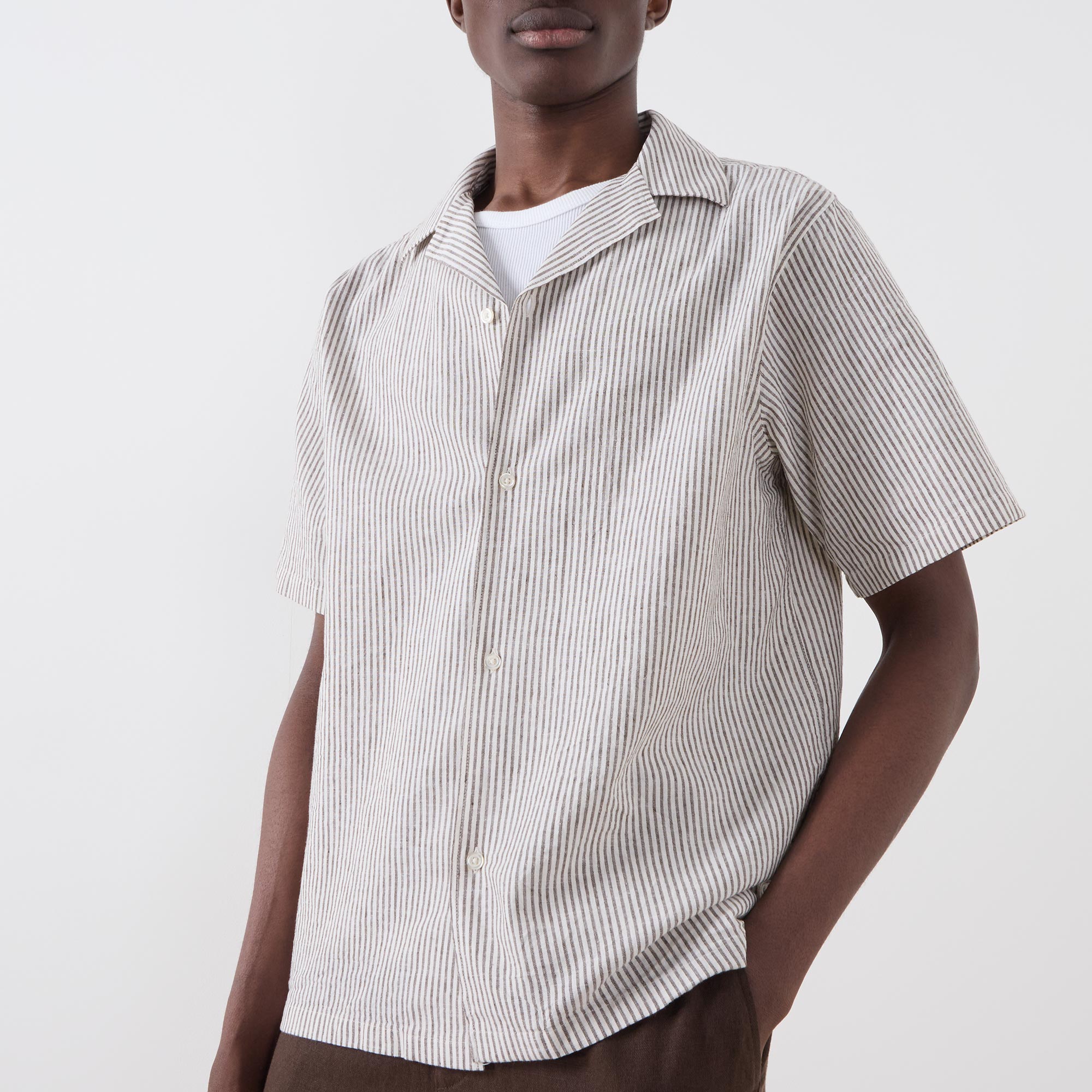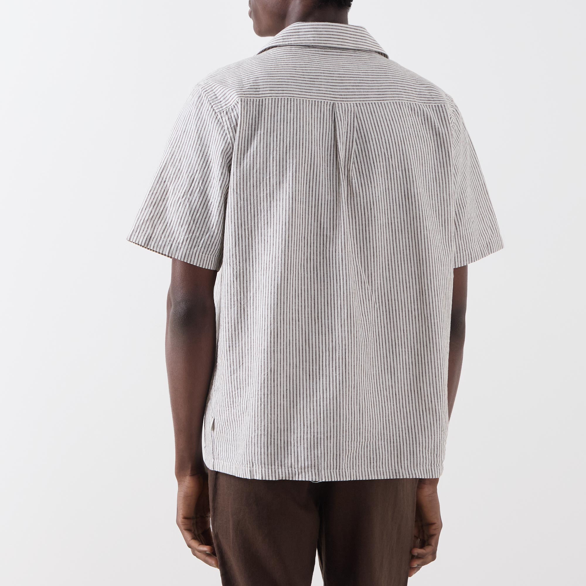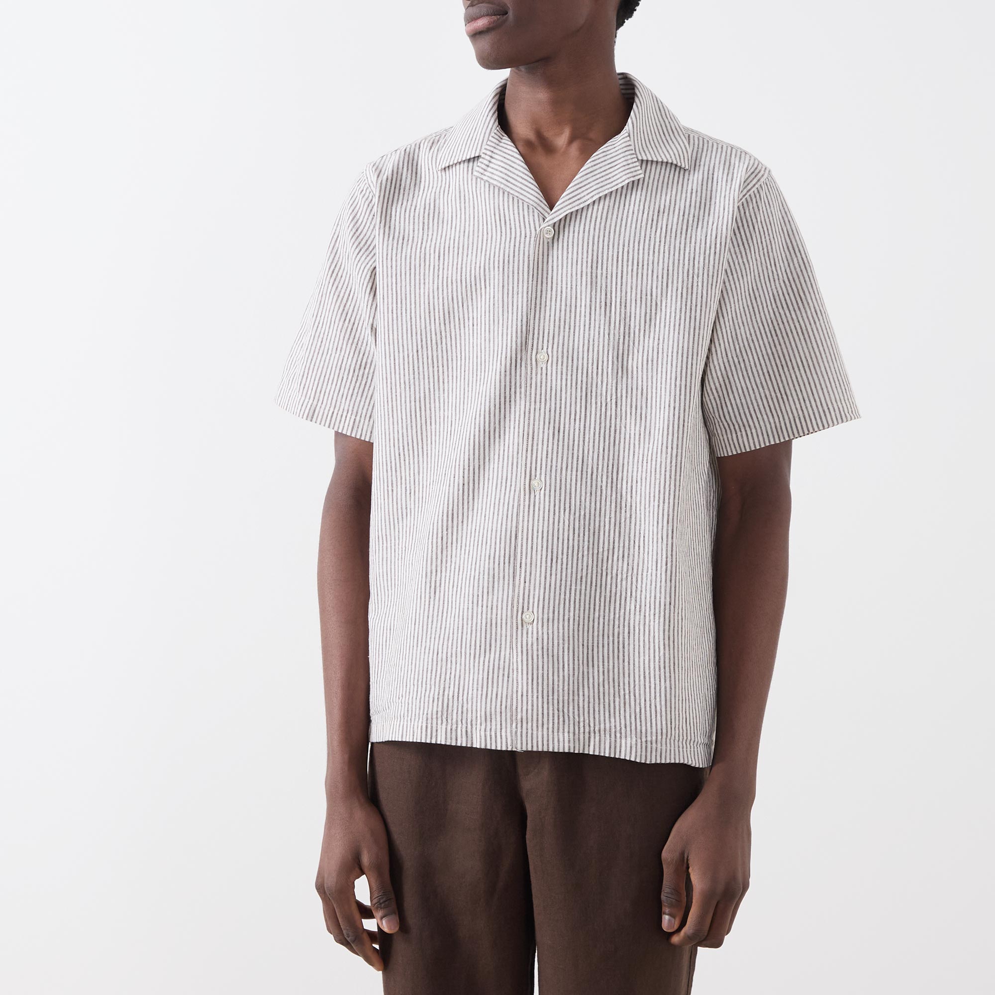 • Striped woven fabric, camp collar, front button fastenings, back yoke, box pleat, flag label at side seam, straight hem