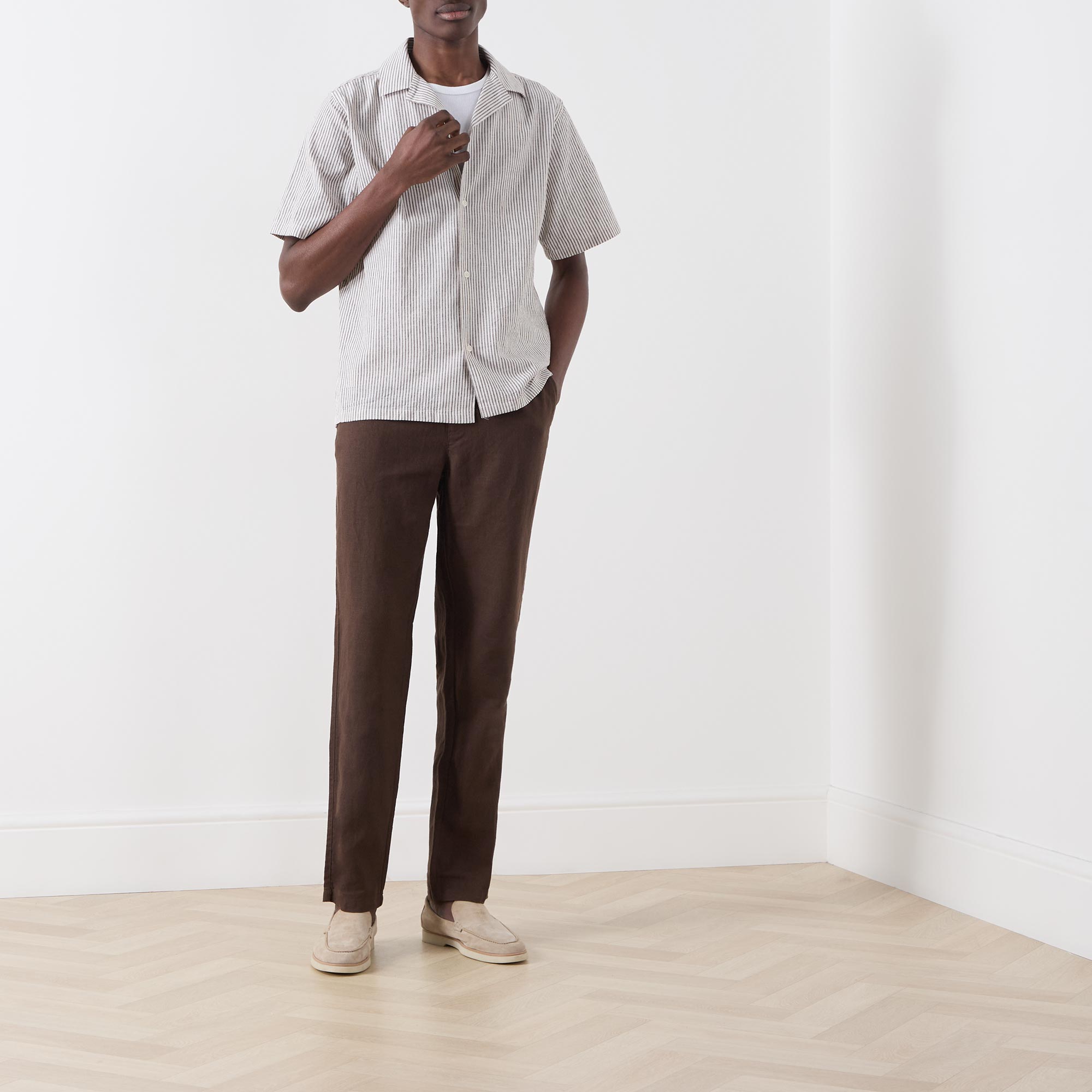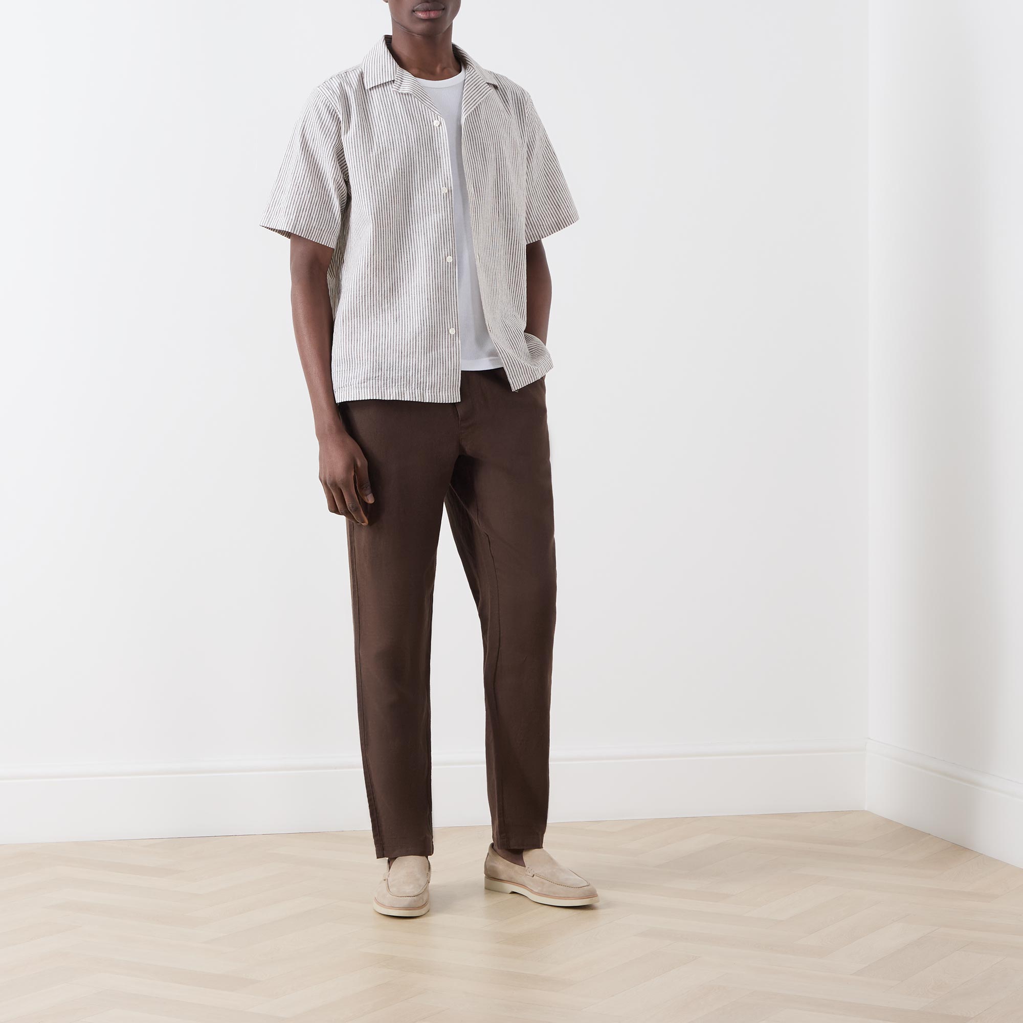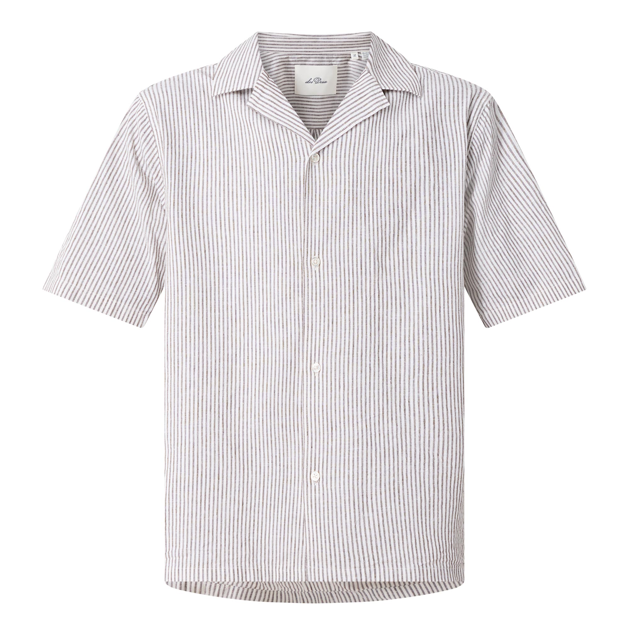 • Striped woven fabric, camp collar, front button fastenings, back yoke, box pleat, flag label at side seam, straight hem