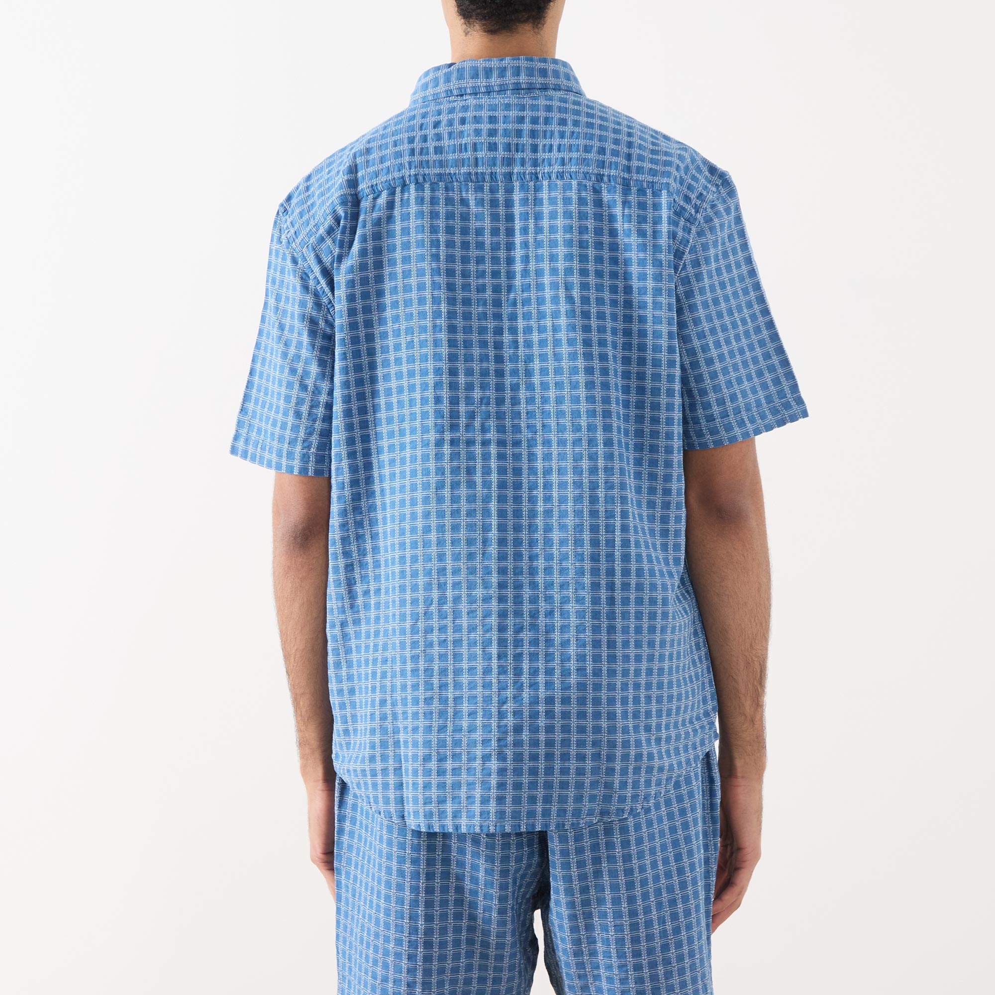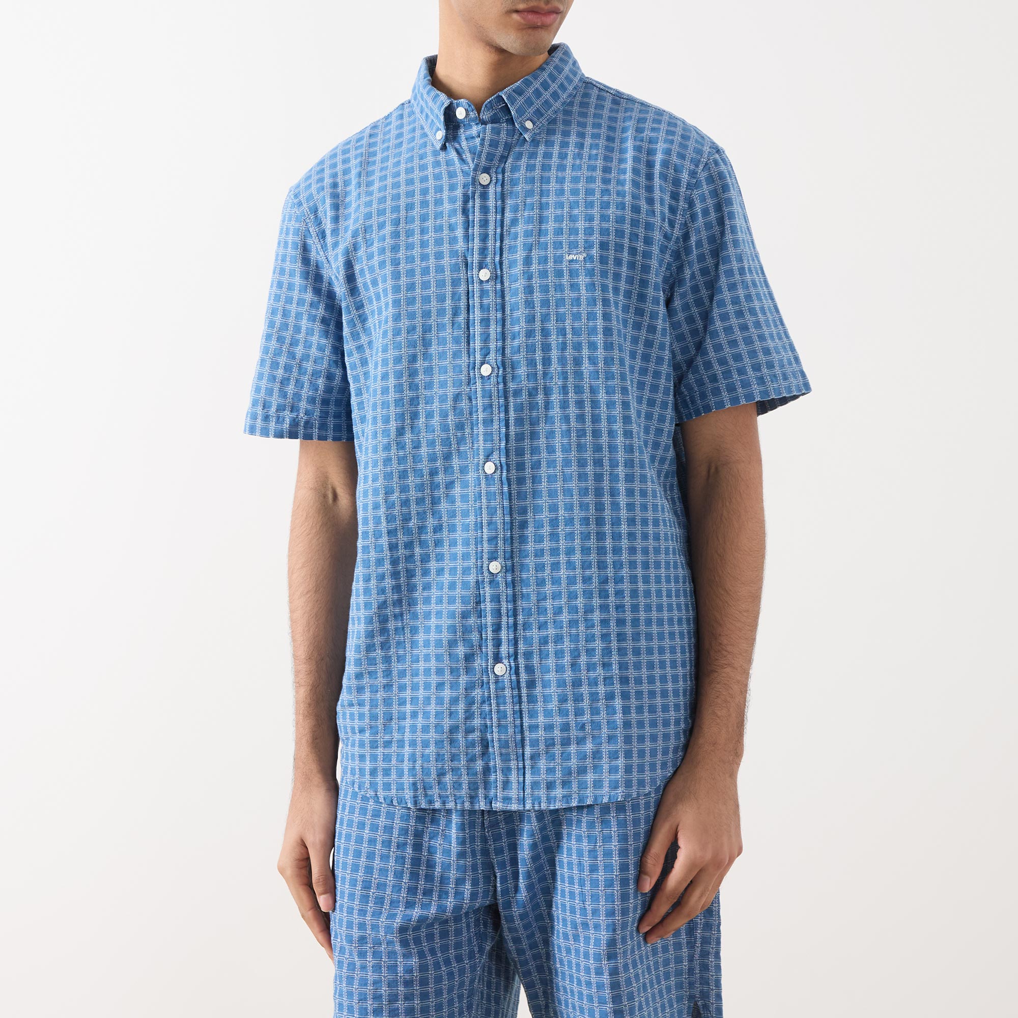- Button-down point collar, short sleeves, front button fastening, curved hem, embroidered logo detail on the chest, check pattern, seersucker finish