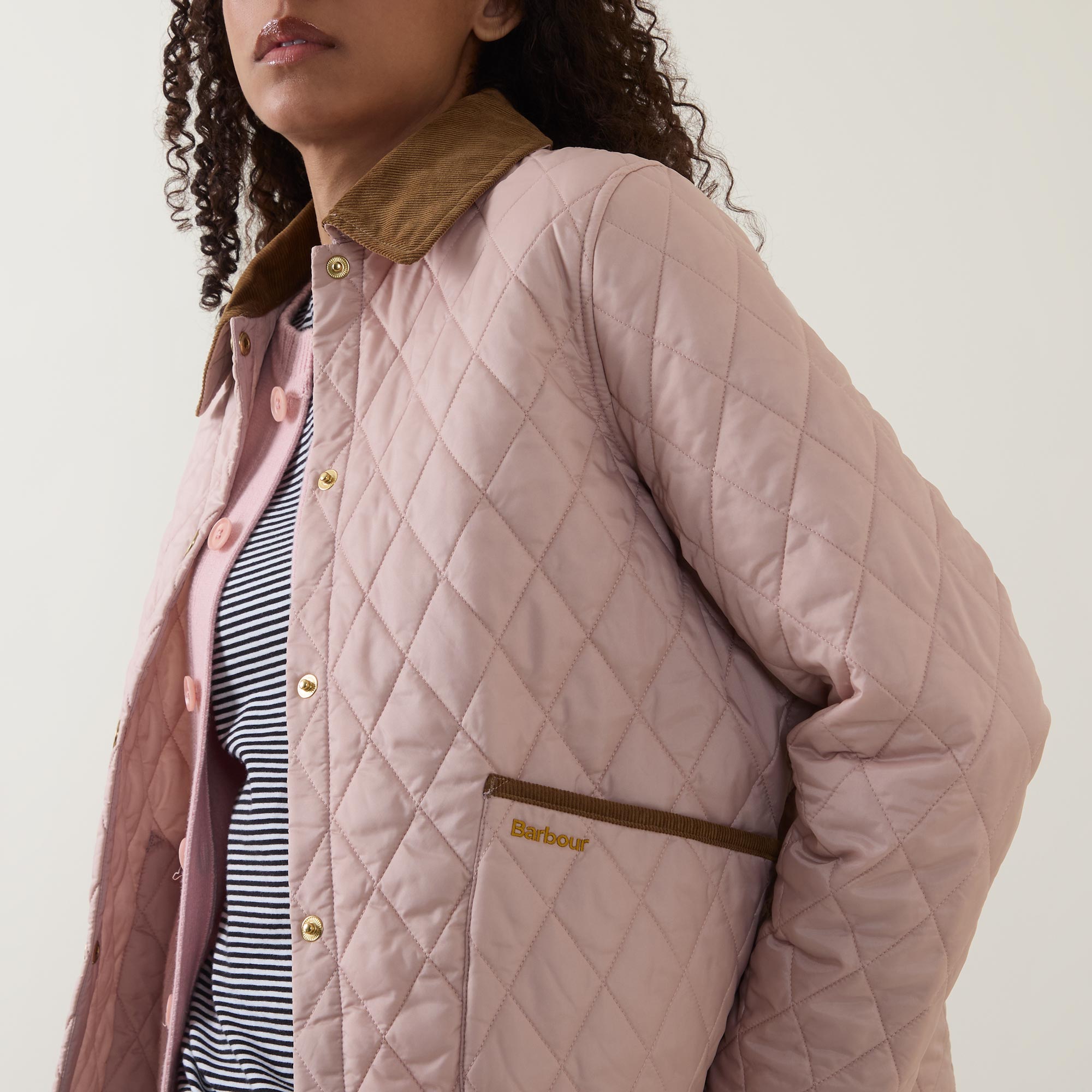 • Quilted design, corduroy collar, long sleeves, button fastenings, front slip pockets, straight hemline