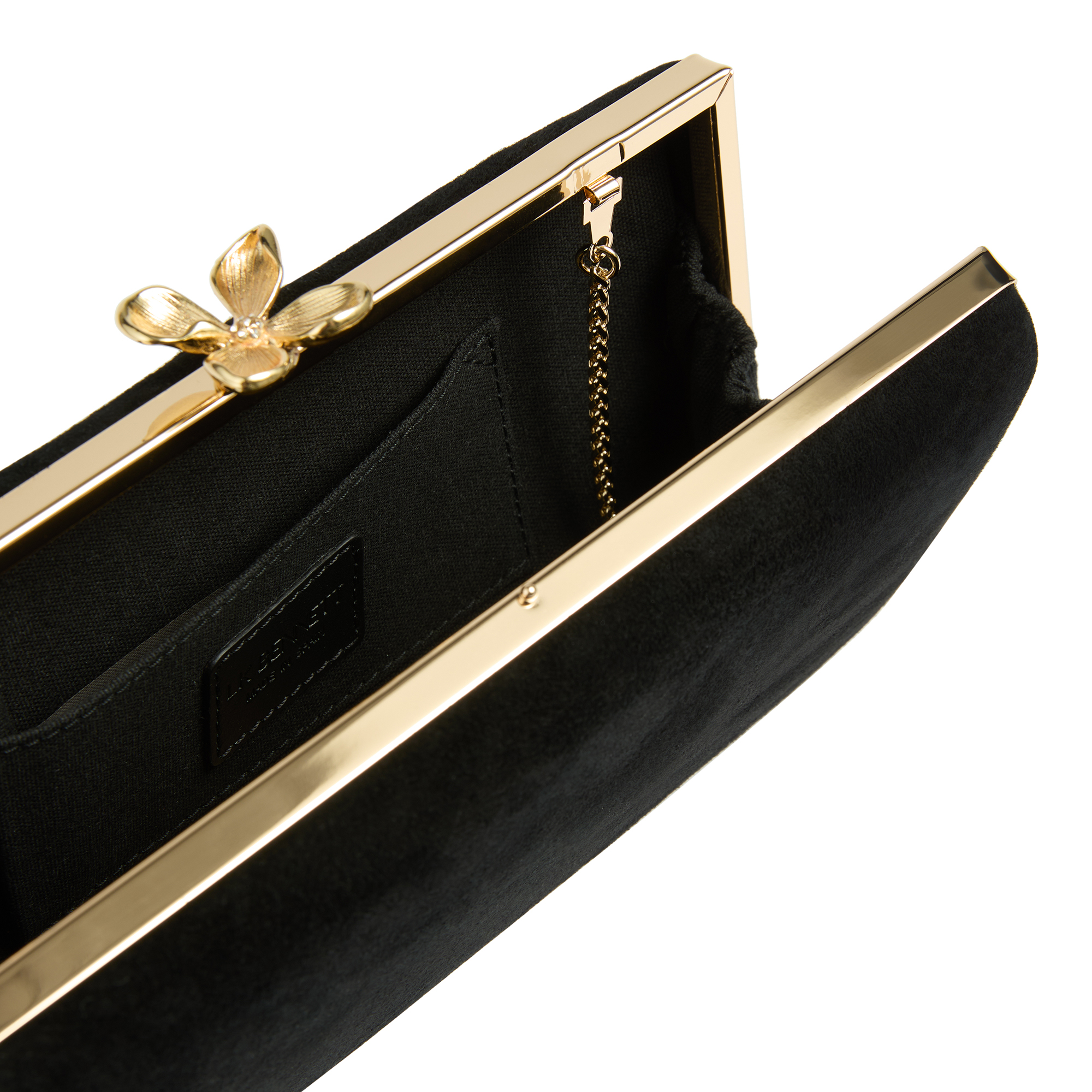 - Clutch style, suede finish, floral hardware clasp, gold-tone hardware, chain strap