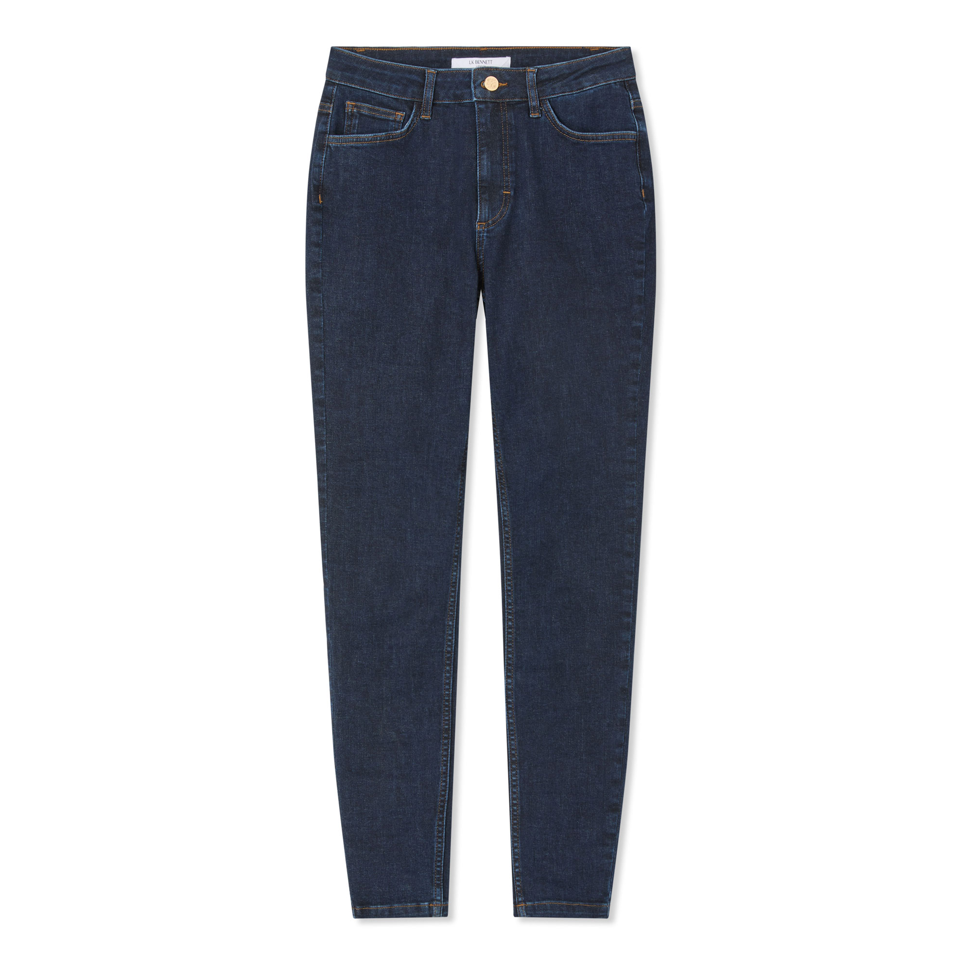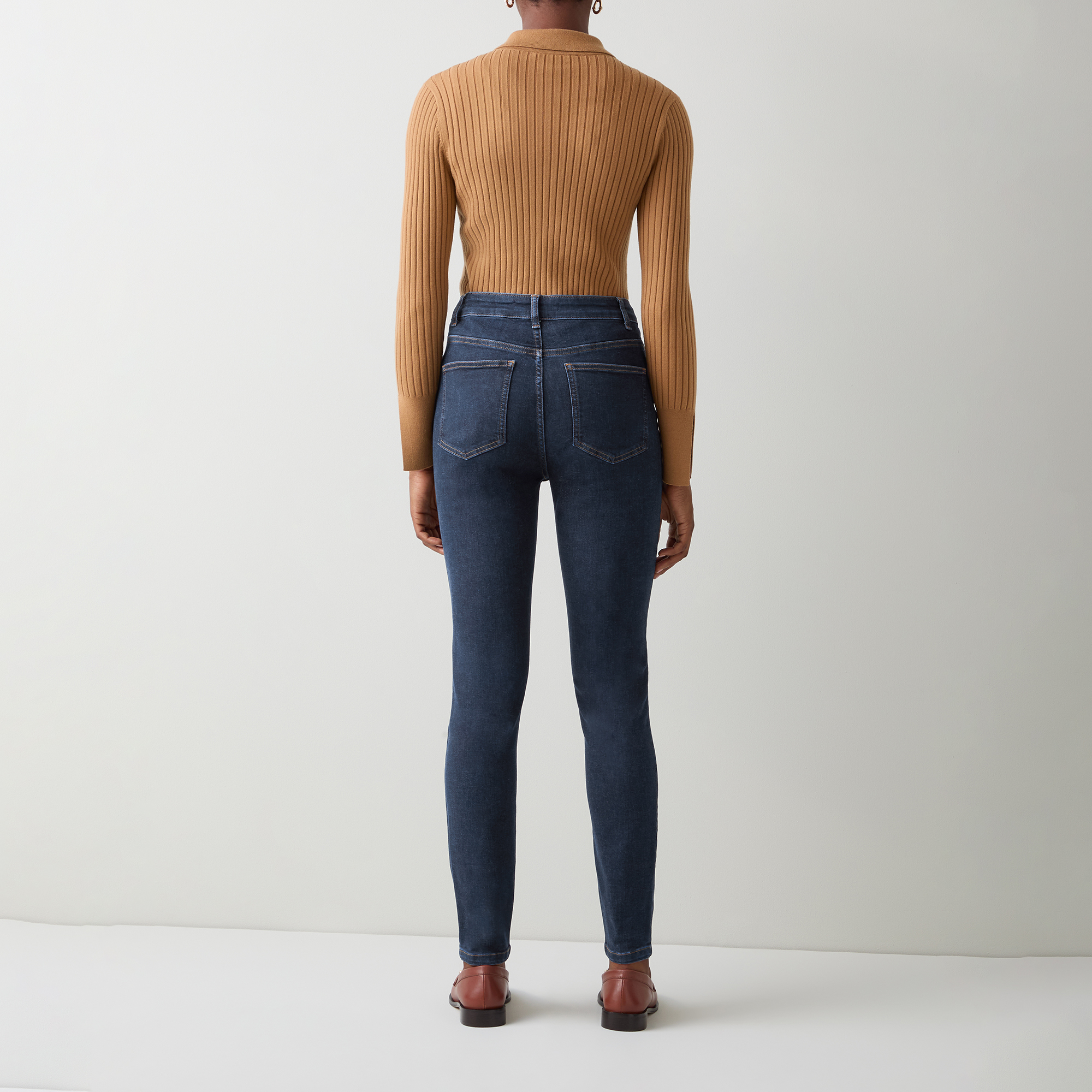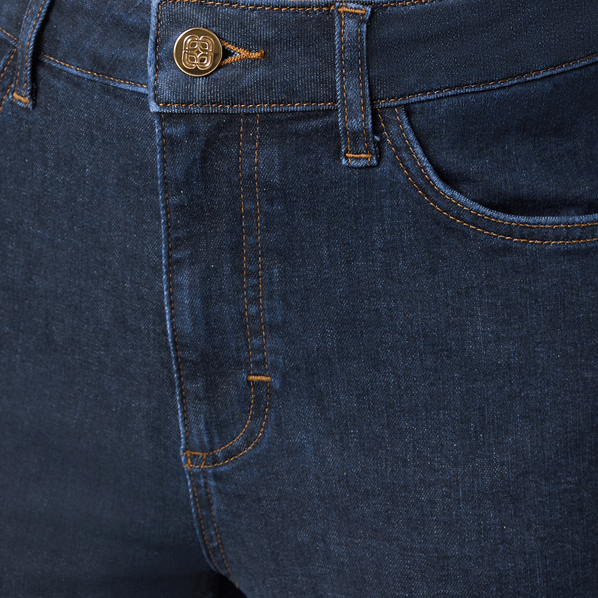 • Ankle-length cut, added stretch, branded logo button, five pocket styling