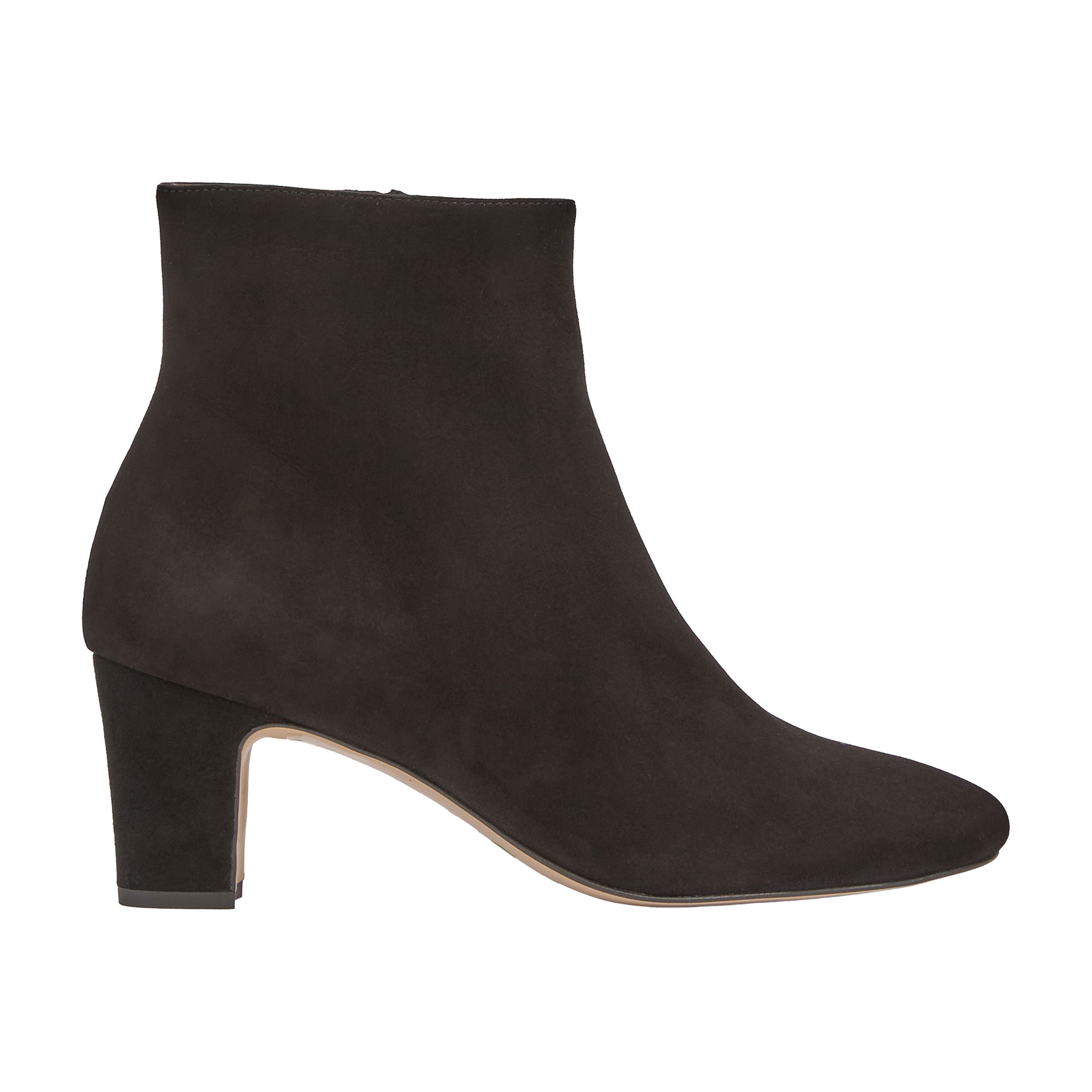 - Block heel, ankle style, textured suede finish, leather lining, durable sole, almond toe