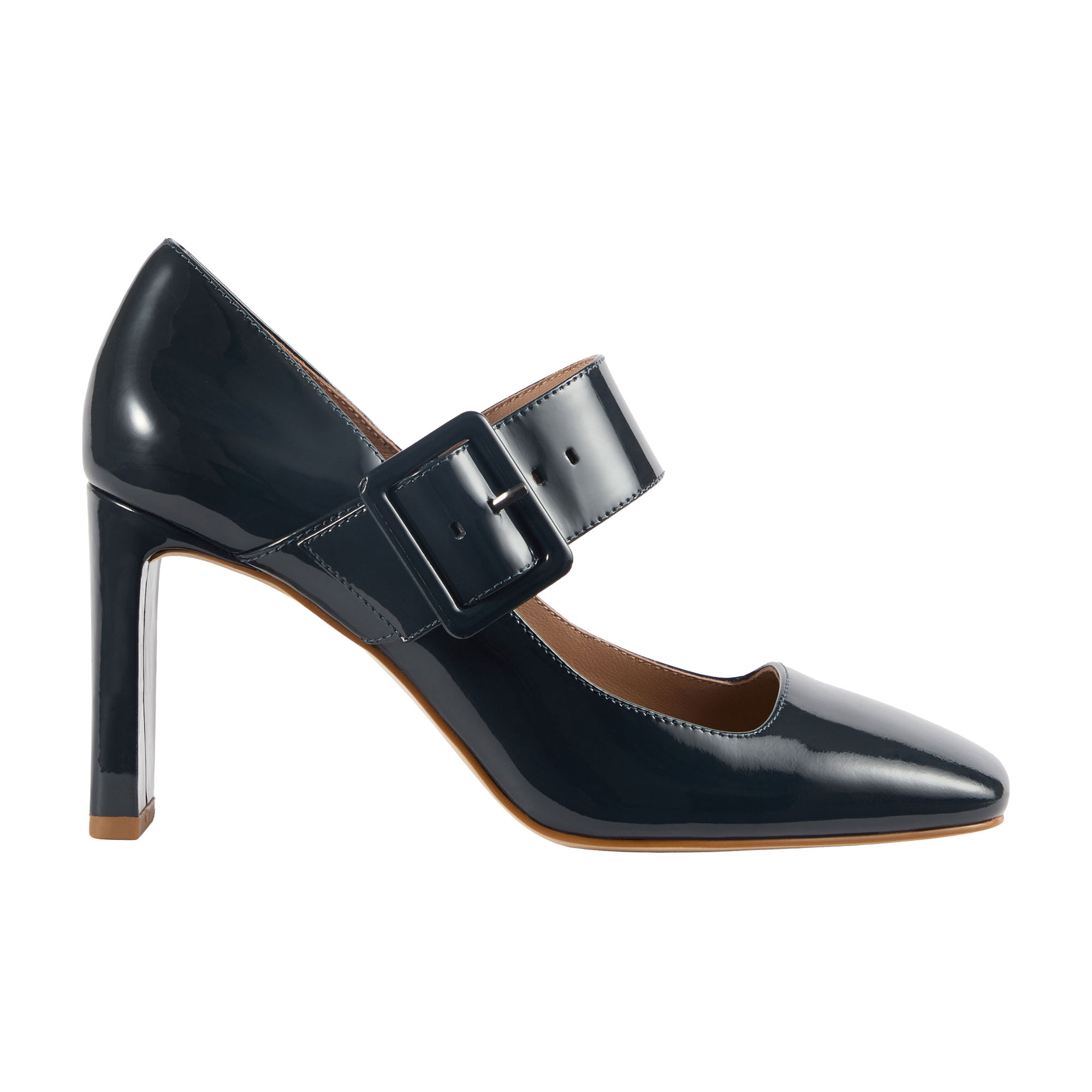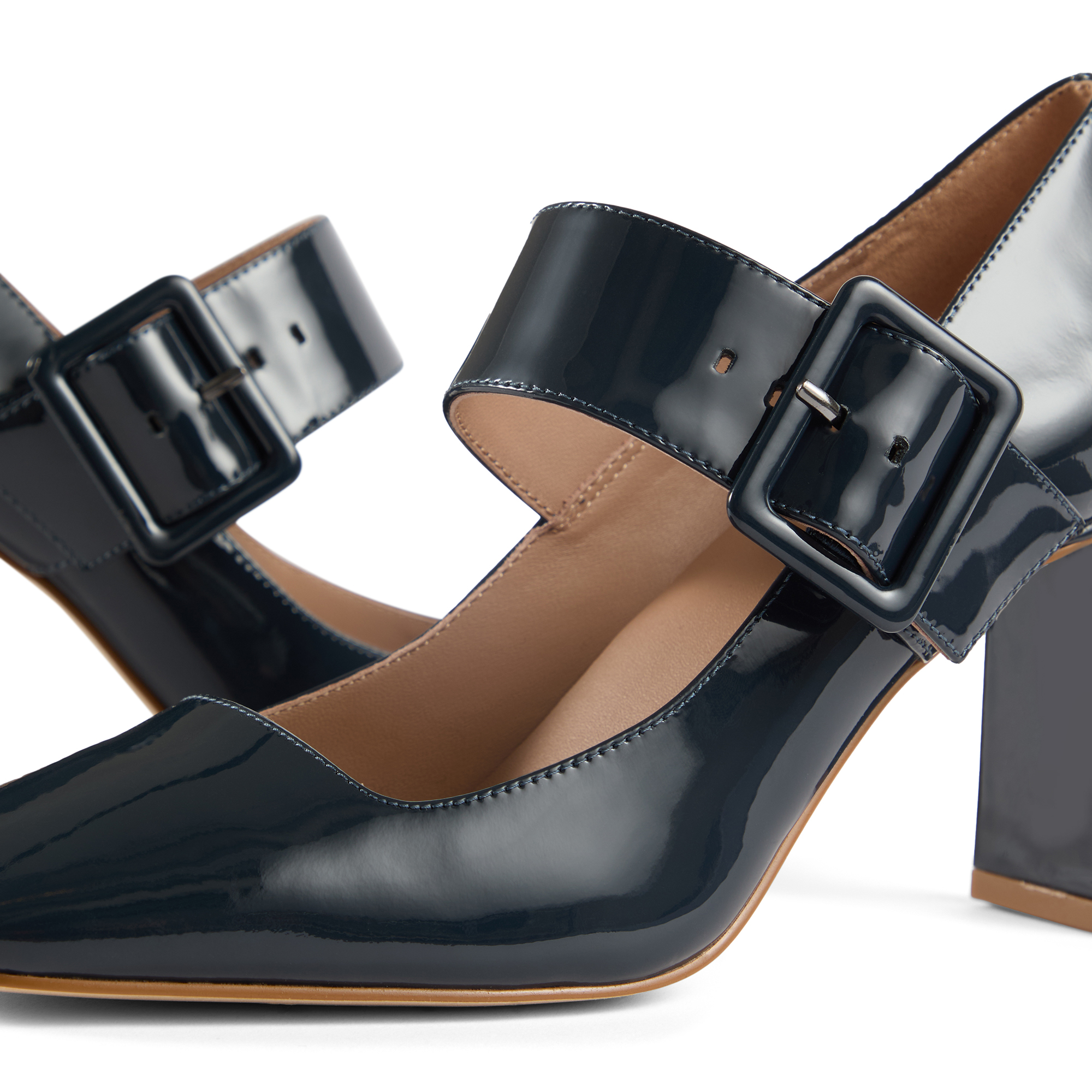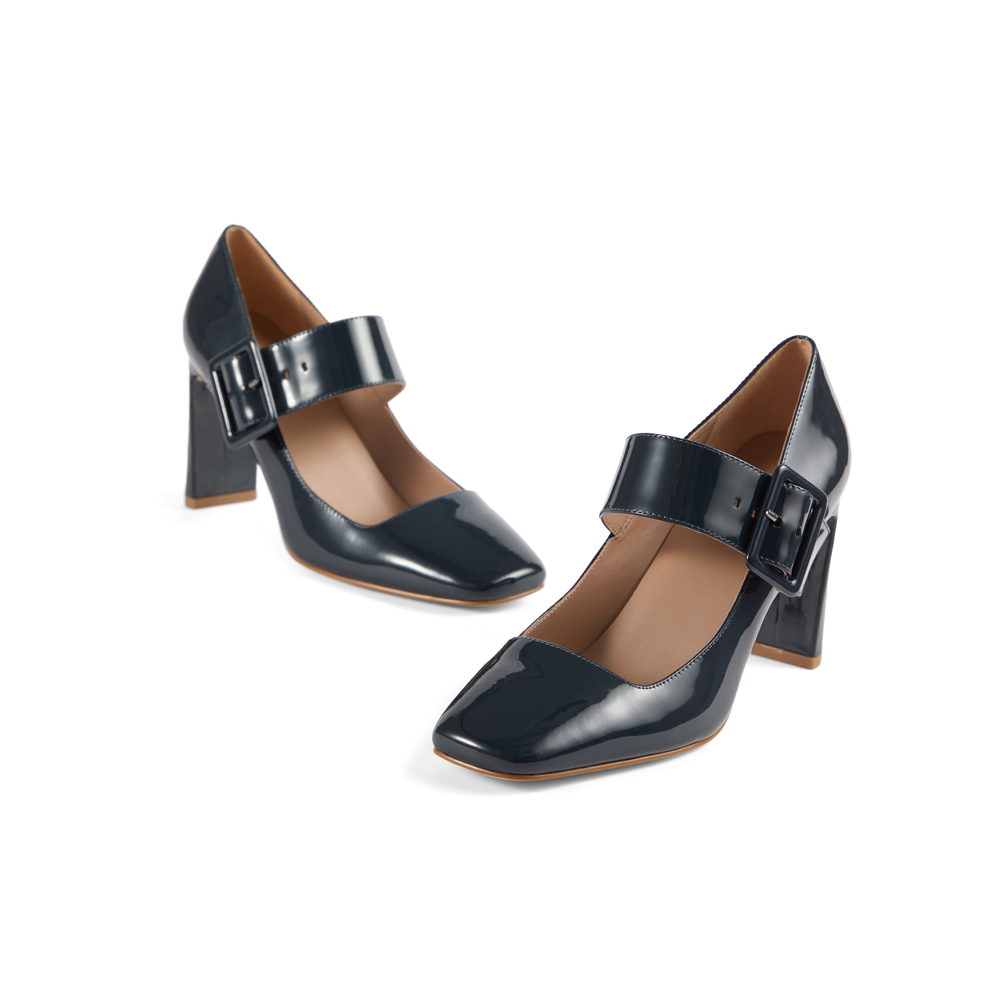 - Patent leather, Mary Jane courts, large buckle detail, square toe