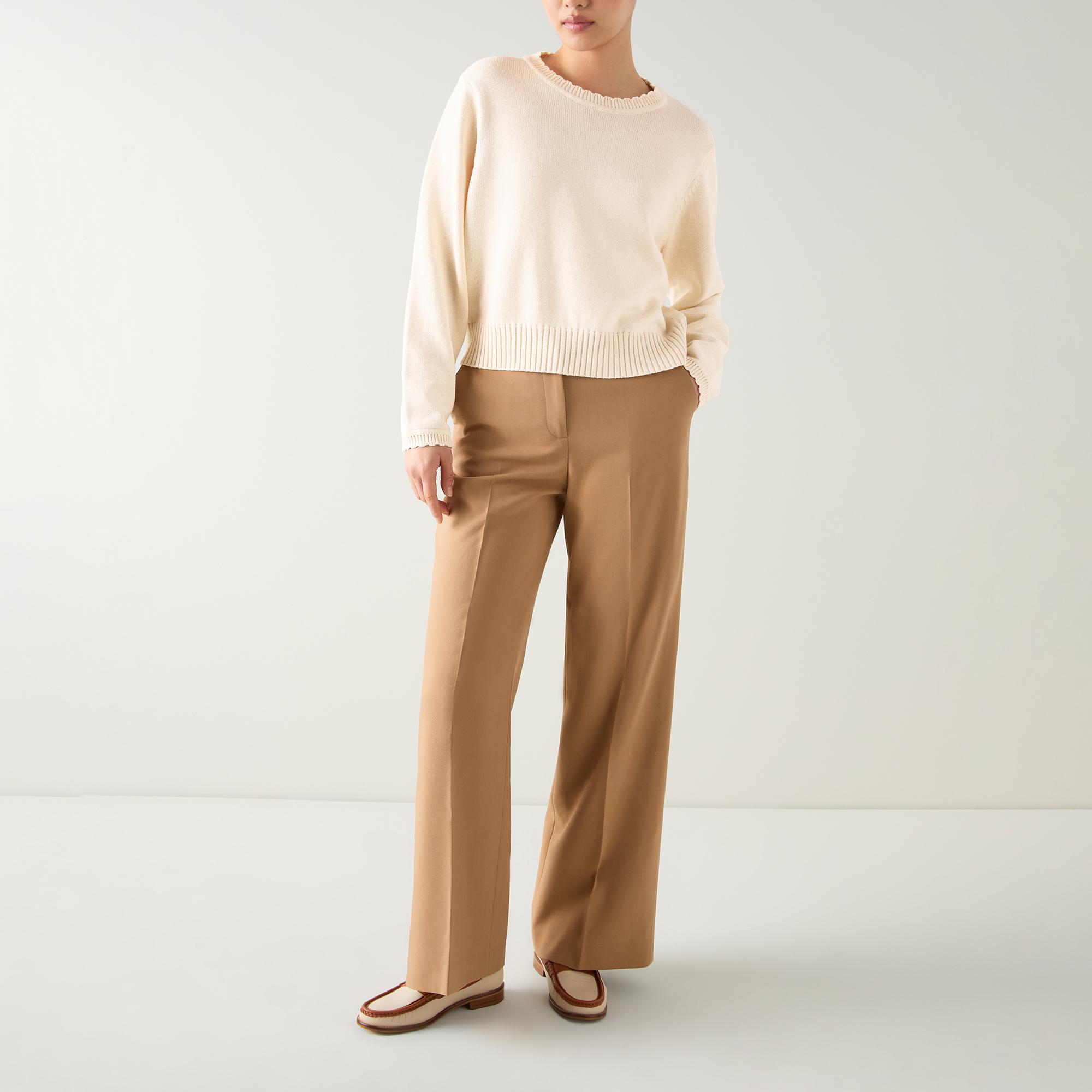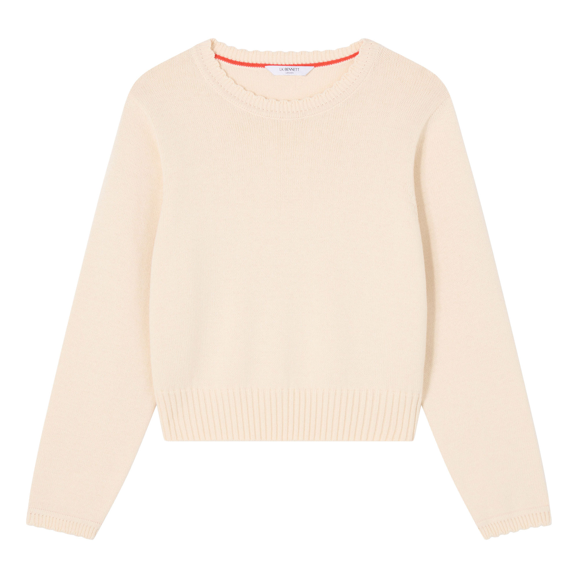 - Relaxed silhouette, scalloped neckline, stitch detailing, ribbed edge detailing