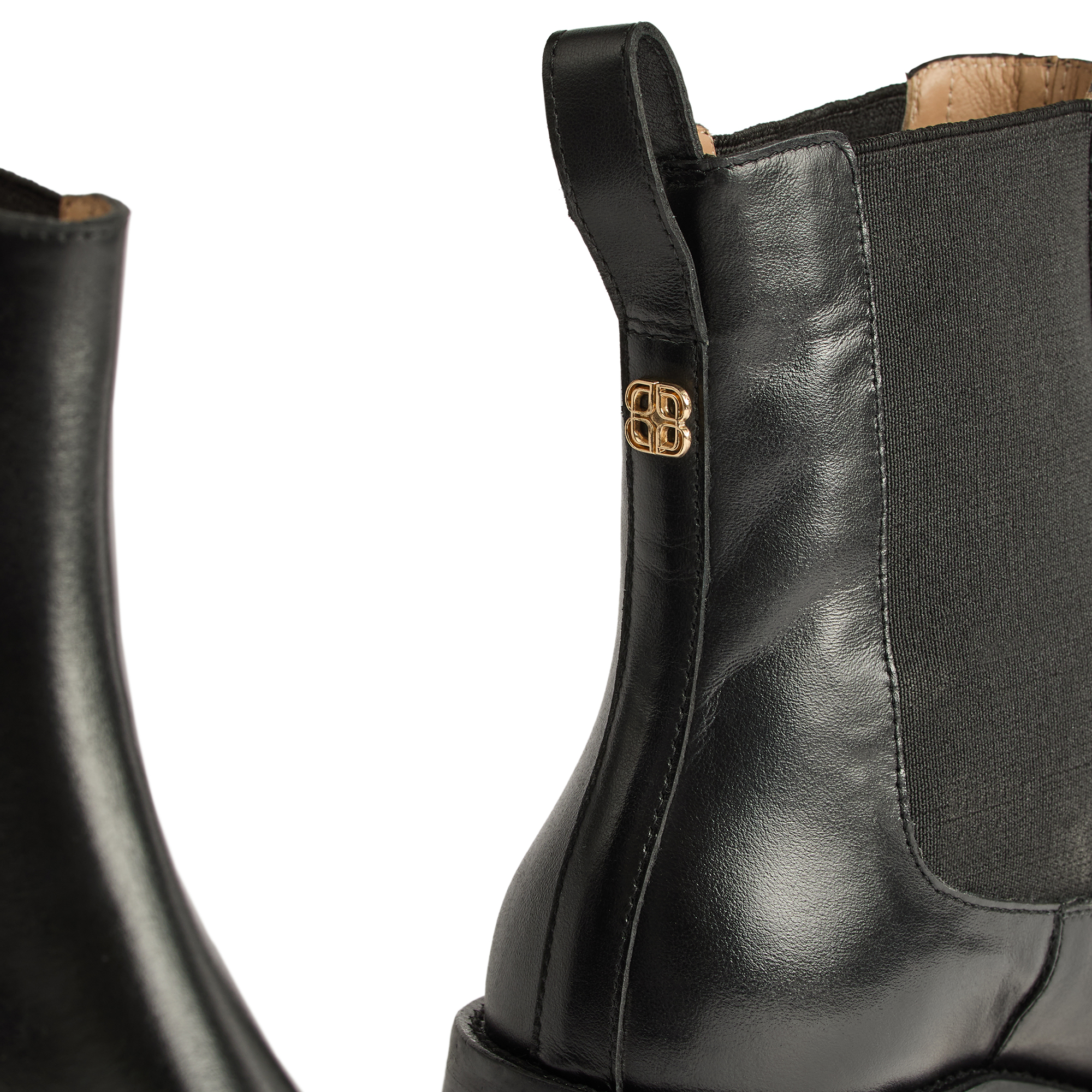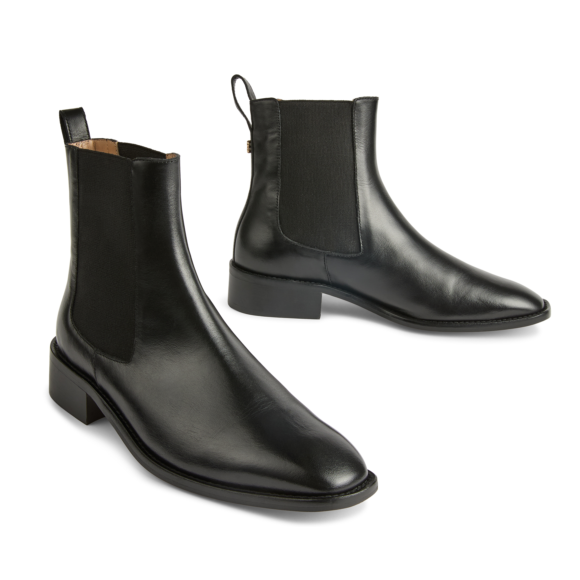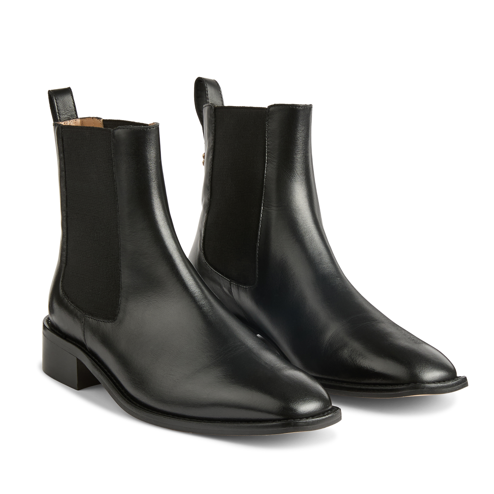 - Chelsea style, leather construction, leather lining, square toe, ankle height