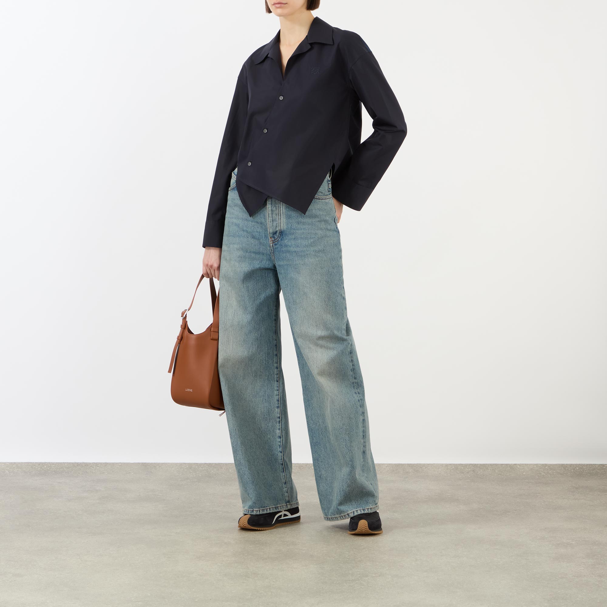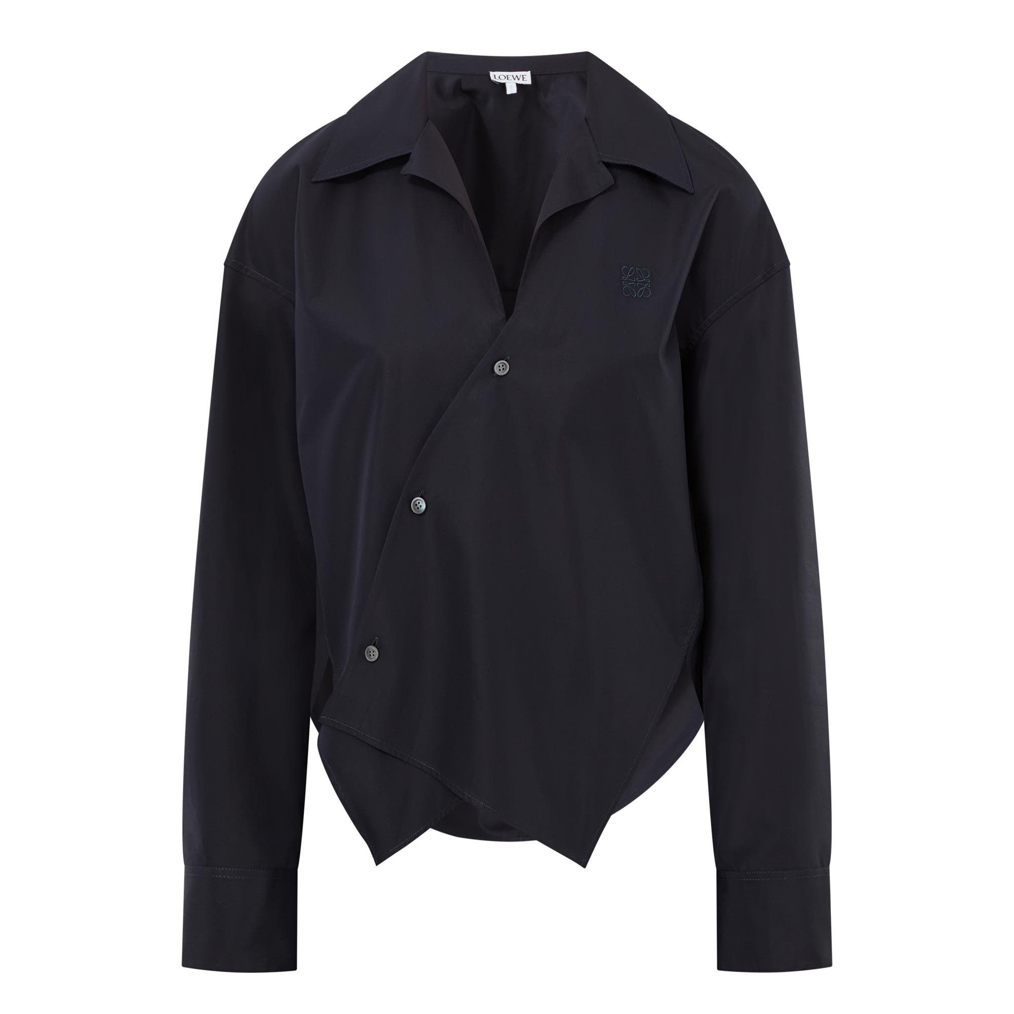 Traditional shirting is reinvented this SS26 at Loewe — crafted from unexpected materials that have been hand-pleated, spray-painted, or shredded, take this style. Framed by a point collar and cut to a relaxed silhouette, it features an asymmetric button placket and crossover hem with side splits for versatile styling, and finishes with a tonal logo embroidery on the chest.