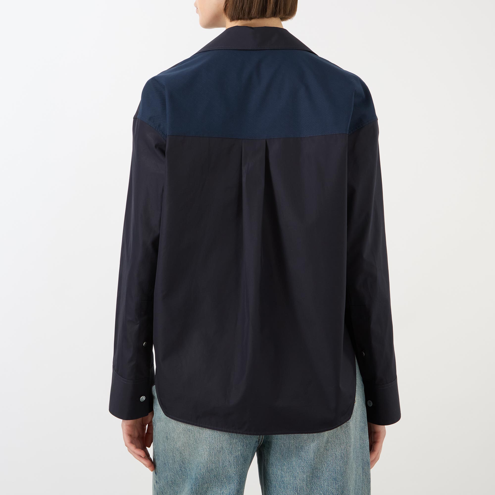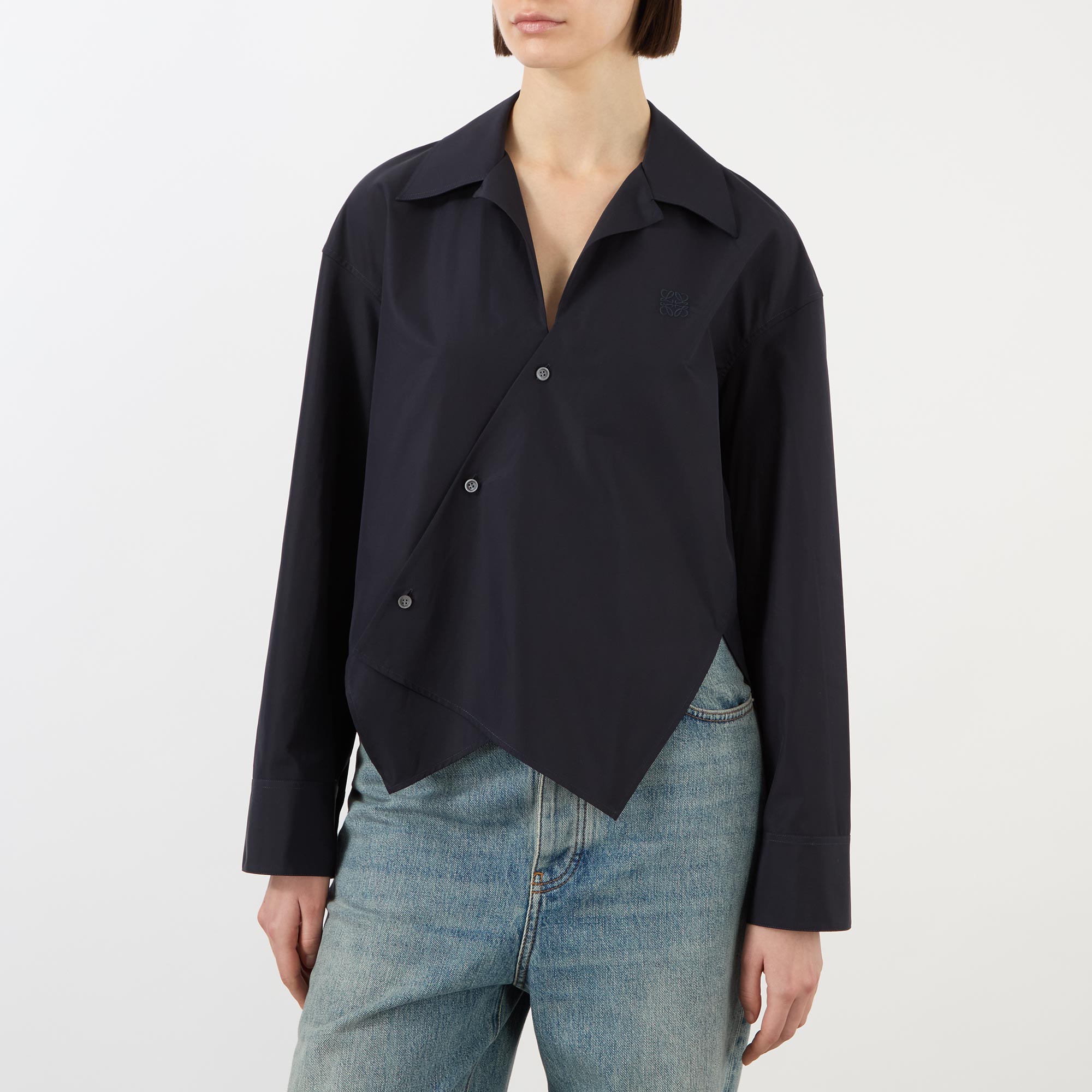 - Point collar, V-neckline, dropped shoulders, long sleeves, buttoned cuffs, button placket, asymmetric hem, side splits, rear box pleat, wrap-style front, embroidered logo detail