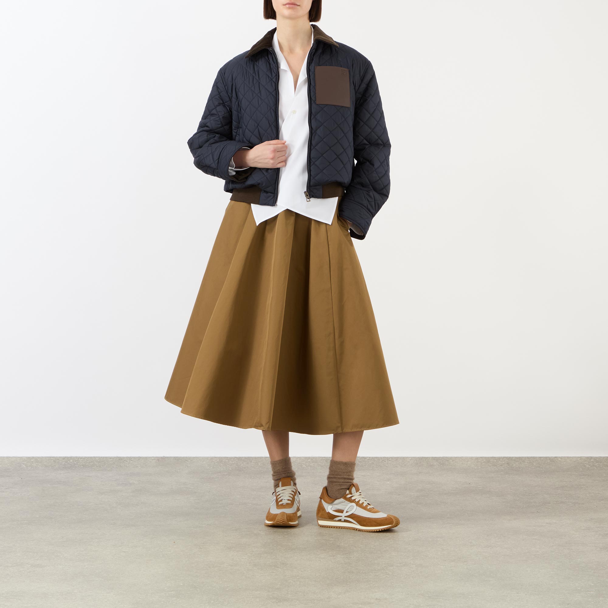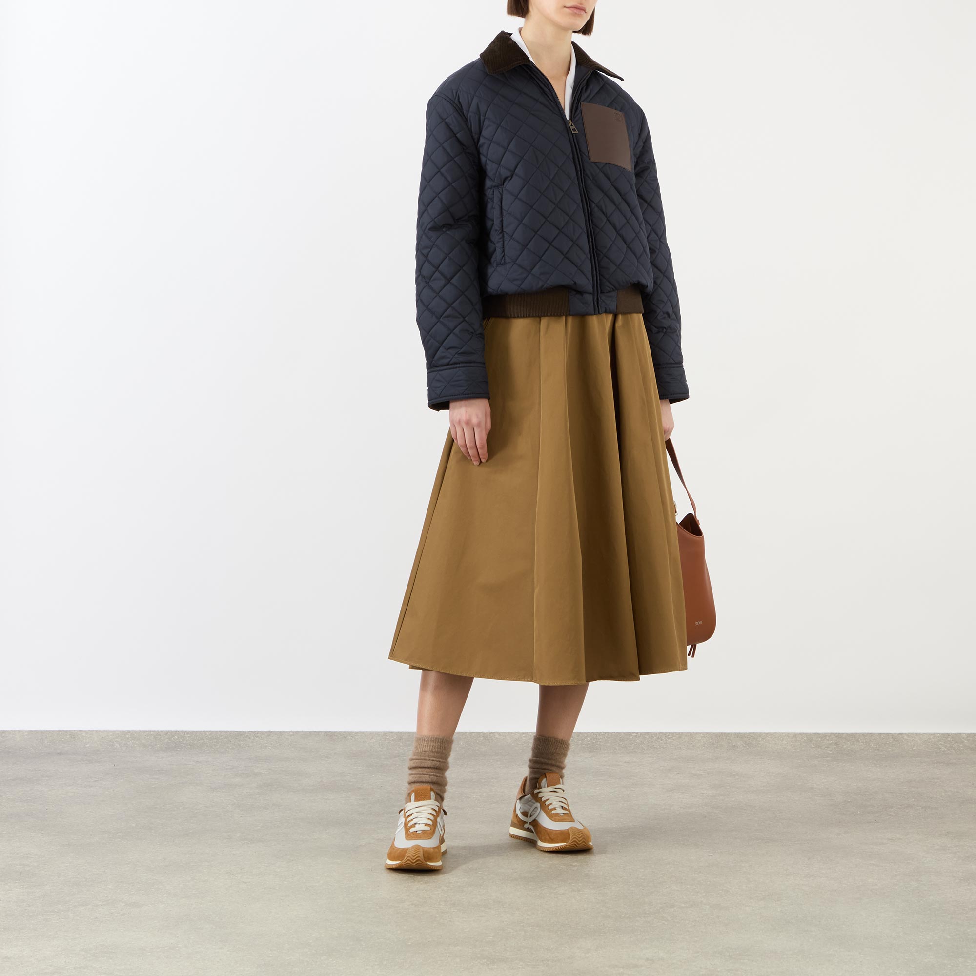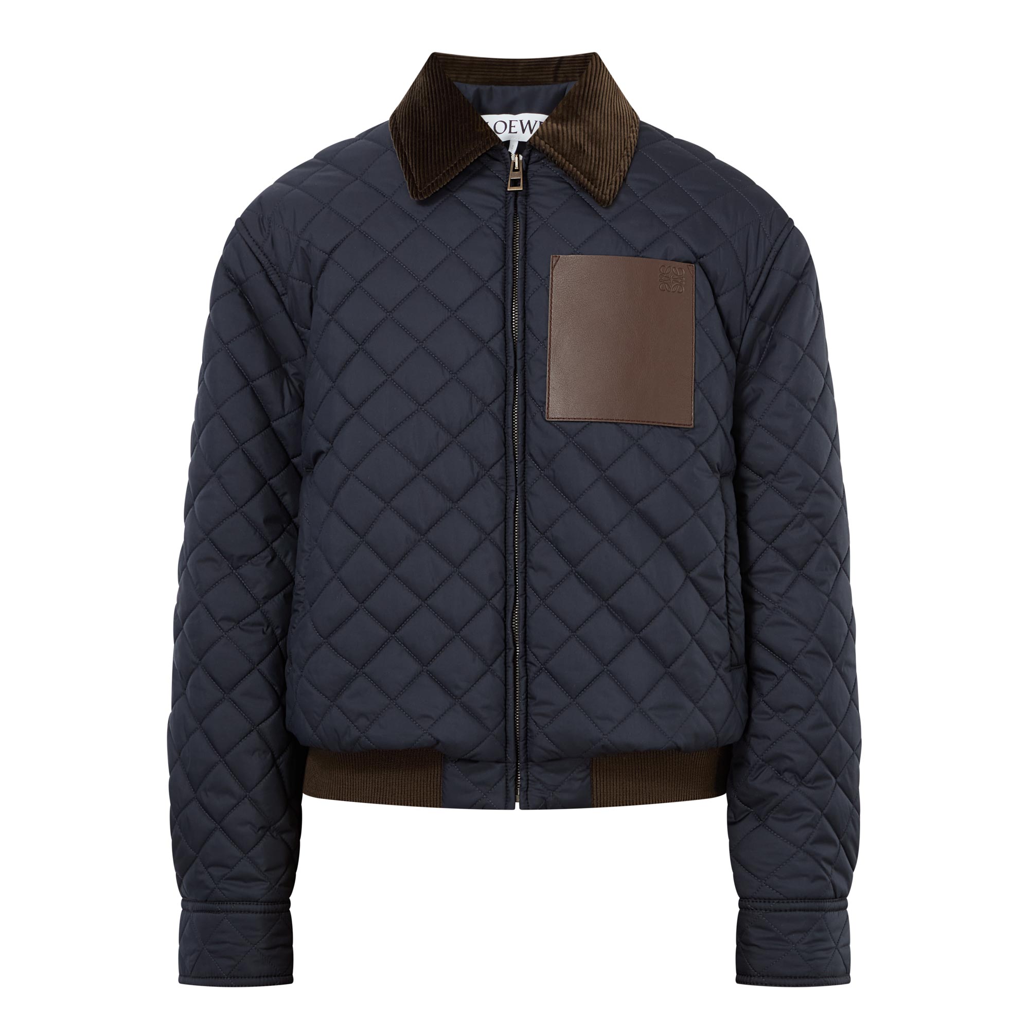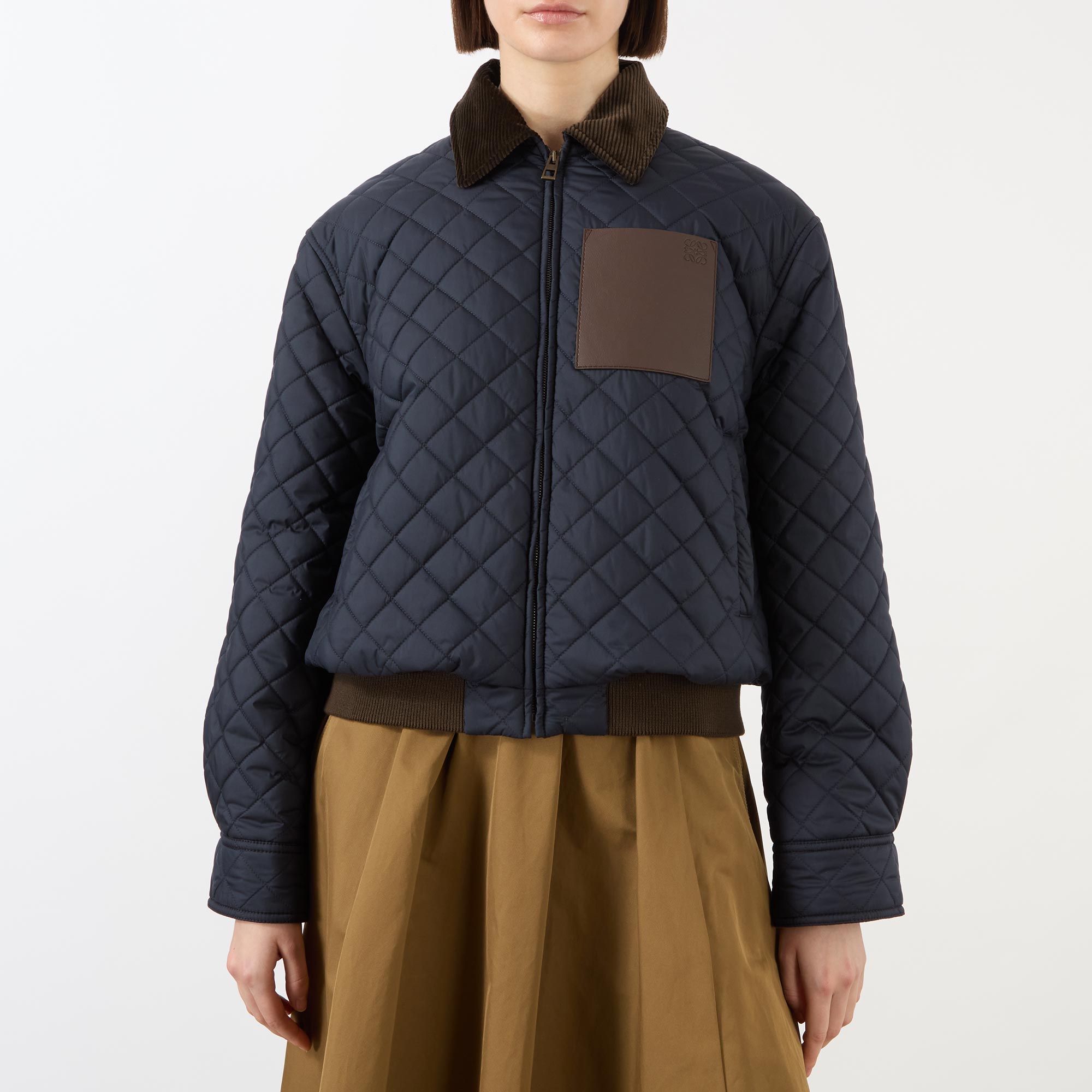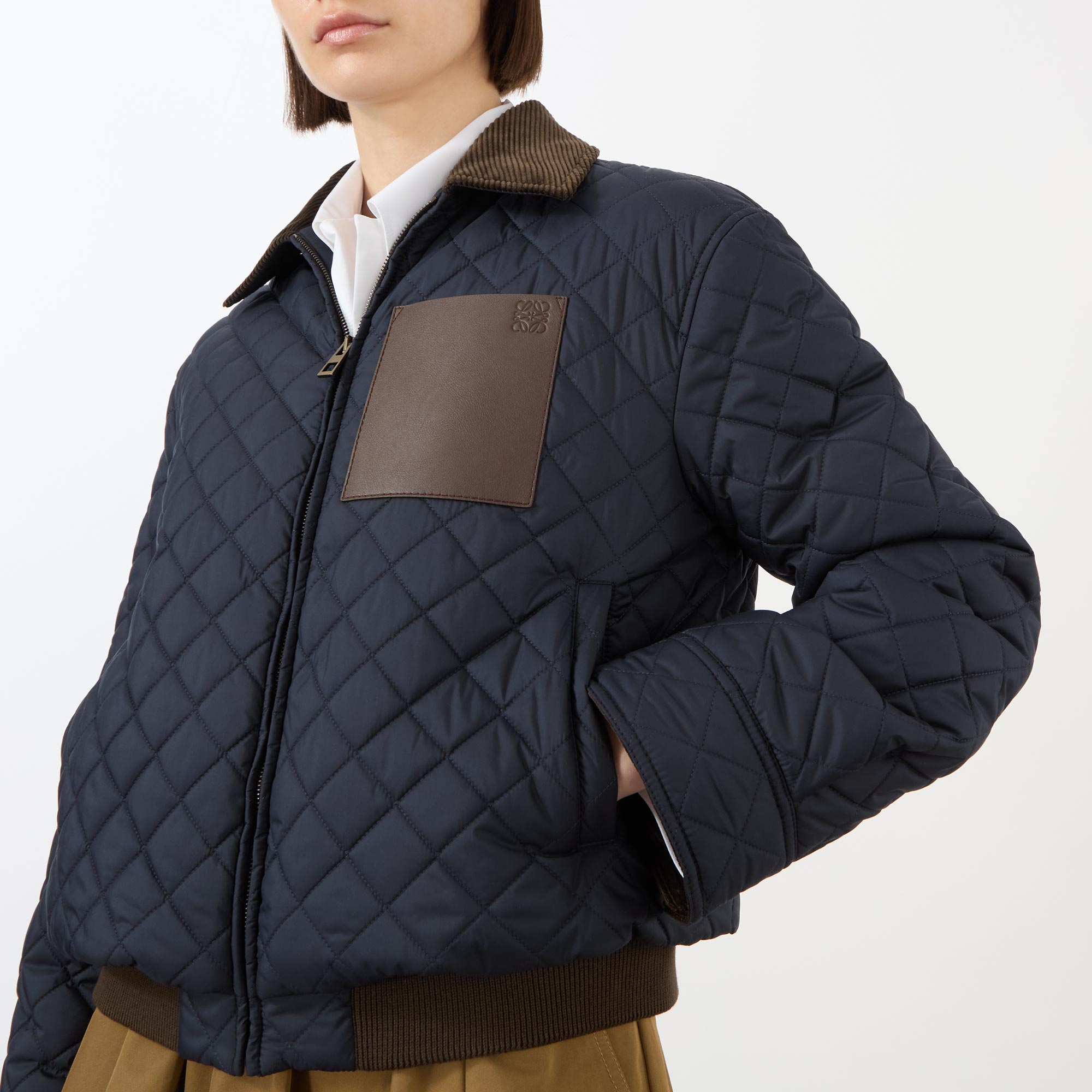 Anoraks, windbreakers, and bomber-inspired styles offer a lighter, more agile silhouette this SS26 at Loewe — take this jacket. Framed by a pointed corduroy collar and long sleeves, the cropped design fastens with a zip closure and boasts two side pockets to store your essentials, adorned in a quilted finish and stamped with a signature patch pocket with an embossed logo detail.
