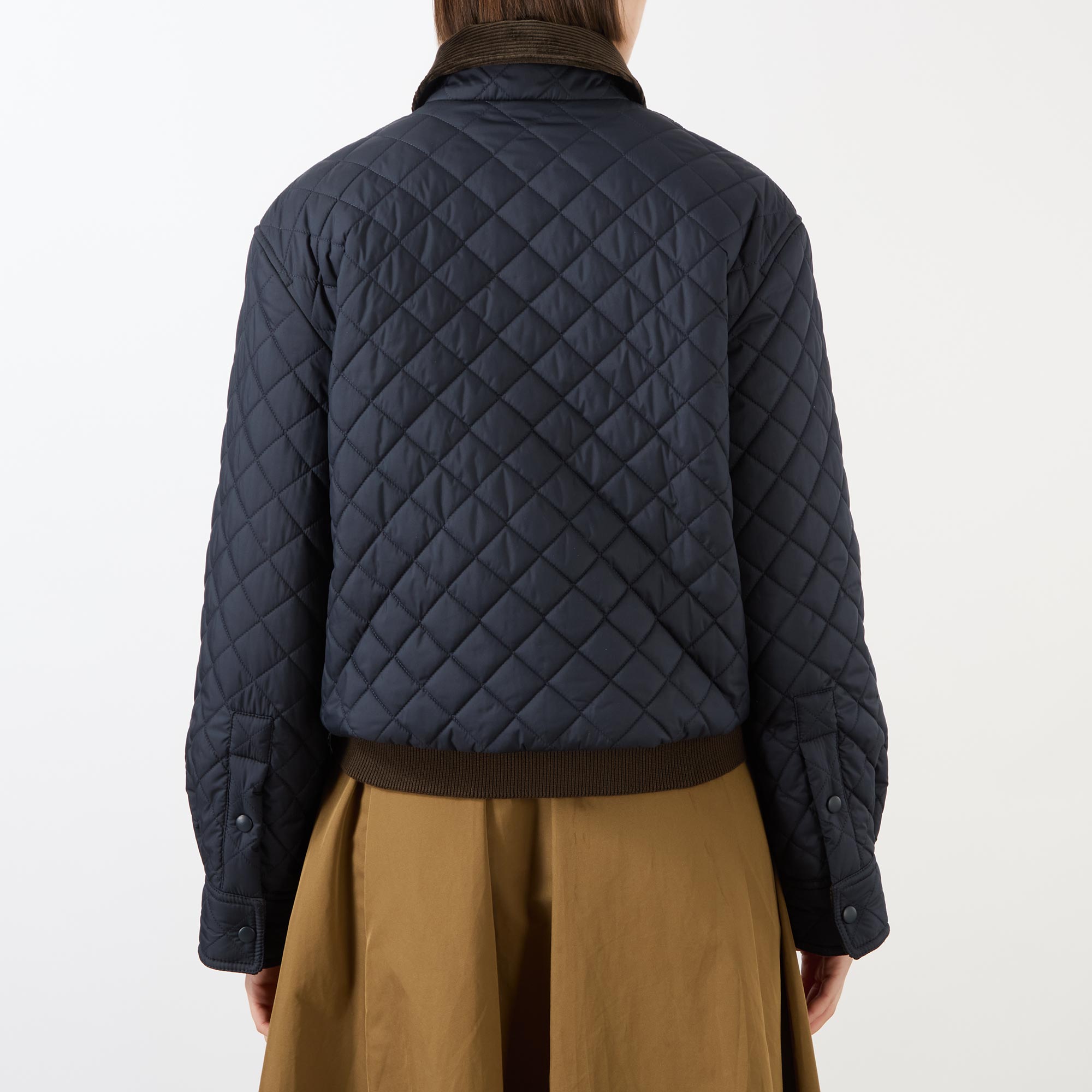 - Contrasting corduroy collar, dropped shoulders, long sleeves, snap buttoned cuffs, front zip fastening, straight hem with ribbed trim, cropped length, one chest patch with logo detail, quilted finish, lined