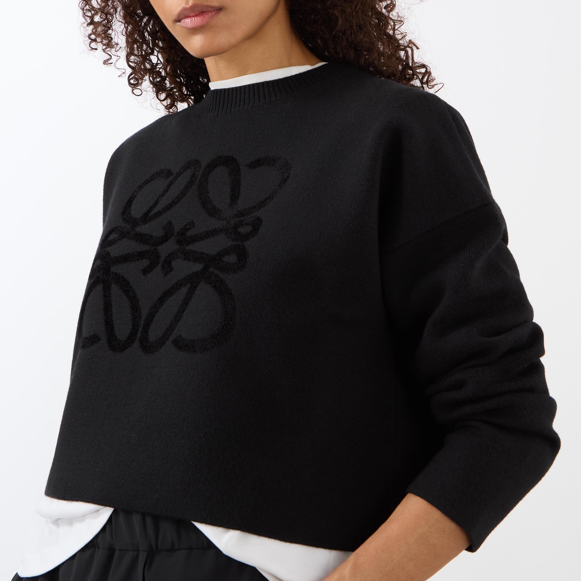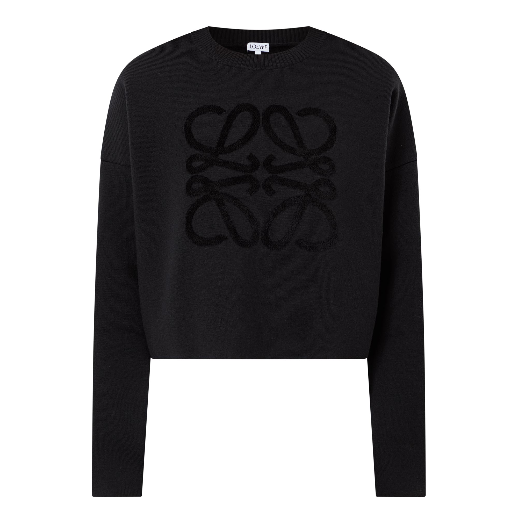 LOEWE experiments with woven and knitted textures for its SS26 line, crafting cosy pieces like this sweater. Made from a soft wool blend, it features a classic crew neckline, long sleeves, and slouchy dropped shoulders for a relaxed, casual feel. Cut to a chic cropped length, the sweater is emblazoned with the label’s signature Anagram logo across the front in a tonal design and is finished with a clean, straight hemline.