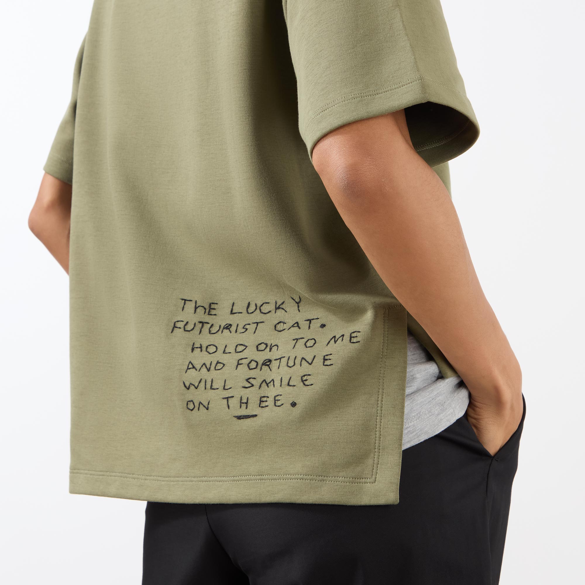 LOEWE’s SS26 line ushers in a vibrant, playful period for the brand, featuring fun slogans across its garments. Take this t-shirt: made from a soft cotton blend, it is woven with the label’s signature Anagram logo topped with a cat and features a classic crew neckline with short sleeves. Slouchy dropped shoulders enhance its relaxed feel, while open side seams allow for easy movement, and a playful slogan printed on the back completes the design.