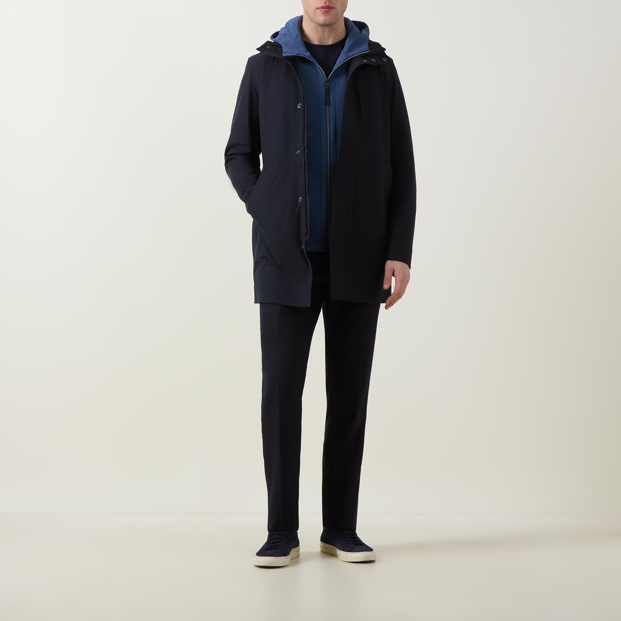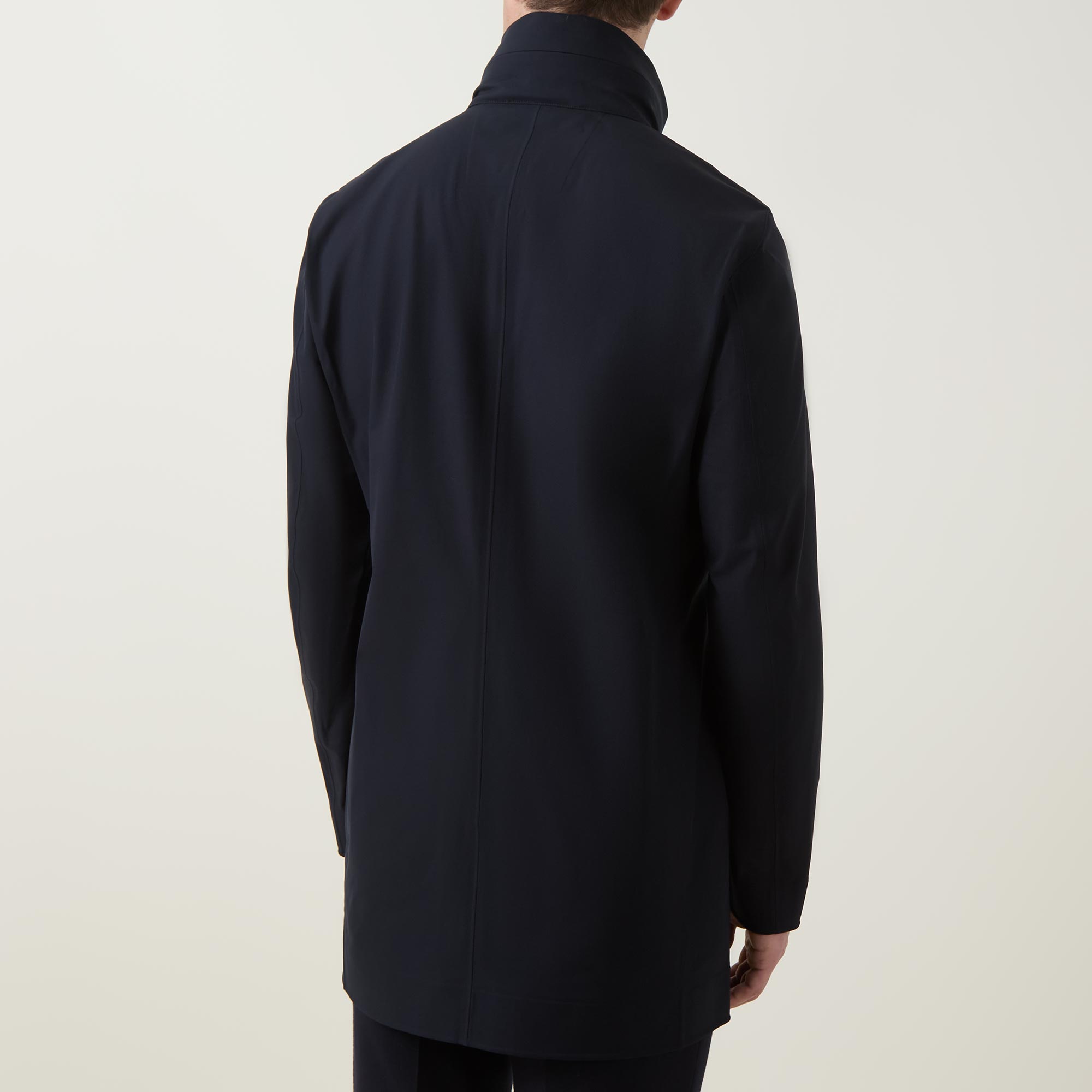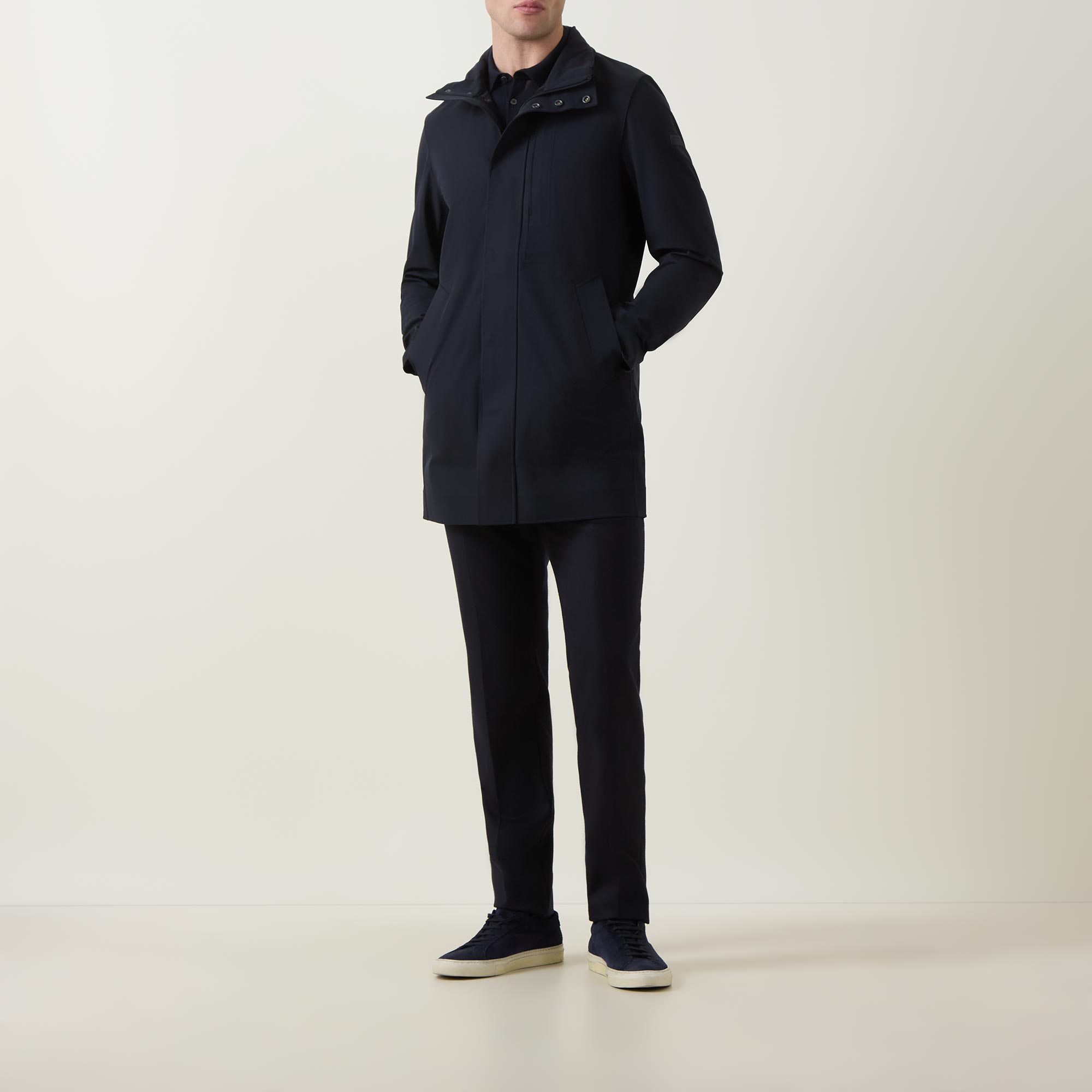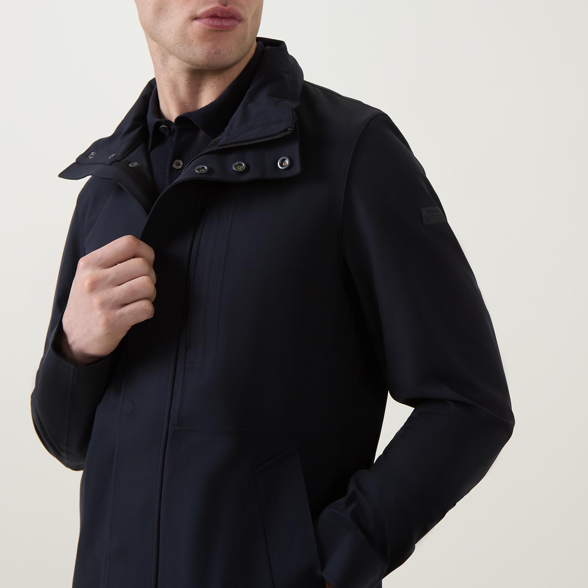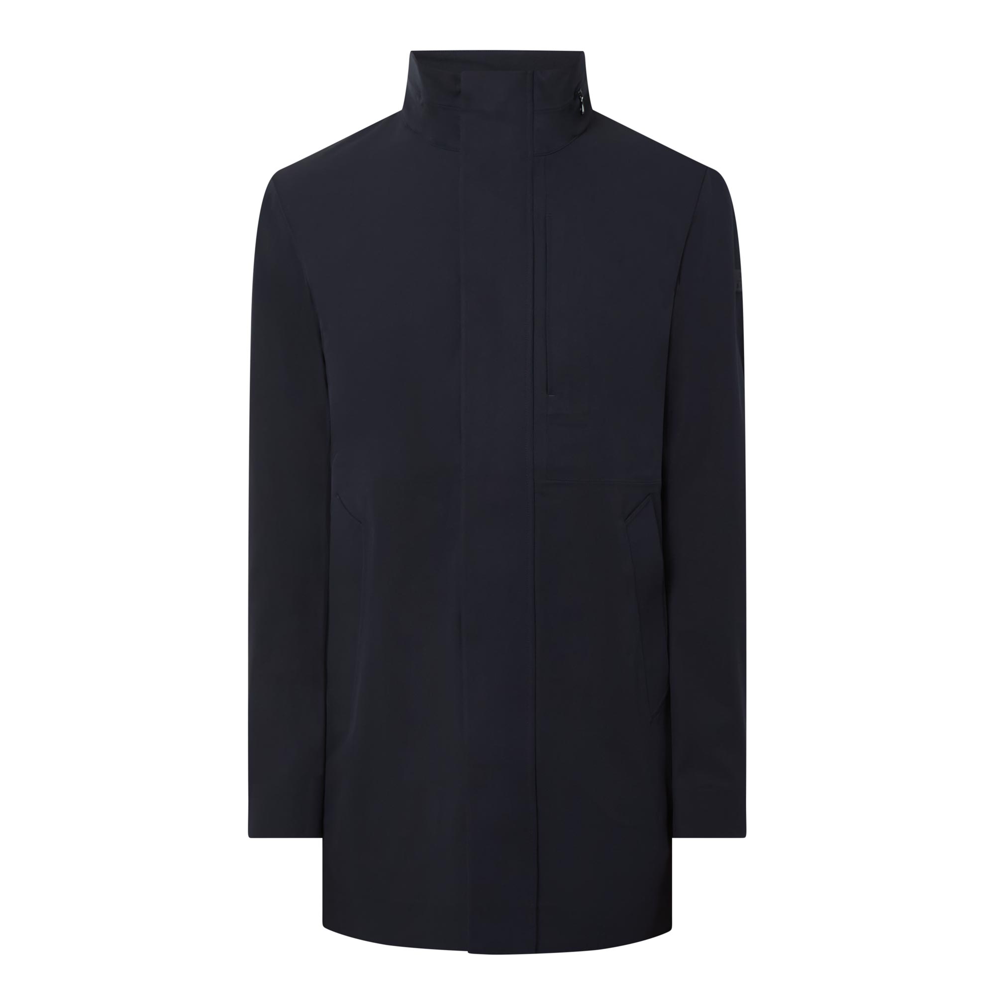 - Stand collar, long sleeves, front zip fastening, additional snap button placket, one chest pocket, two angled welt pockets, straight hem, tonal logo badge, longline design, technical fabric
