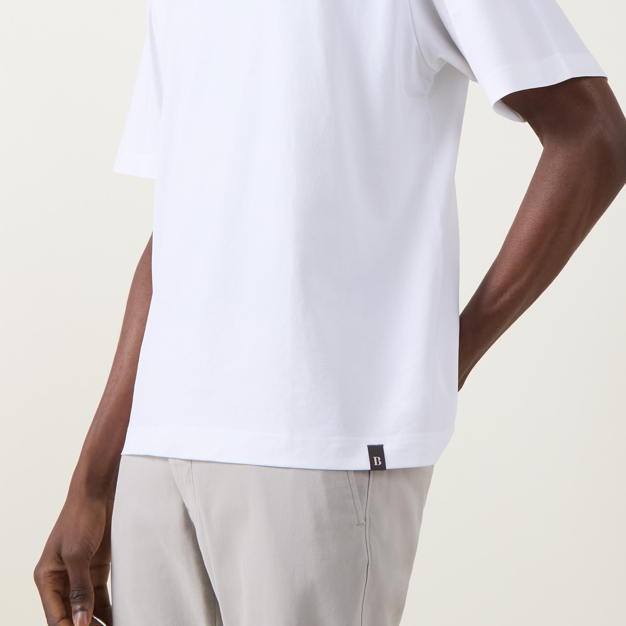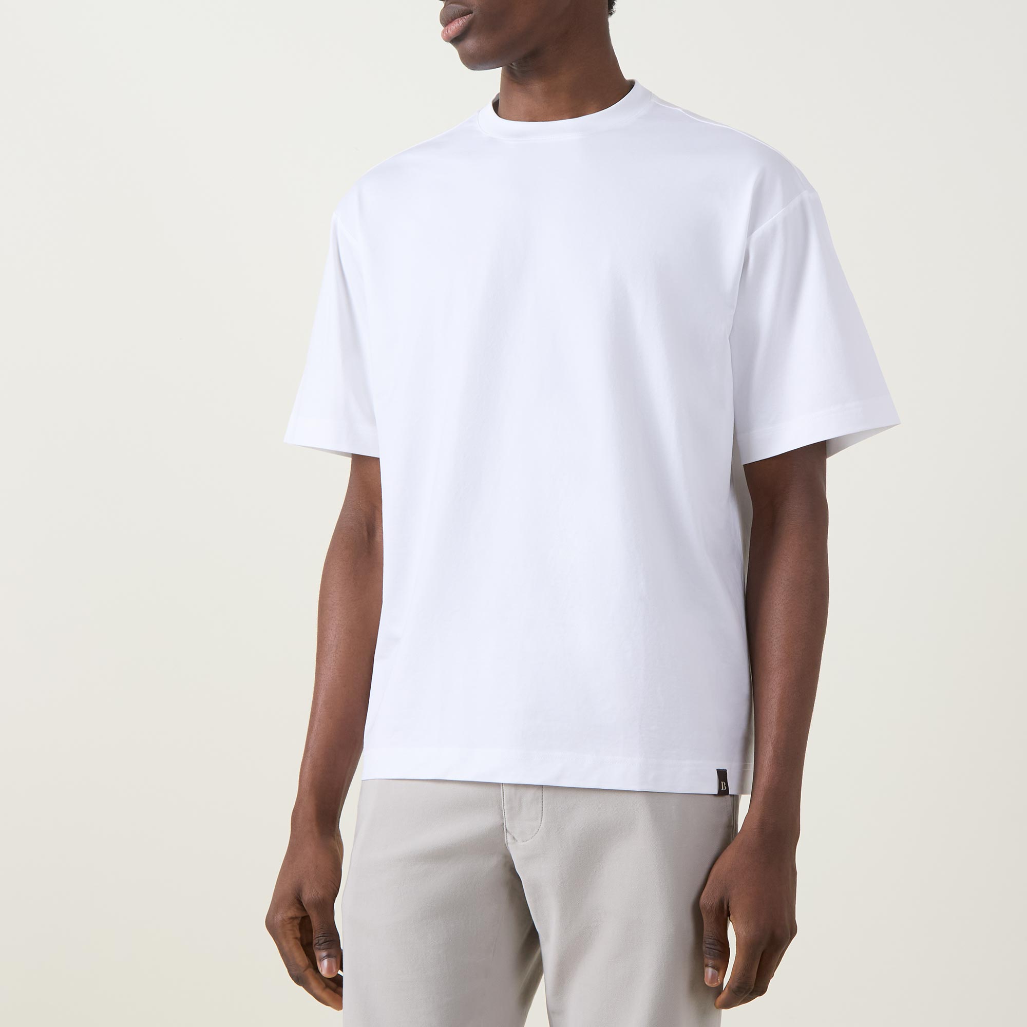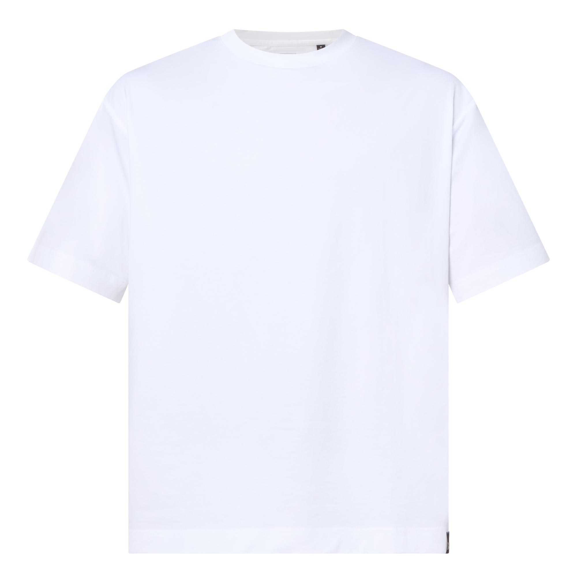 - Crew neckline, short sleeves, dropped shoulders, logo tag on hem, tonal stitching, straight hemline, smooth fabric