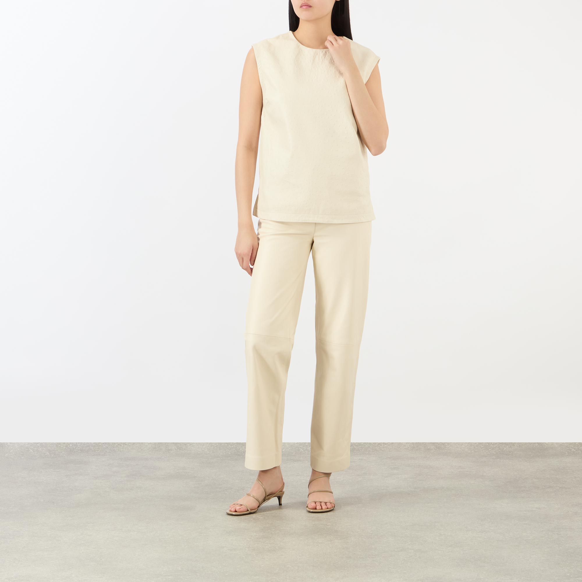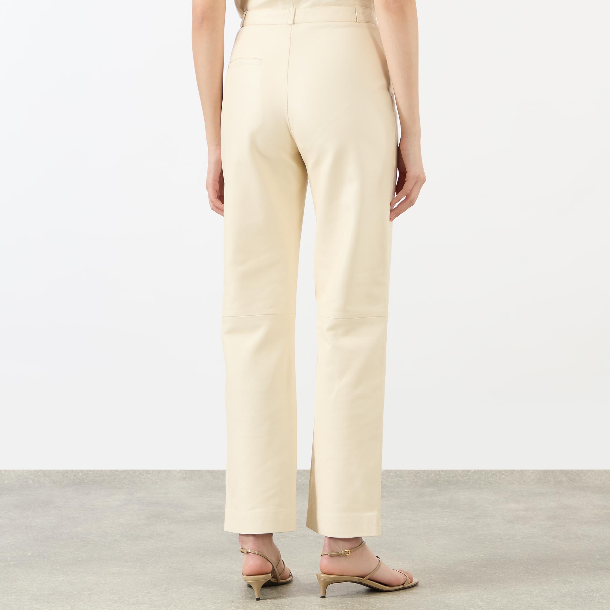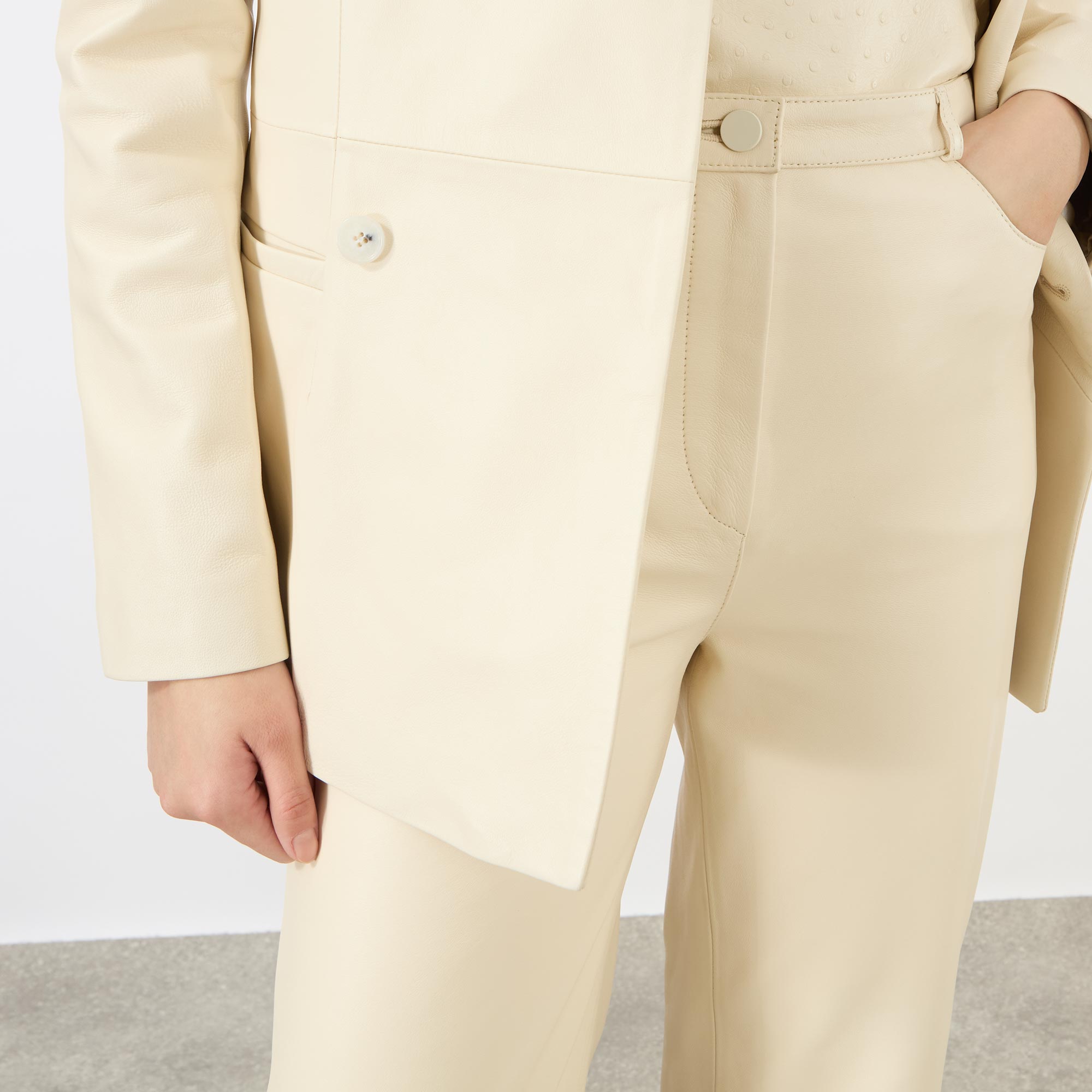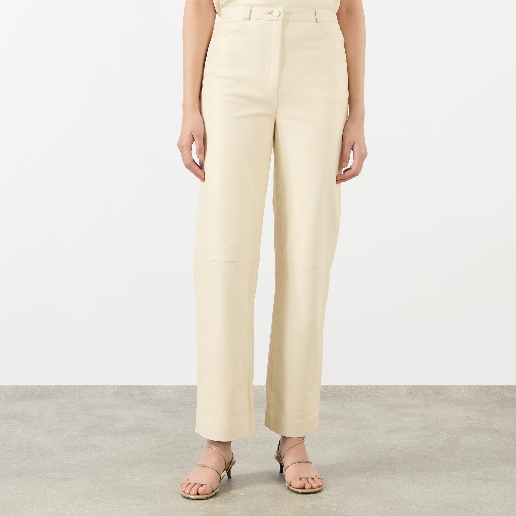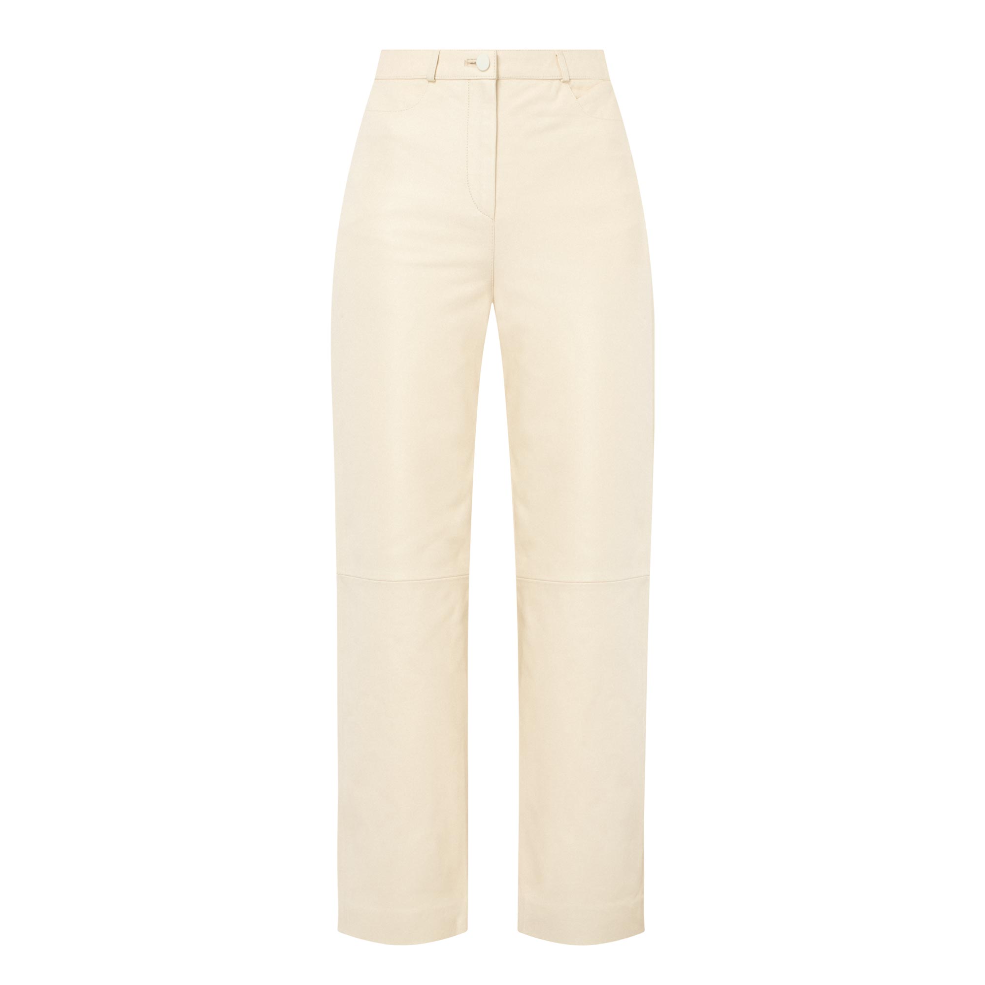 - Button and fly zip fastening, belt loops, side entry pockets, rear patch pockets, leather fabric, straight-cut legs