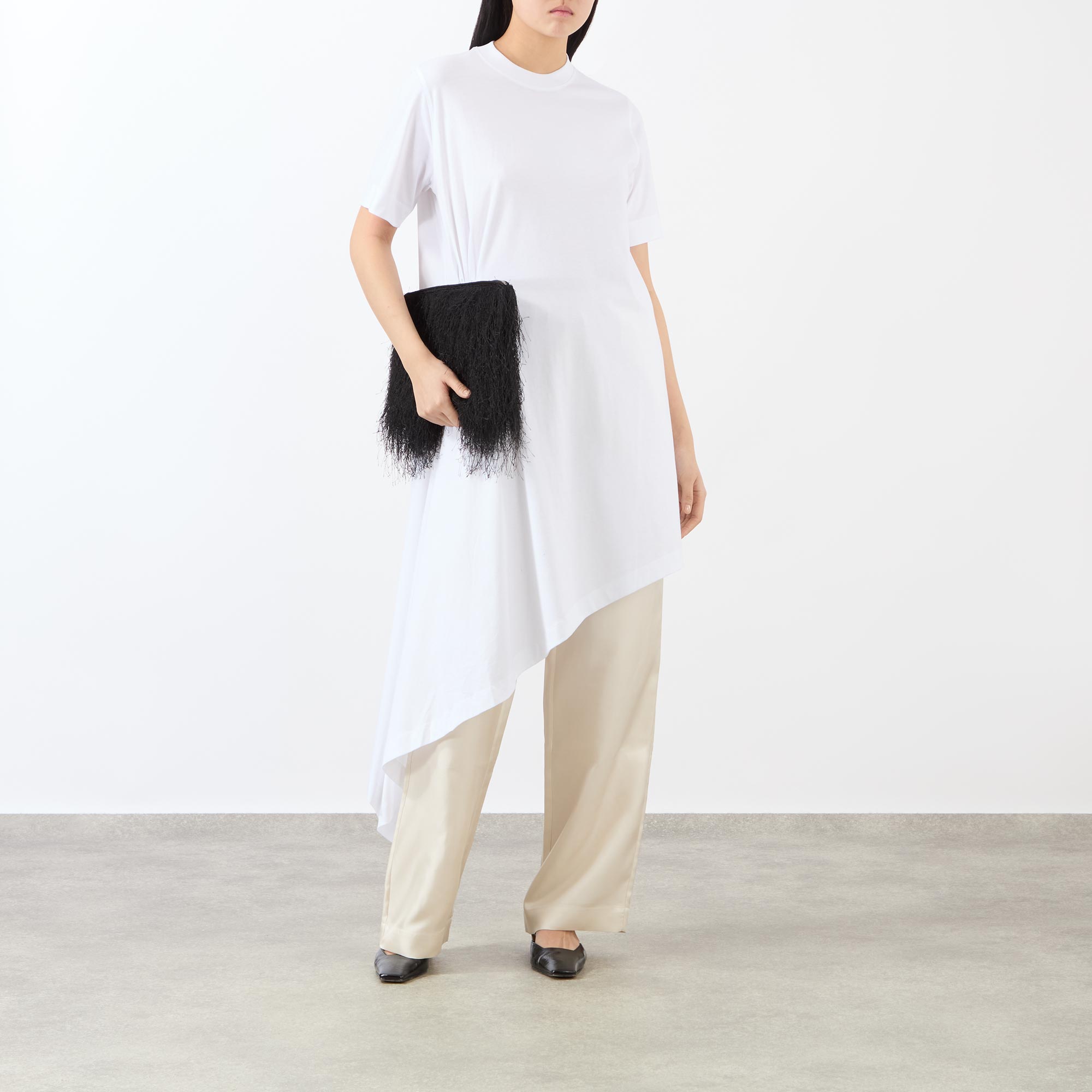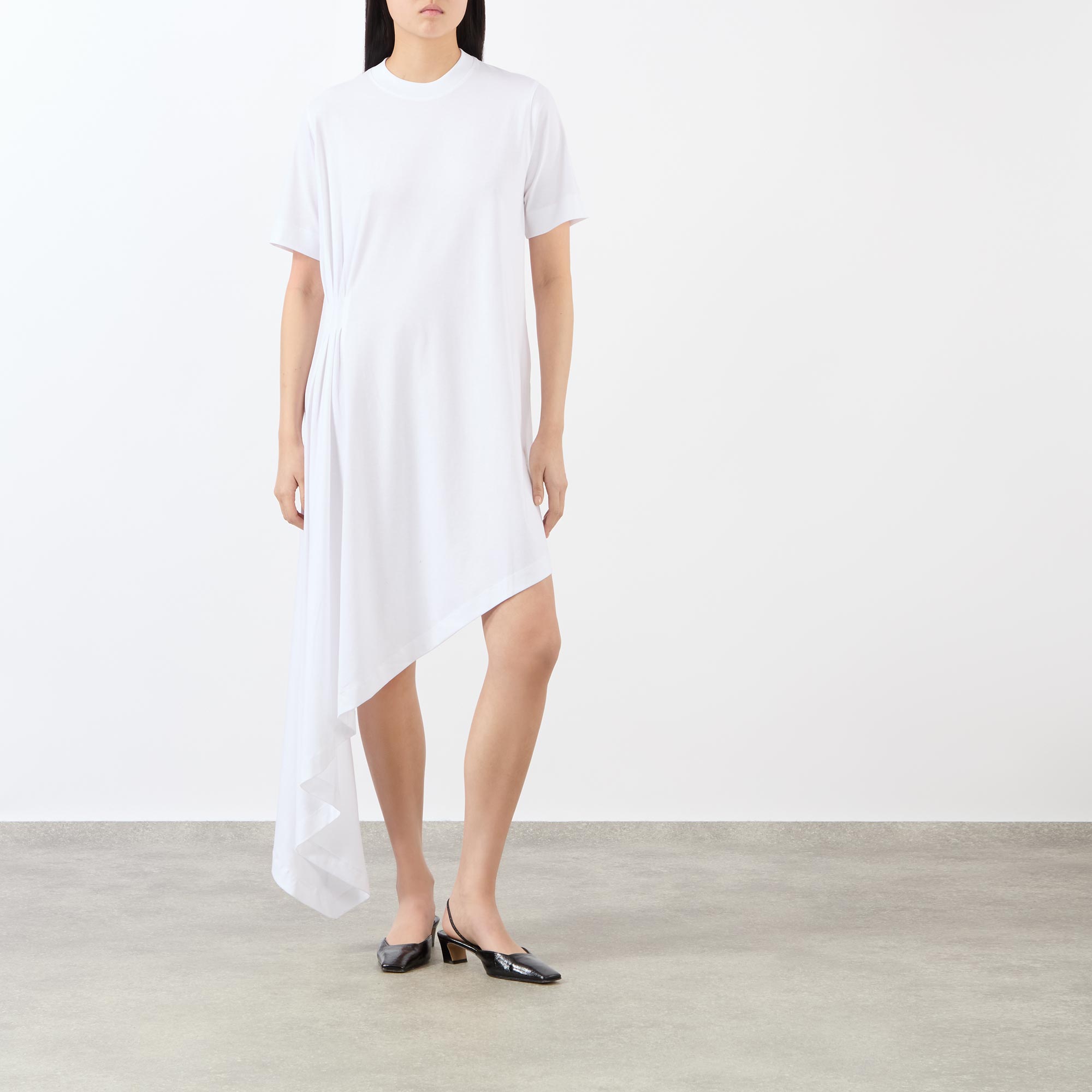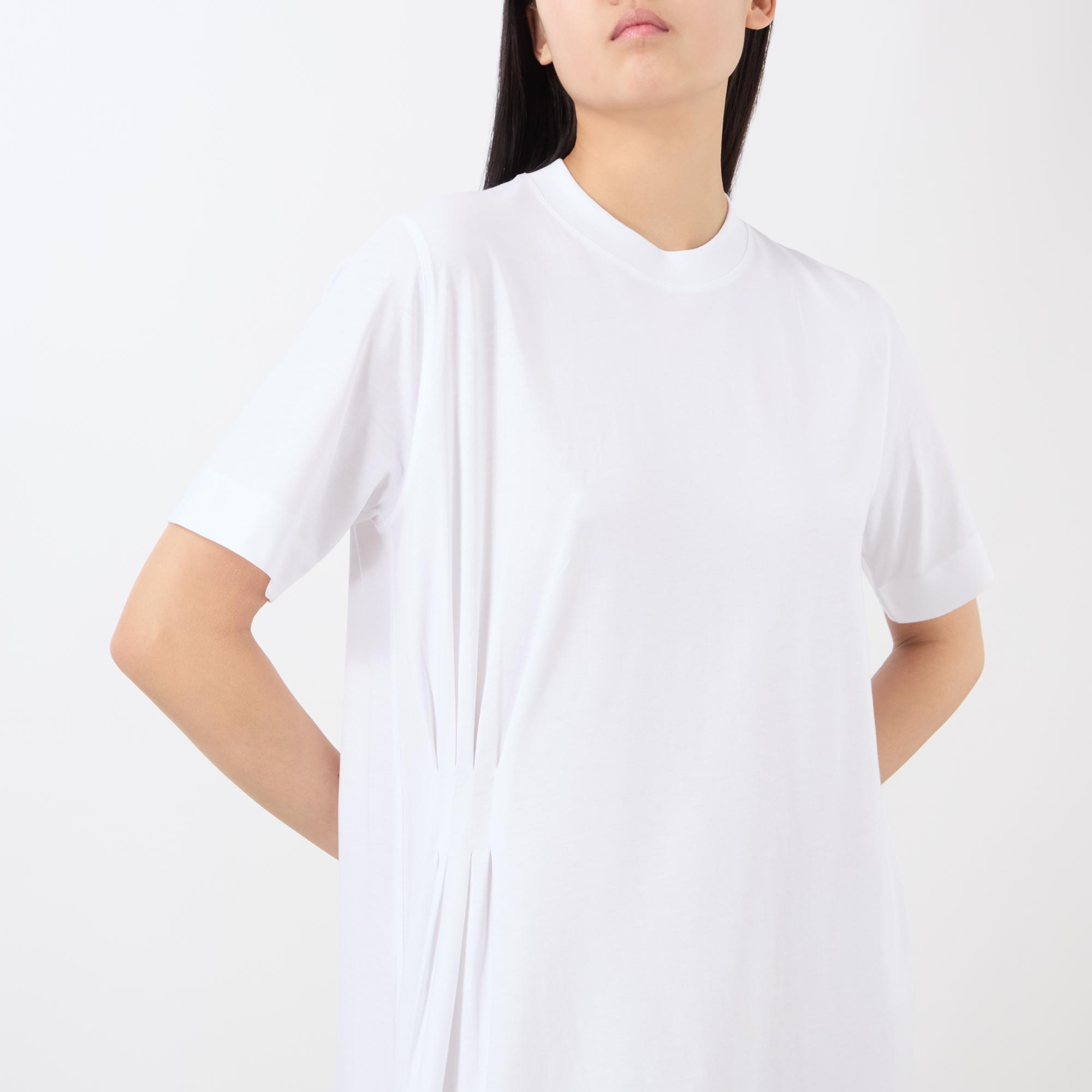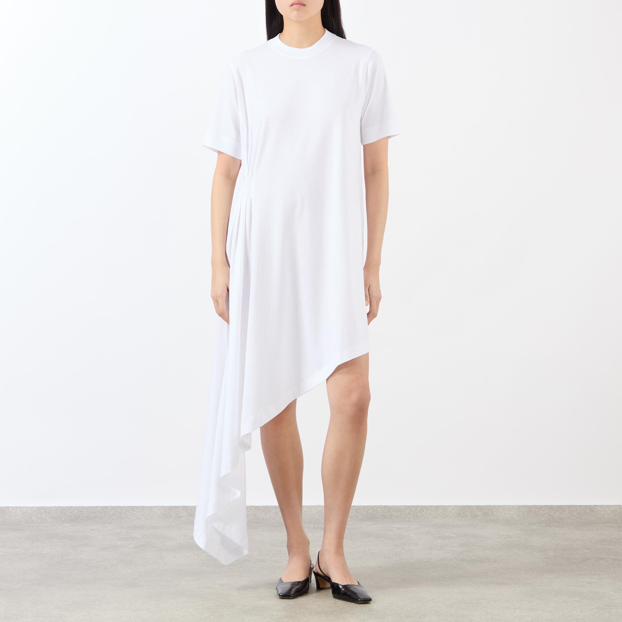 - Crew neck, short sleeves, asymmetric hem, pleated cut detailing, tonal stitching, A-line silhouette, soft-feel, smooth finish