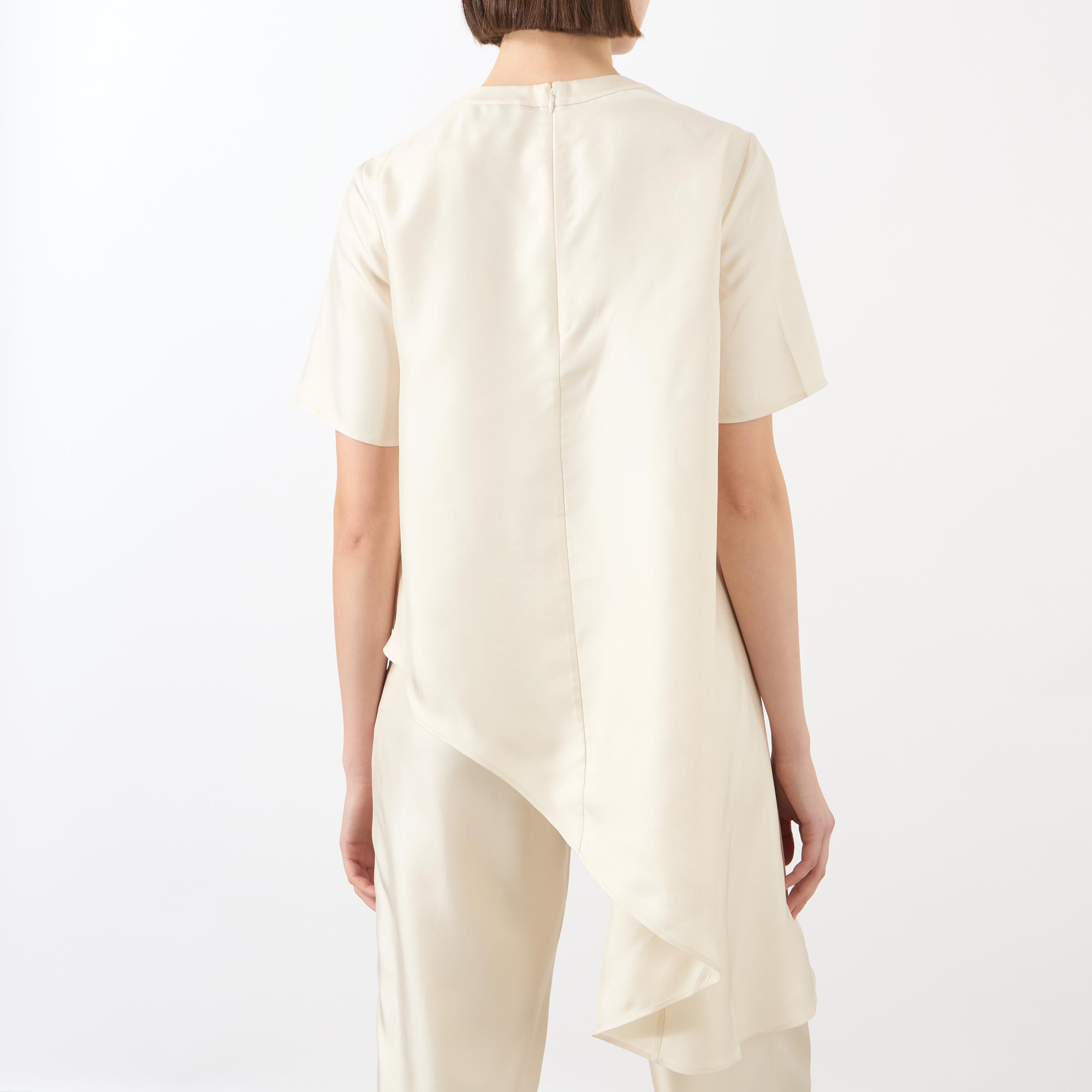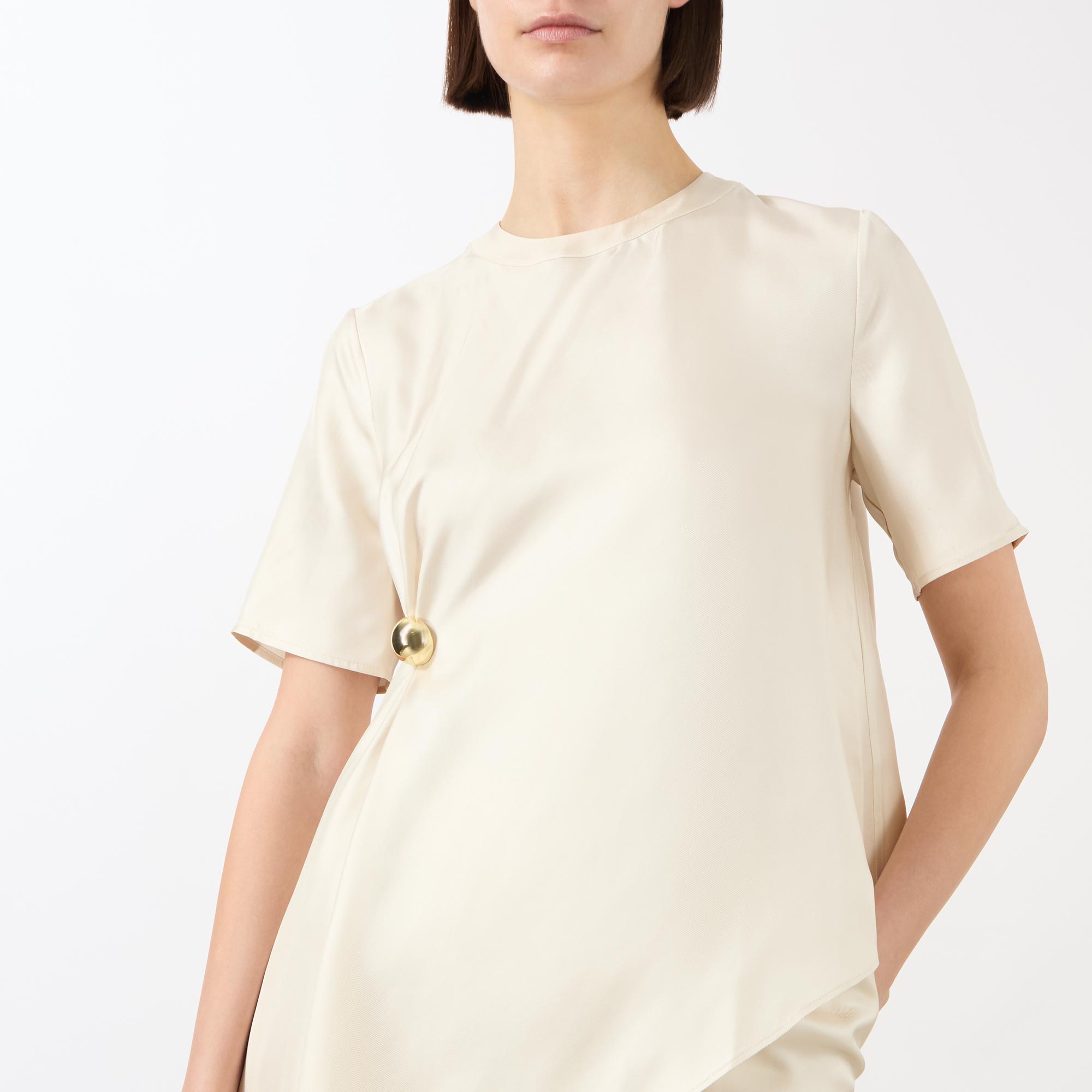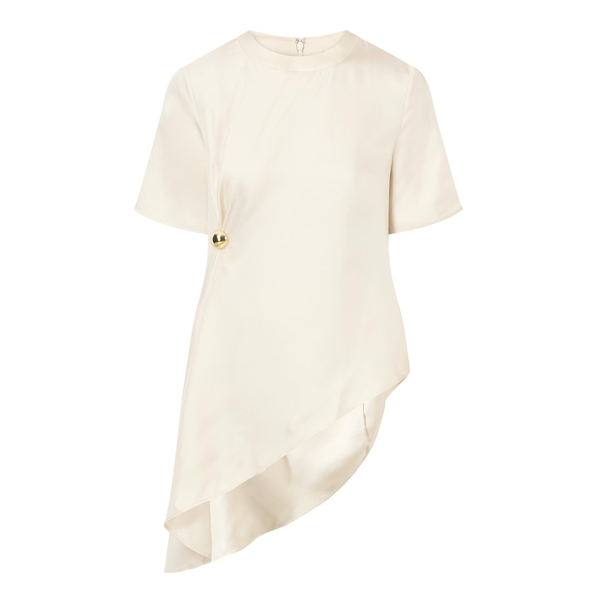 - Round neckline, short sleeves, asymmetric hemline, draped details, hardware embellishment, zip fastening to the back